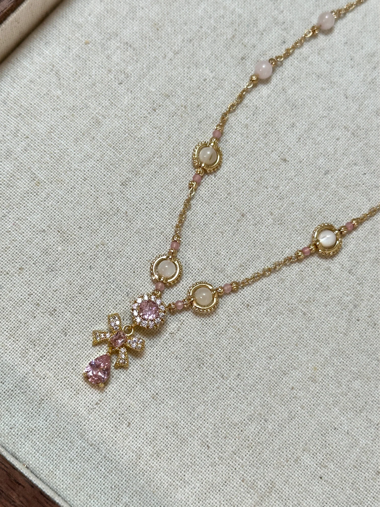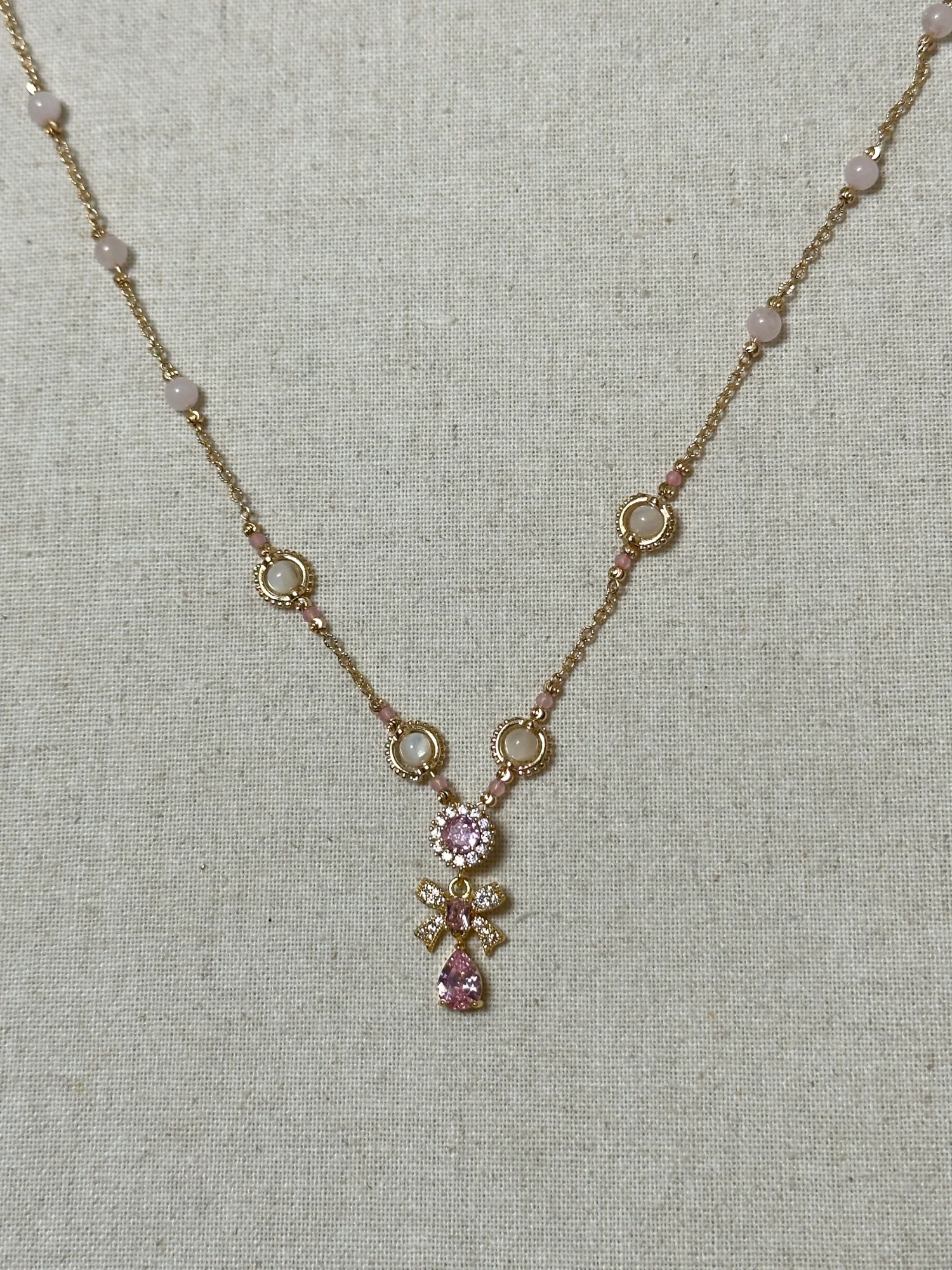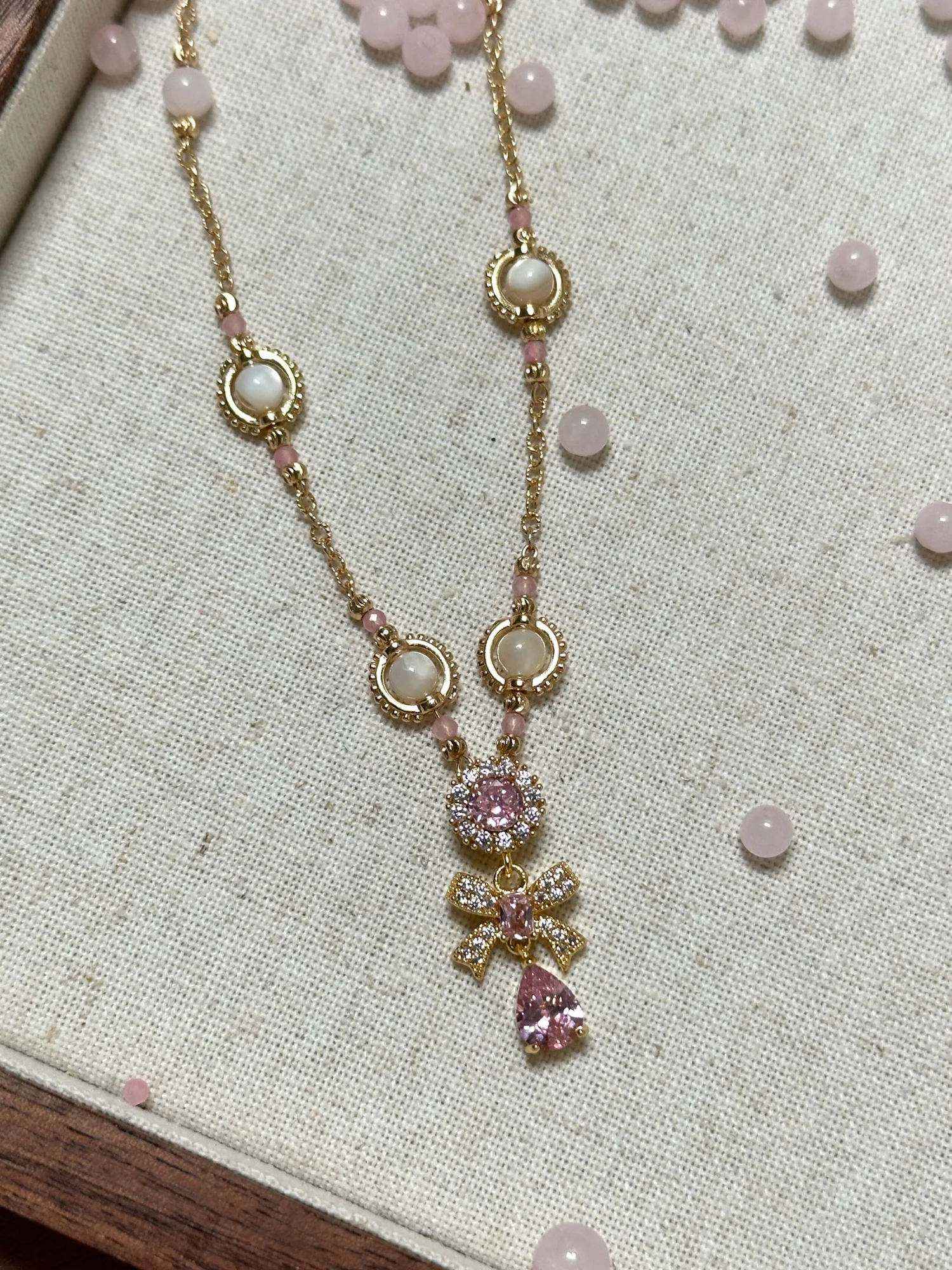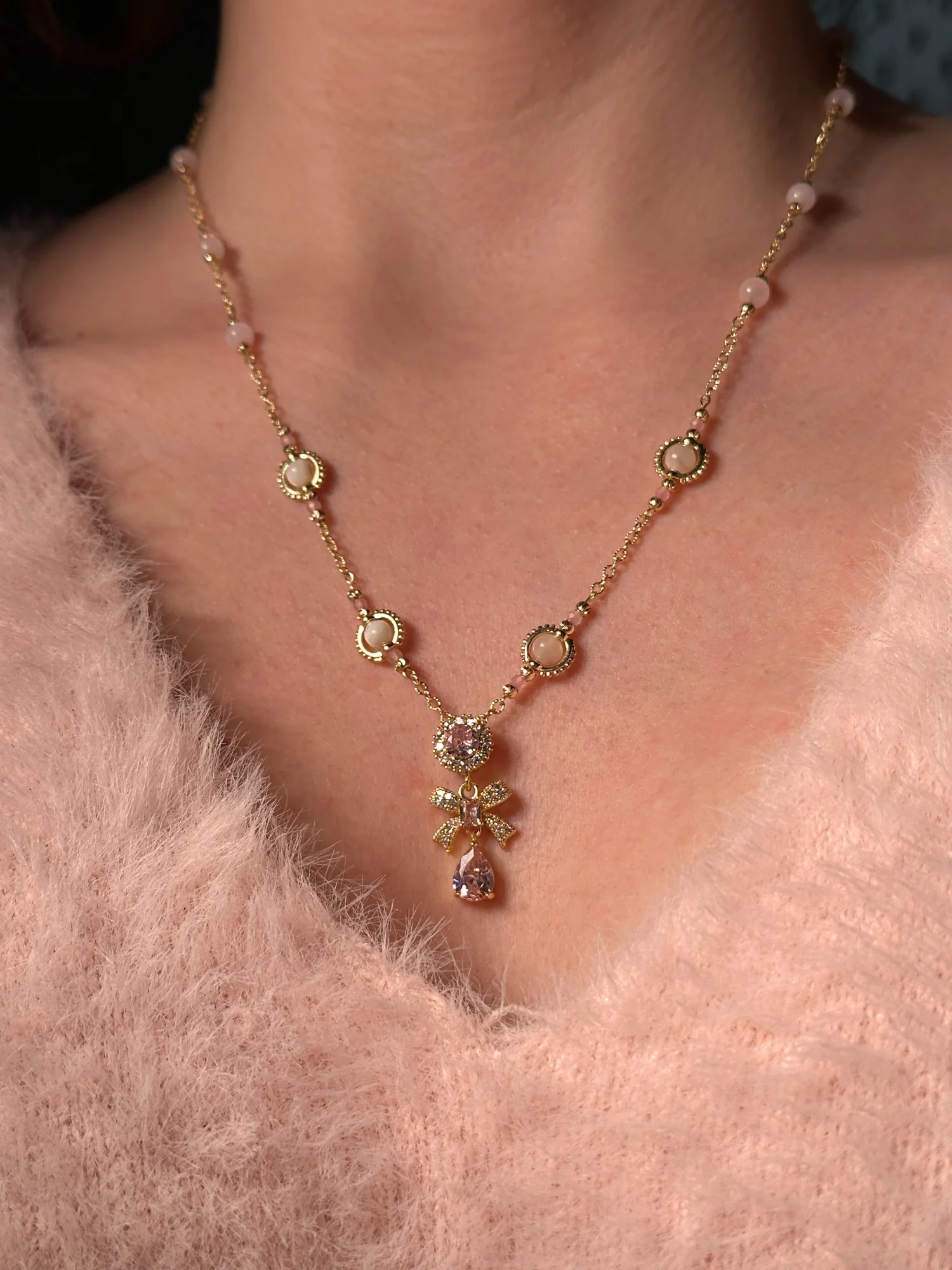 Bu zarif kolye, çiçek ve fiyonk formundaki pembe zirkon taşlı pendantı ile nostaljik bir zarafet ve peri masalı ışıltısı taşır. El işçiliğiyle hazırlanmış zincir üzerine dizilmiş pembe kuvars ve aytaşı boncuklar, tasarıma rüya gibi bir yumuşaklık kazandırır. Zincir boyunca yer alan küçük fasetli taşlar ise her harekette ışığı yakalayarak ince bir parıltı yaratır. Hem zarif hem de büyüleyici bir görünüme sahip bu parça, romantik stilin en sofistike halidir.