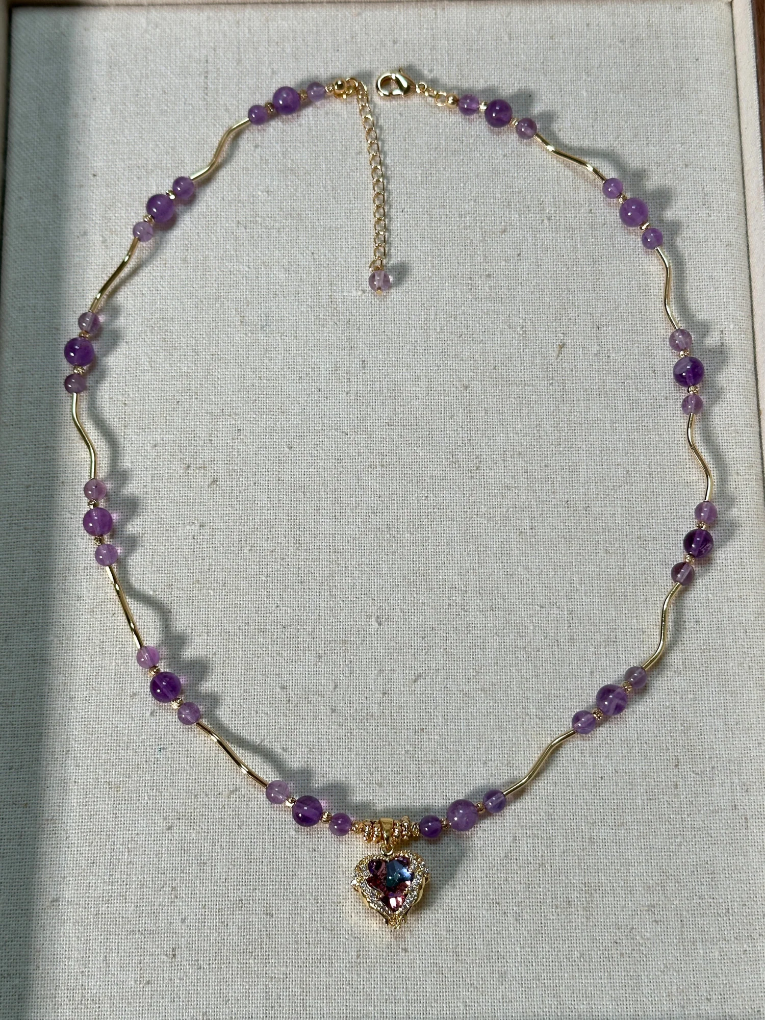 Kendinizi ametistin huzurlu parıltısına ve kalp şeklindeki charm’ın zamansız ışıltısına bırakın. Bu zarif kolye, yumuşak mor tonların romantizmini ve altın detayların sıcak ışıltısını bir araya getirir.