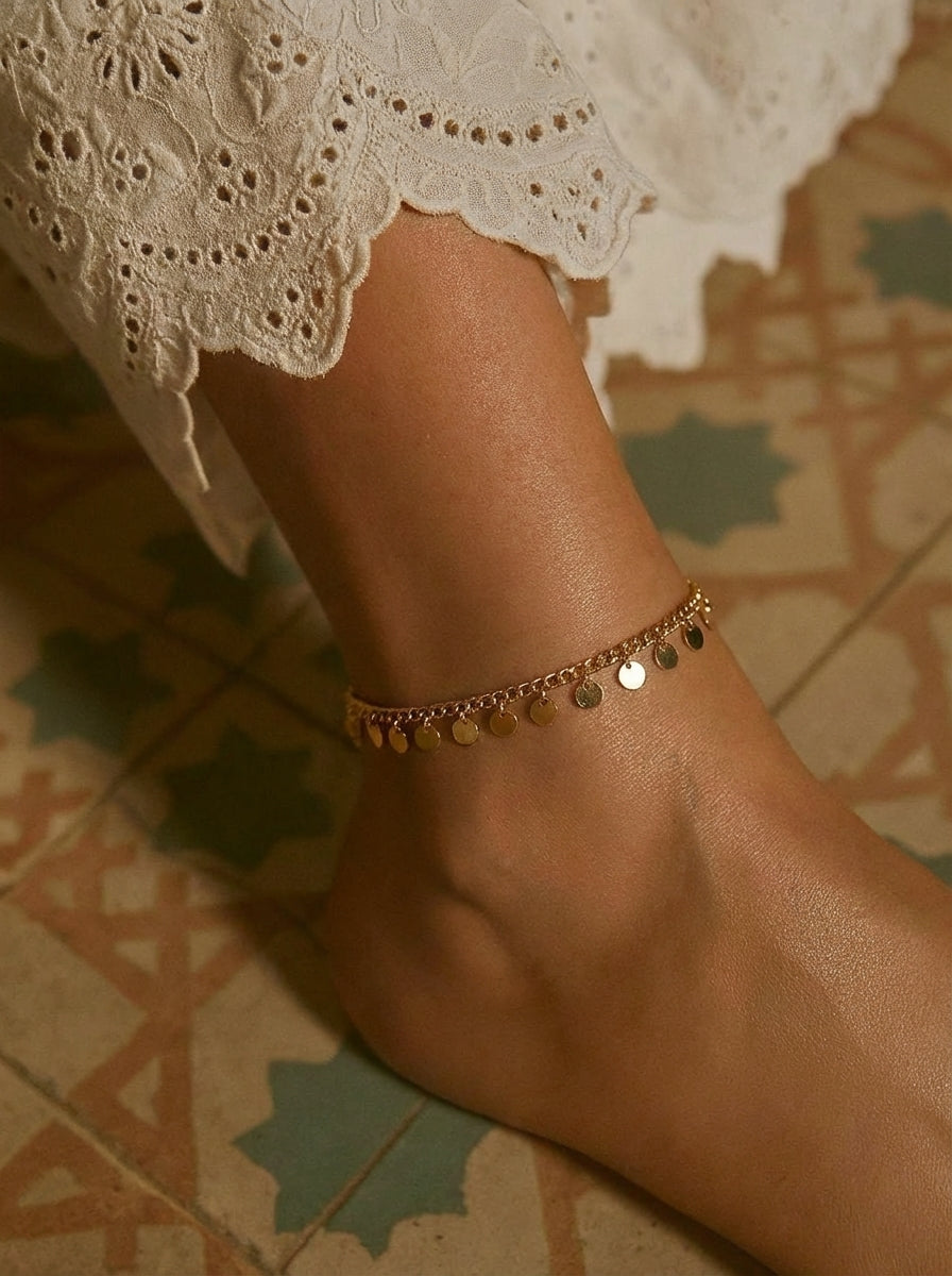 Işığı her adımda yakalayan Aurelia Coin Halhal, minik disk charm’ların ritmik hareketiyle bilekte ince ama dikkat çekici bir parıltı bırakır.