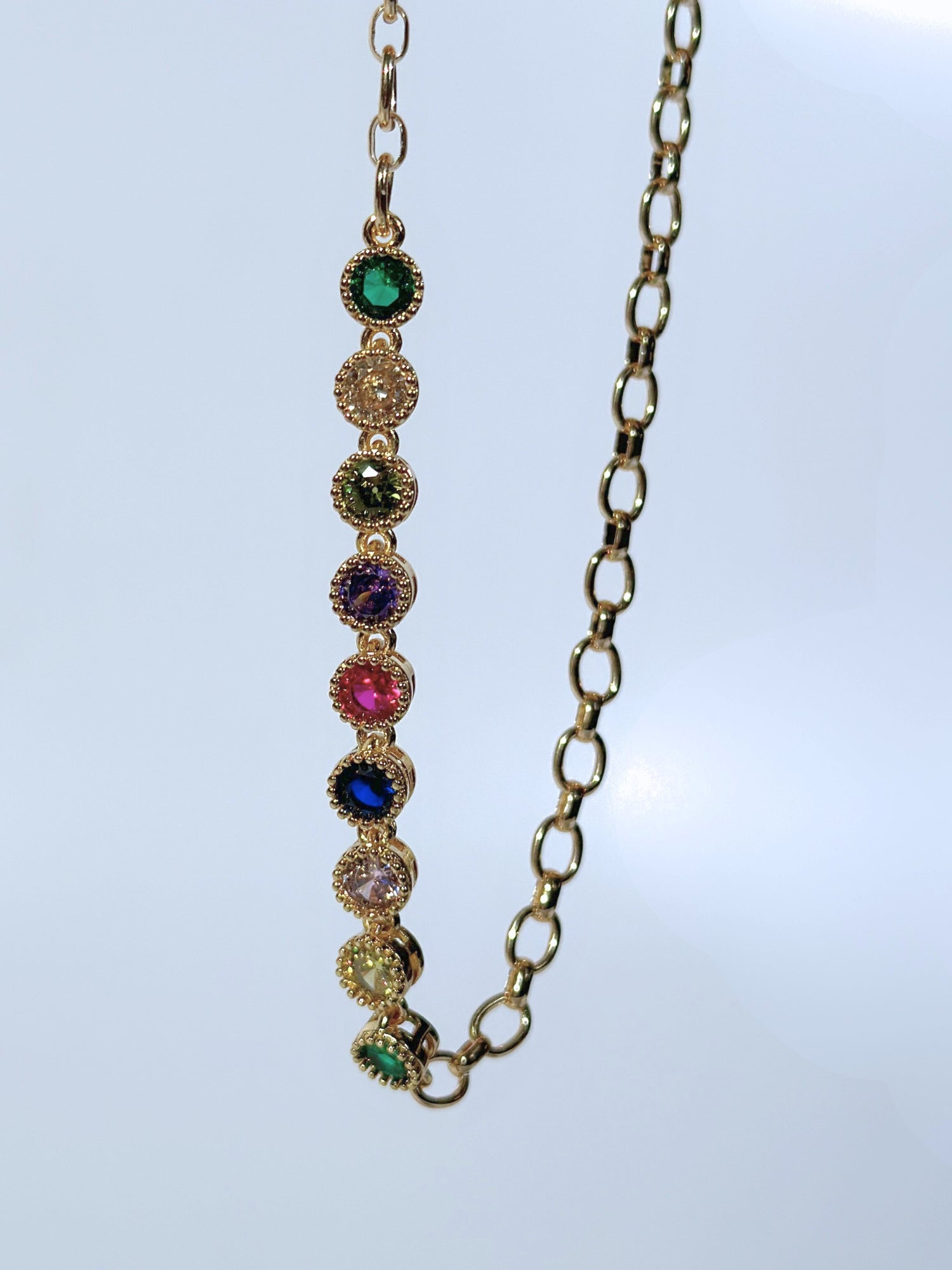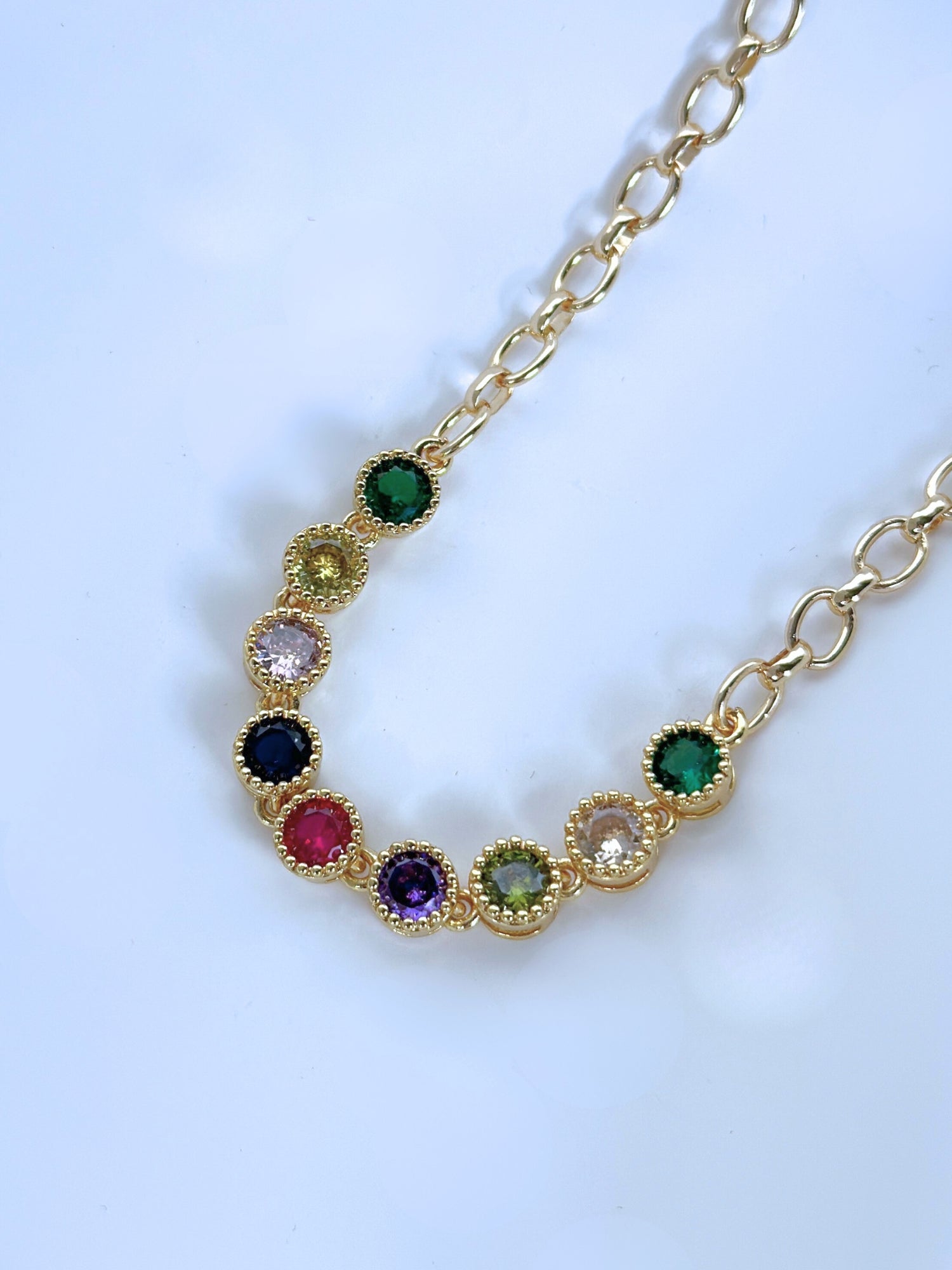 Renklerin büyüsünü zarafetle birleştiren Aurora Kolye, el işçiliğiyle tasarlanmış zarif bir parça olarak dikkat çeker. Her biri farklı enerjiyi temsil eden renkli kristal taşlar, ışıltılı 14 ayar gerçek altın kaplama zincir üzerinde zarif bir uyumla sıralanır. Günlük stilinize canlılık katmak veya özel anlarda göz alıcı bir detay eklemek için mükemmeldir.