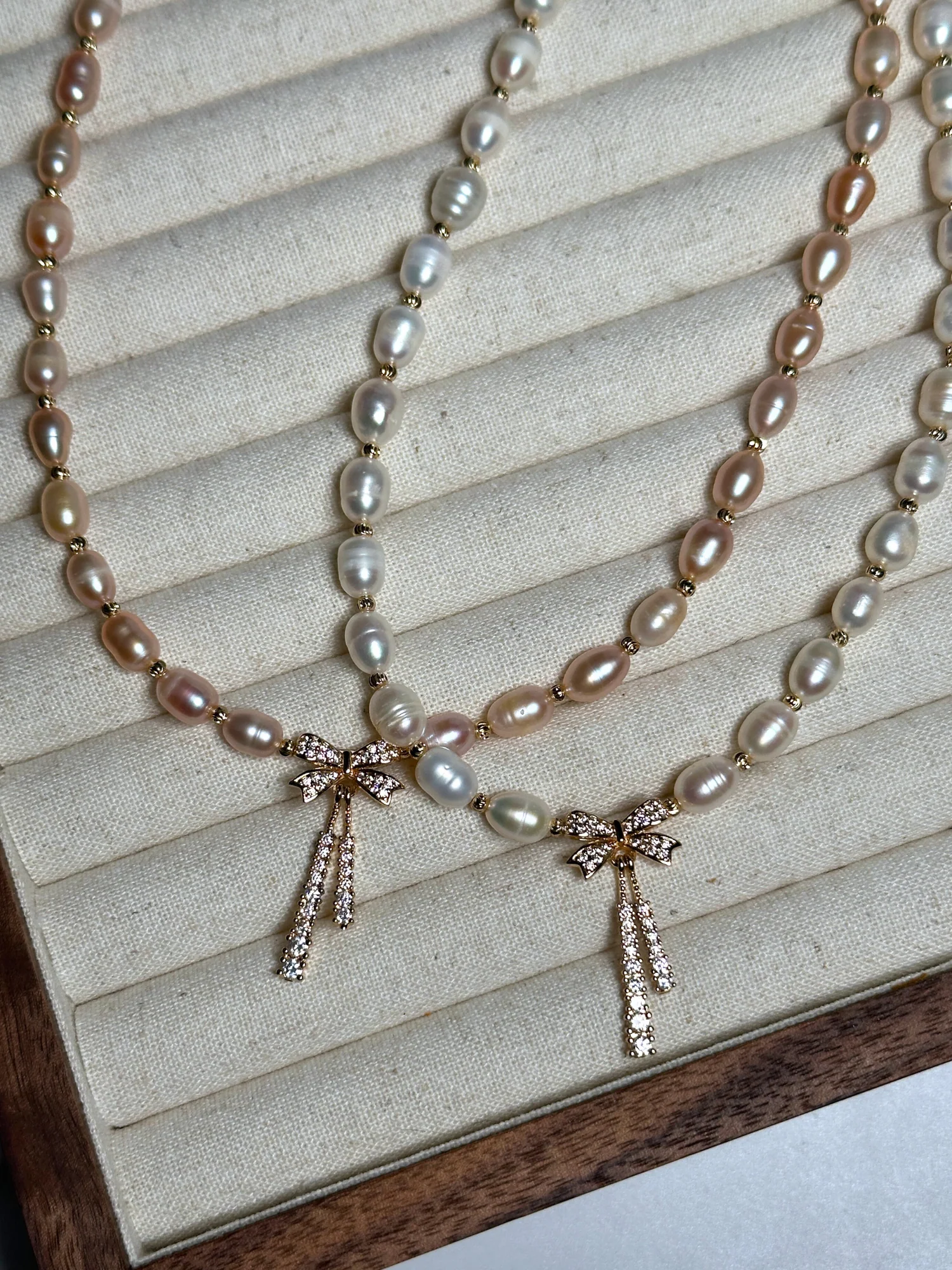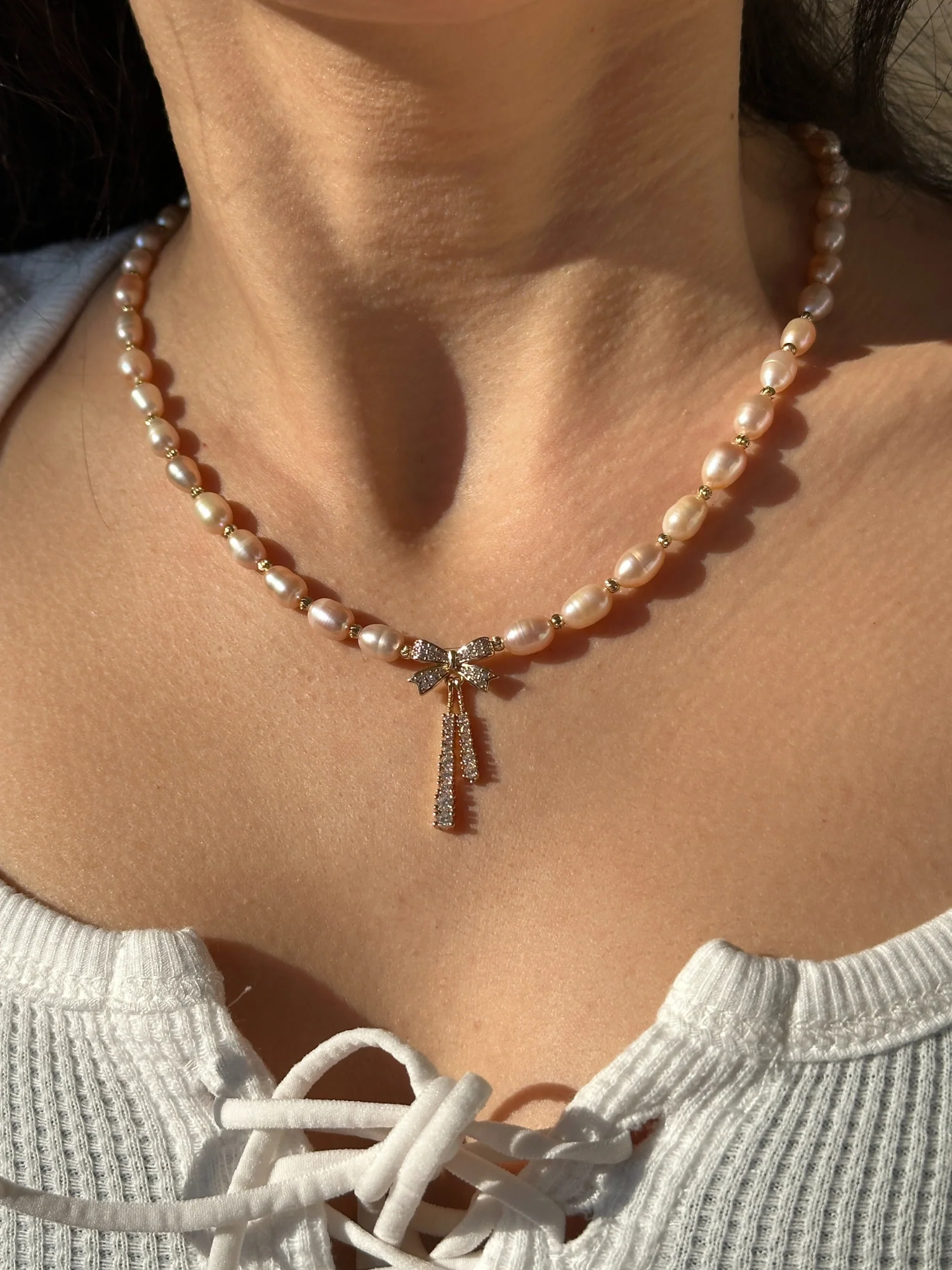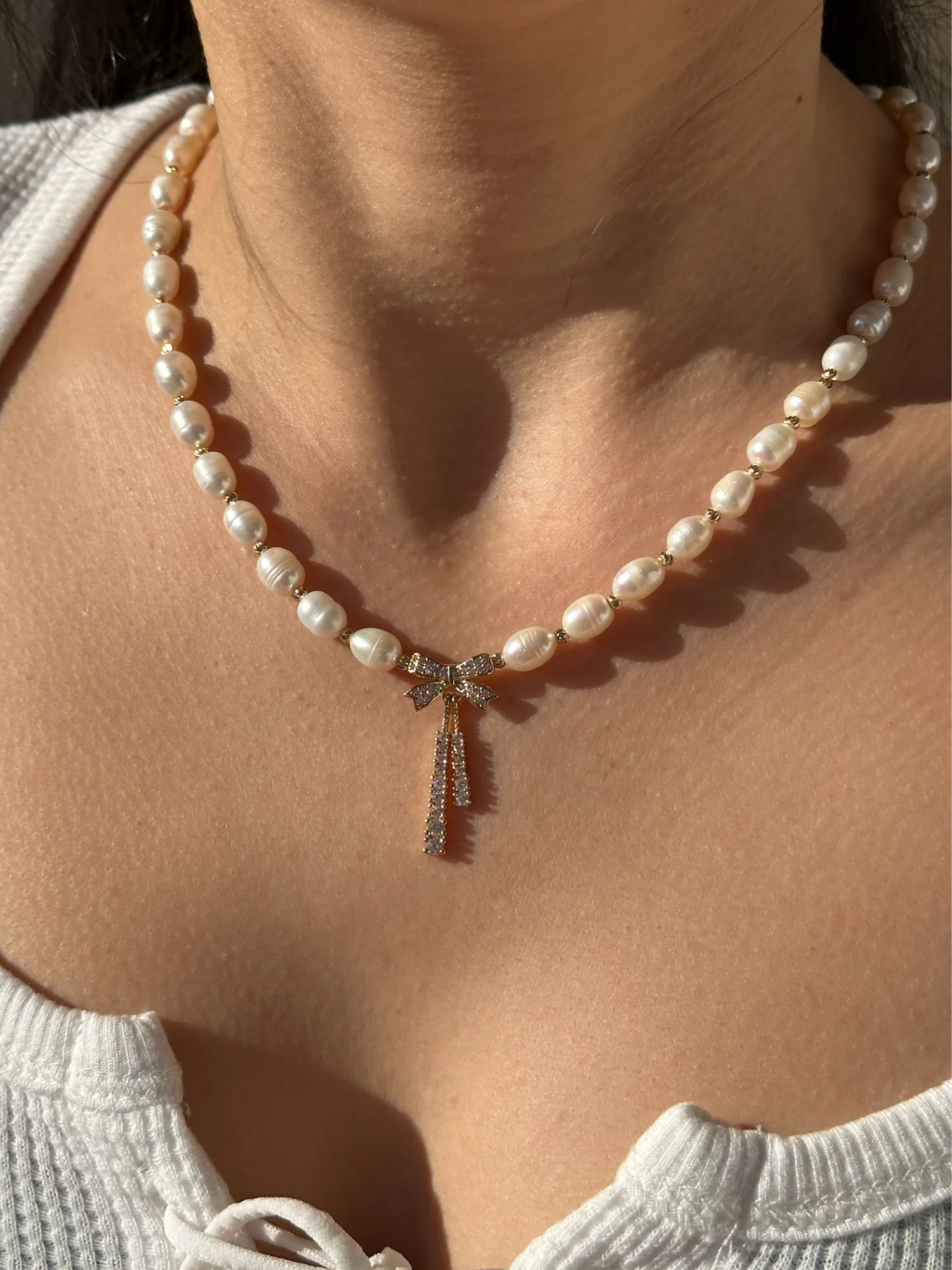 Ultra yüksek kalite tatlı su incilerinden özenle tasarlanan bu muhteşem kolye, göz alıcı zirkon kristal fiyonk ucu ile sofistike bir zarafet sunarken aynı zamanda eğlenceli bir dokunuş katıyor.