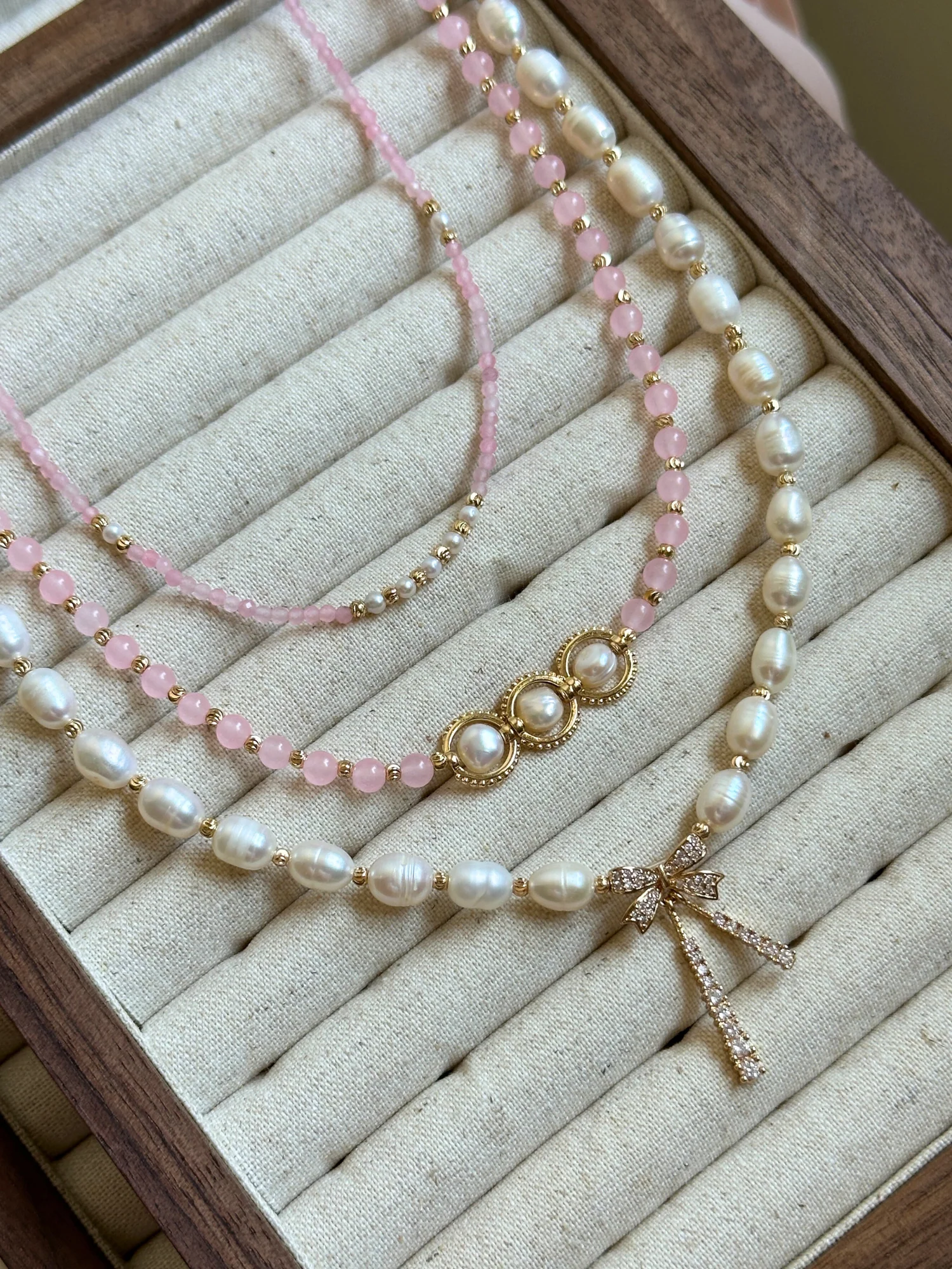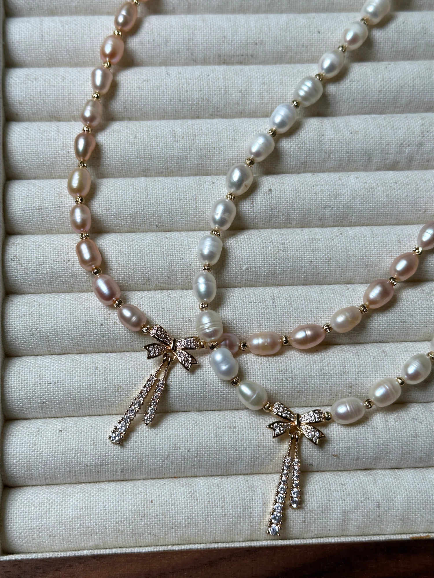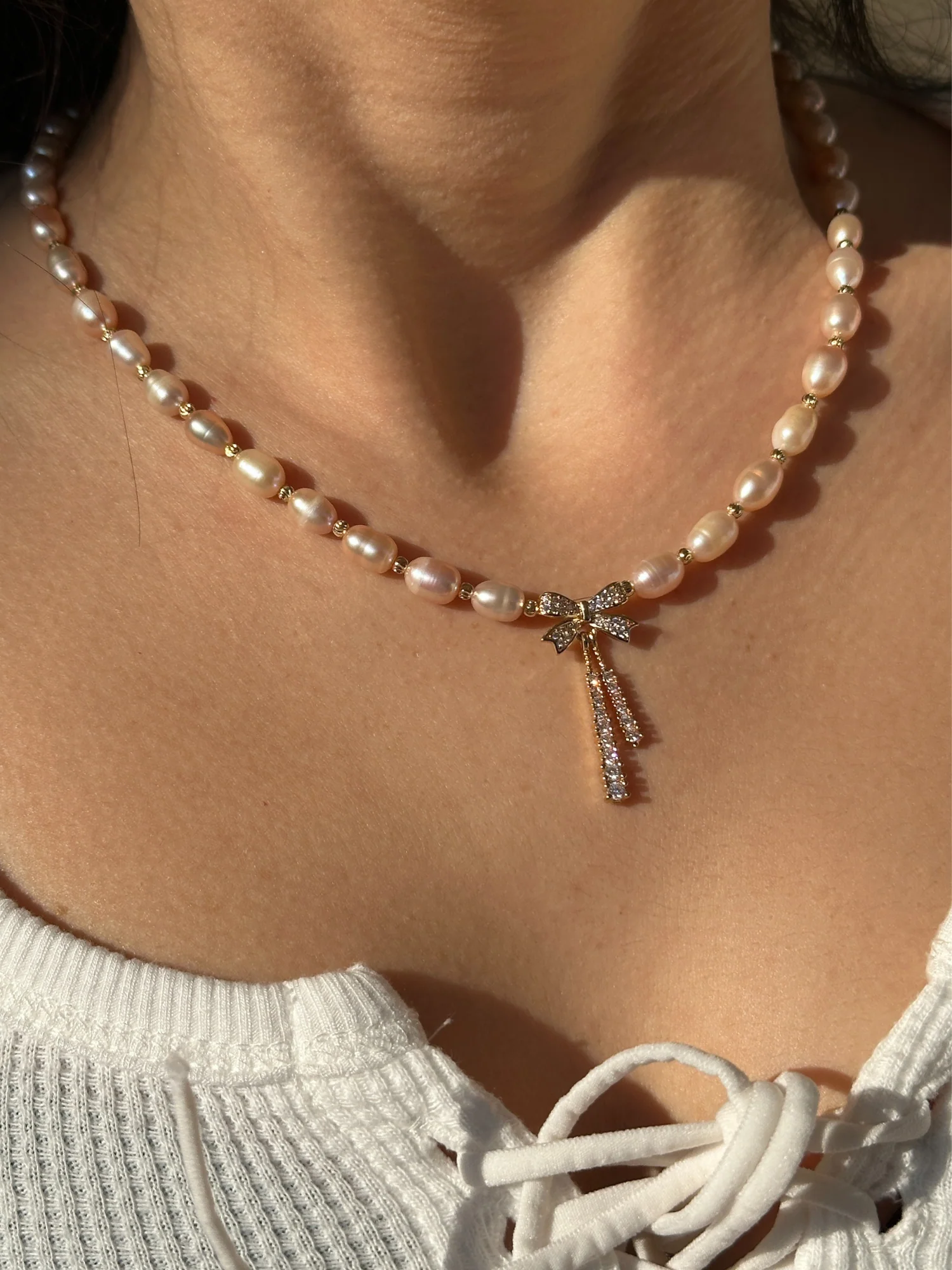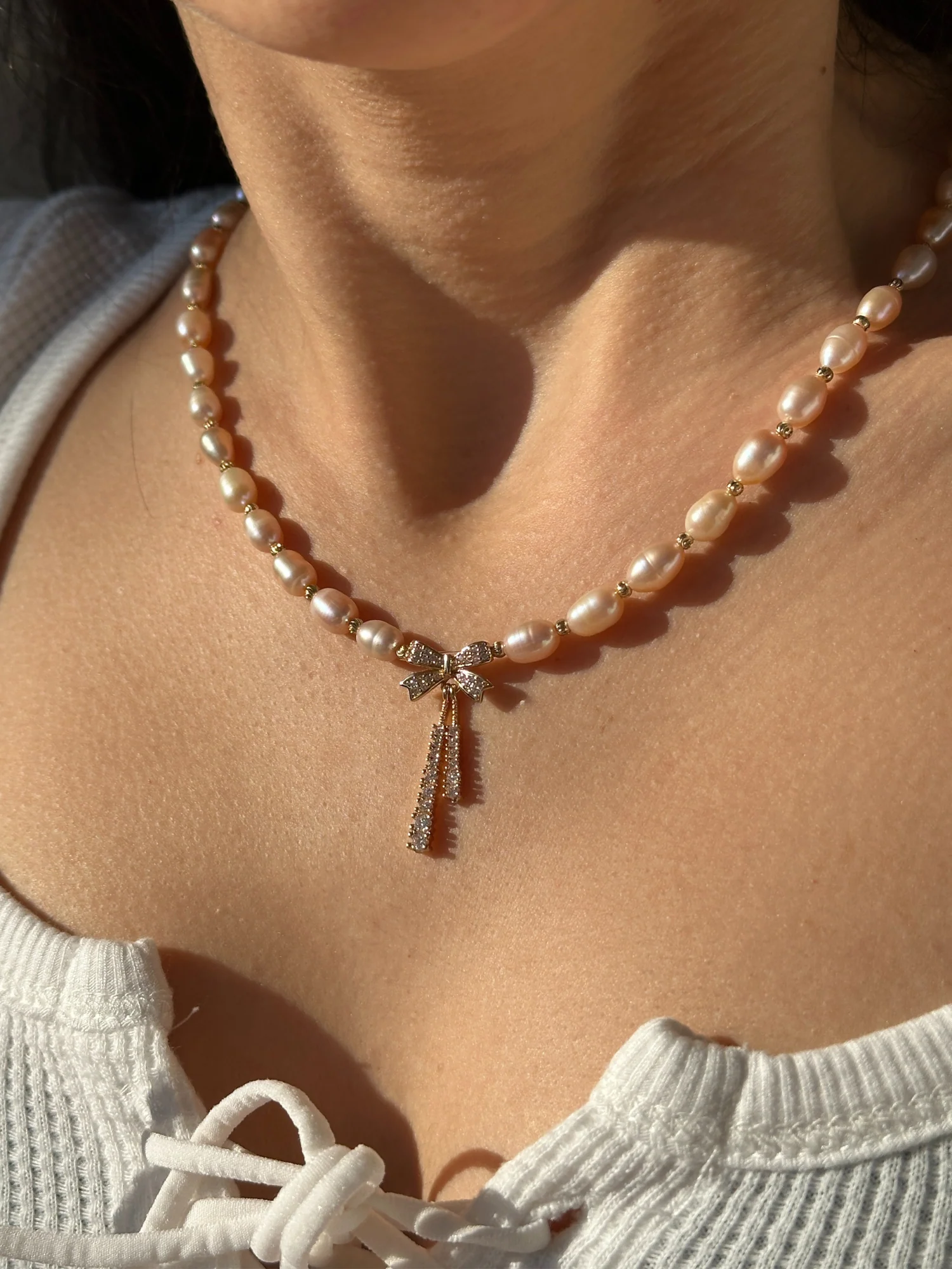 Ultra yüksek kalite tatlı su incilerinden özenle tasarlanan bu muhteşem kolye, göz alıcı zirkon kristal fiyonk ucu ile sofistike bir zarafet sunarken aynı zamanda eğlenceli bir dokunuş katıyor.