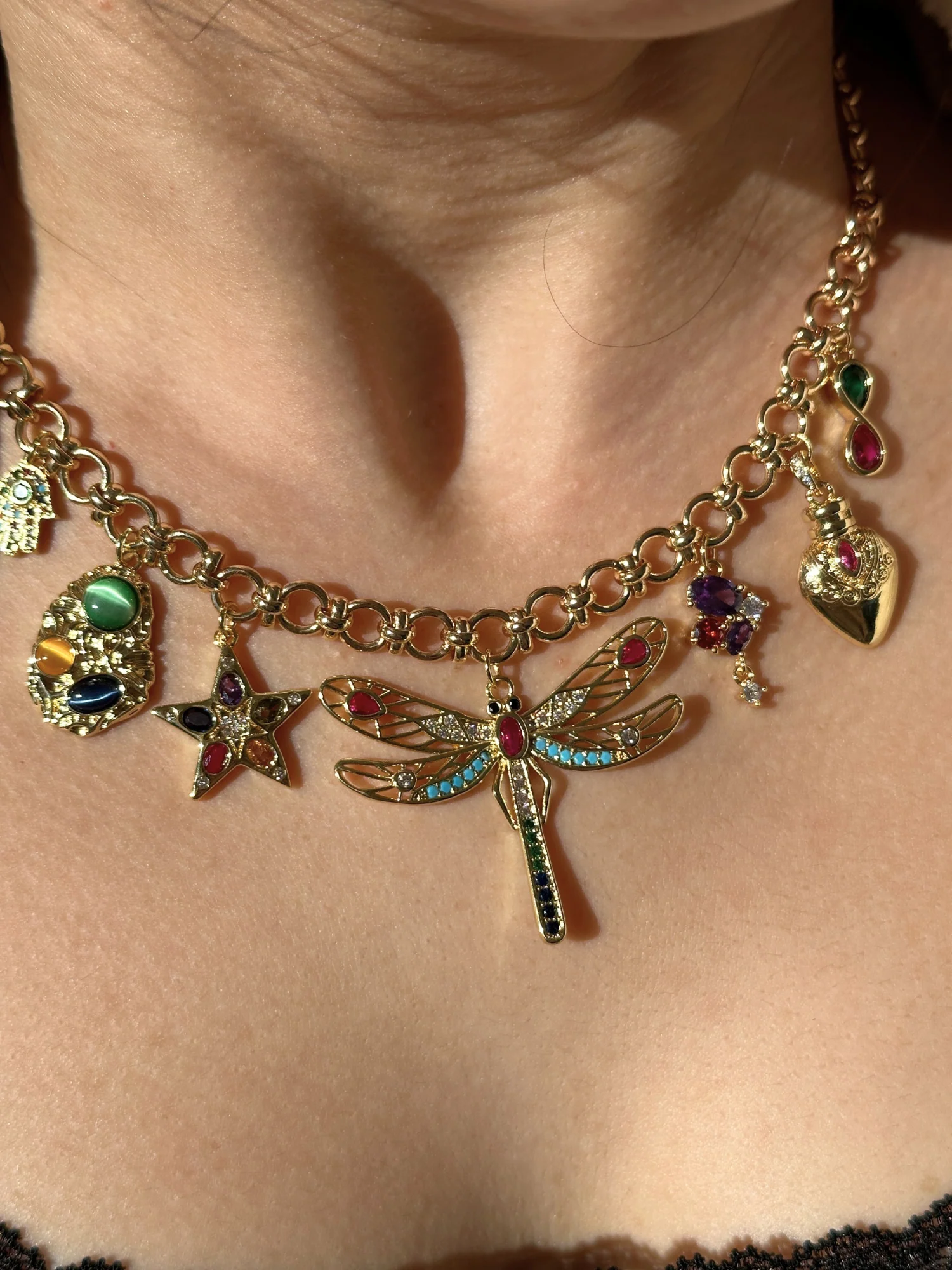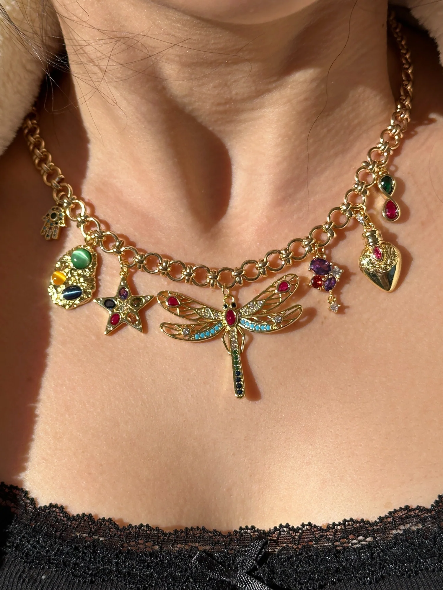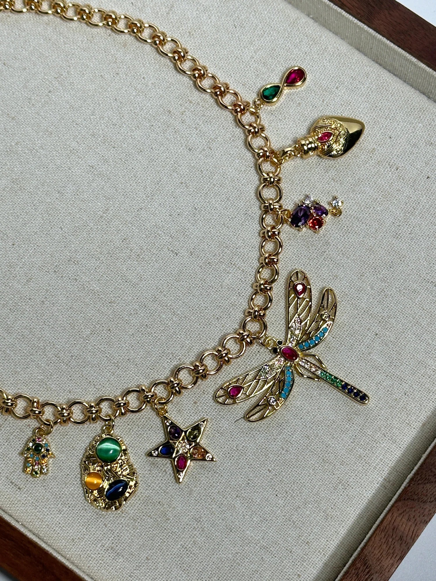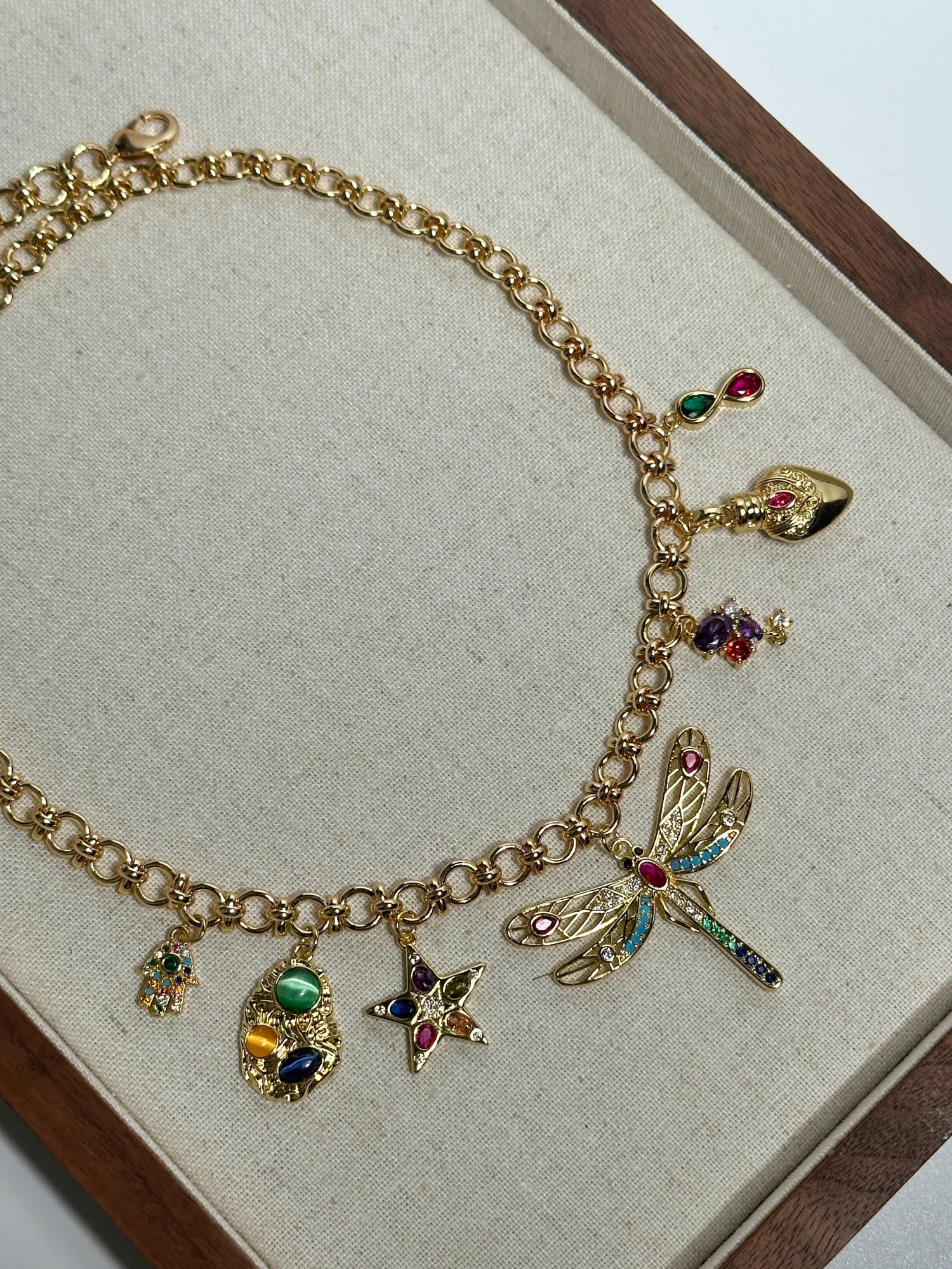 Beverly Charm Necklace, her detayıyla dikkat çeken gerçek bir statement parça. Lüks gold-filled zinciri üzerinde yer alan ejderha sineği, göksel yıldız ve renkli taşlarla bezeli özgün charm’lar; kolyeye hikâyesi olan, büyüleyici bir karakter kazandırıyor. 17 inç ayarlanabilir uzunluğu ve konforlu yapısıyla, ister gündüz ister gece stilinizi tek dokunuşla yükselten iddialı bir aksesuar.