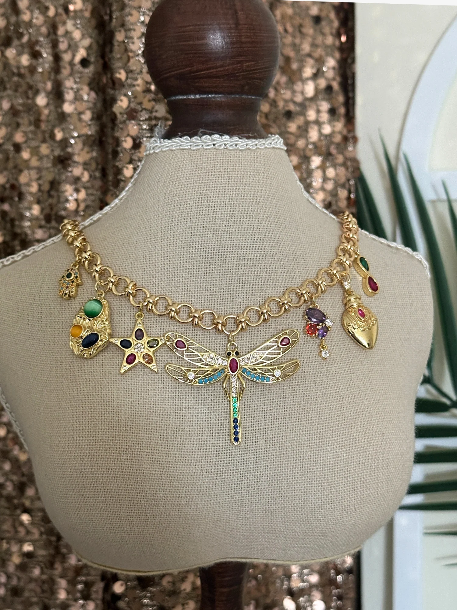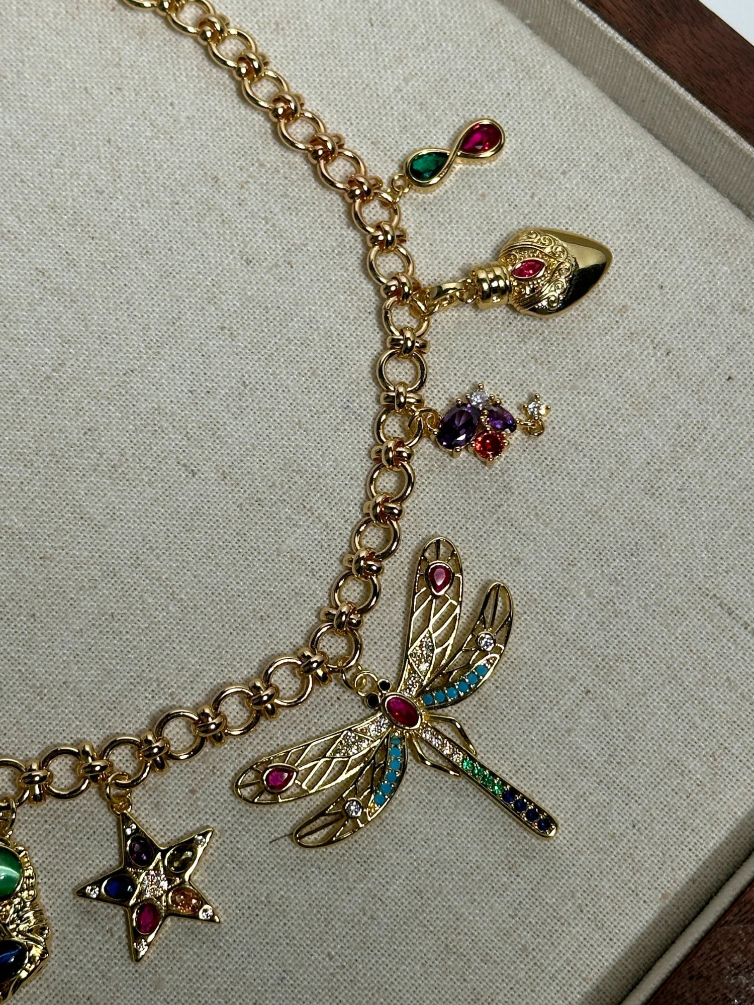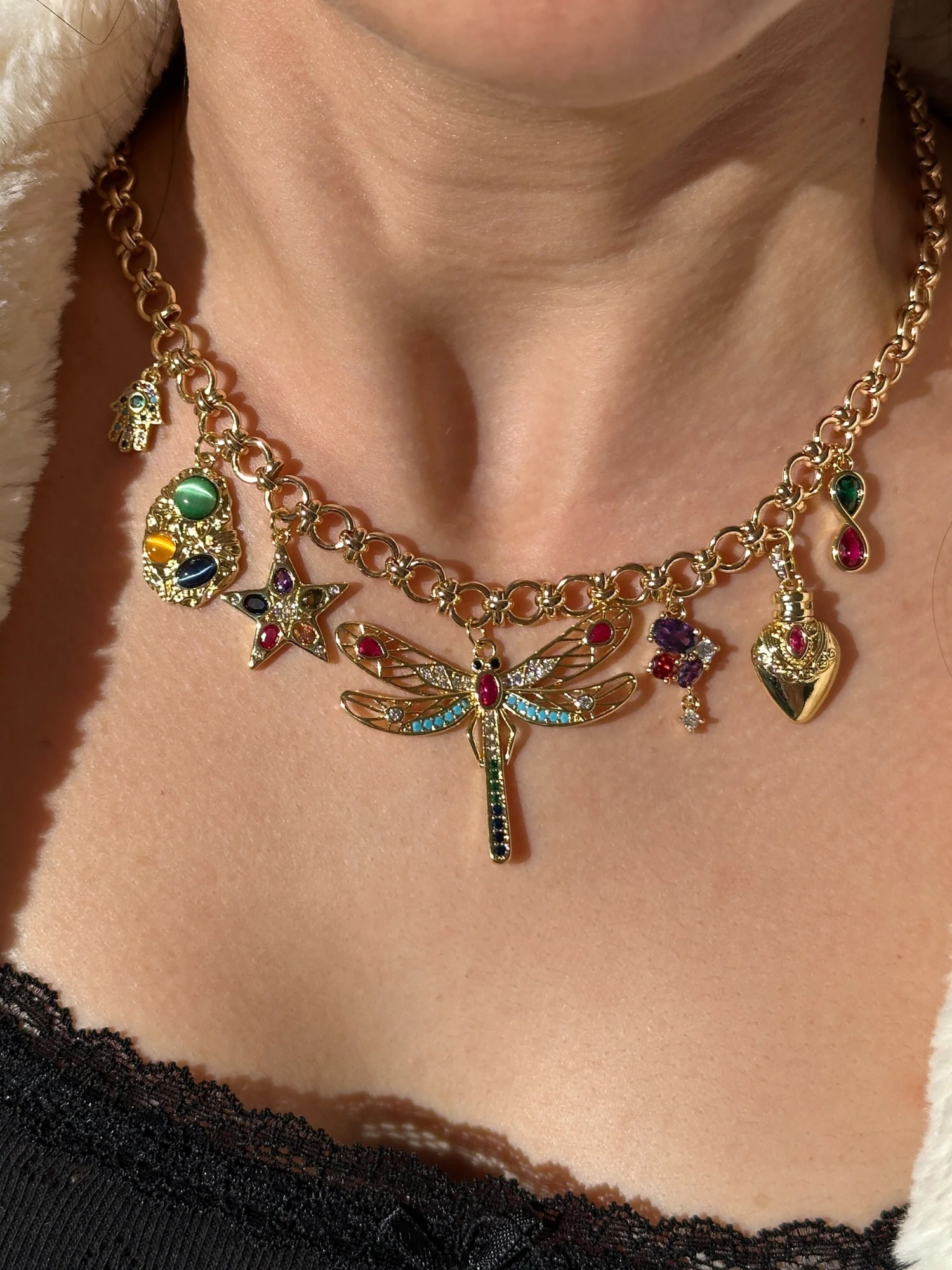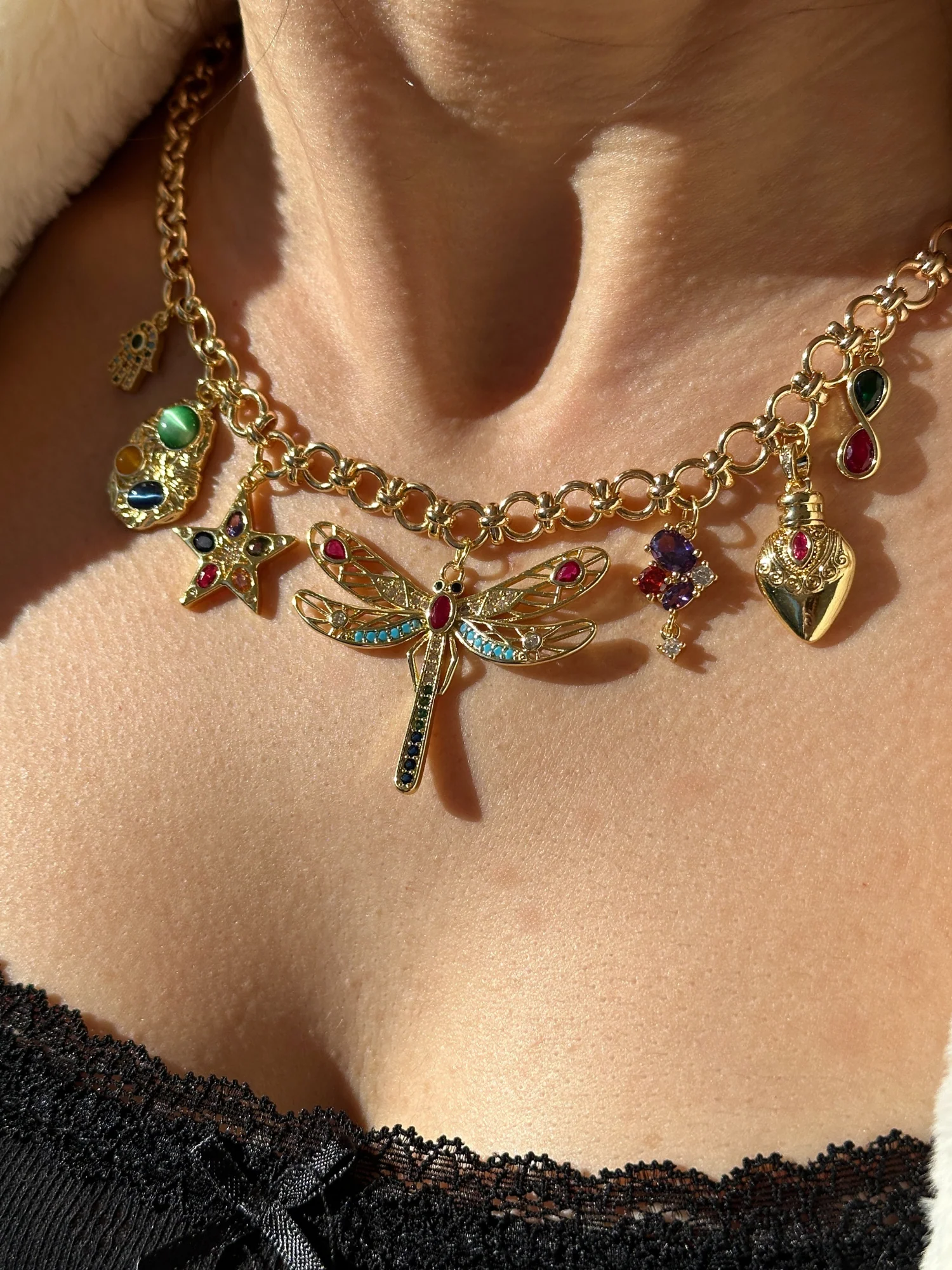 Beverly Charm Necklace, her detayıyla dikkat çeken gerçek bir statement parça. Lüks gold-filled zinciri üzerinde yer alan ejderha sineği, göksel yıldız ve renkli taşlarla bezeli özgün charm’lar; kolyeye hikâyesi olan, büyüleyici bir karakter kazandırıyor. 17 inç ayarlanabilir uzunluğu ve konforlu yapısıyla, ister gündüz ister gece stilinizi tek dokunuşla yükselten iddialı bir aksesuar.