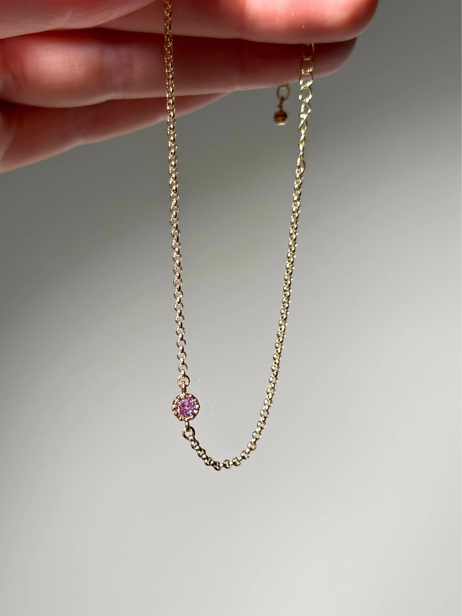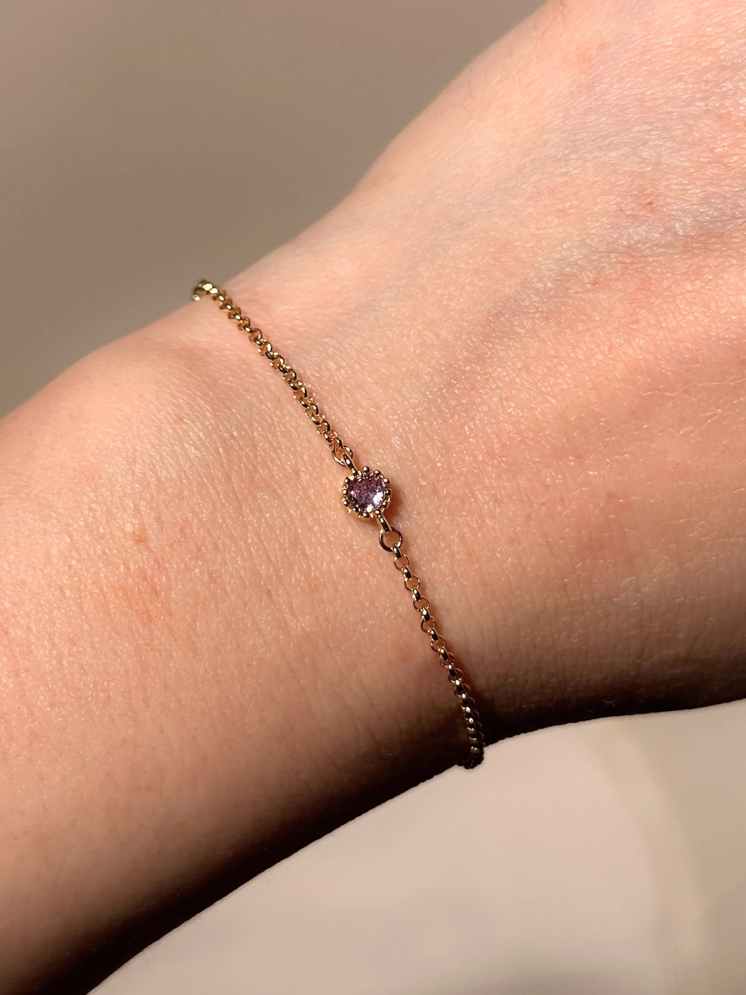 Hafif mor tonlu bir kristal taşın zarif parıltısını taşıyan bu ince zincir bileklik, her hareketinizde ışığı nazikçe yansıtır. 14k gerçek altın kaplama zincir üzerine yerleştirilen mini lila renkli zirkon taş, minimalizmin büyüsünü ve zarafetin gücünü bir araya getirir. Tek başına zarif bir dokunuş ya da diğer bilekliklerle katmanlı kullanım için mükemmeldir. Solmayan kaplaması ve ayarlanabilir uzunluğu, uzun ömürlü bir ışıltı ve kusursuz konfor sunar.