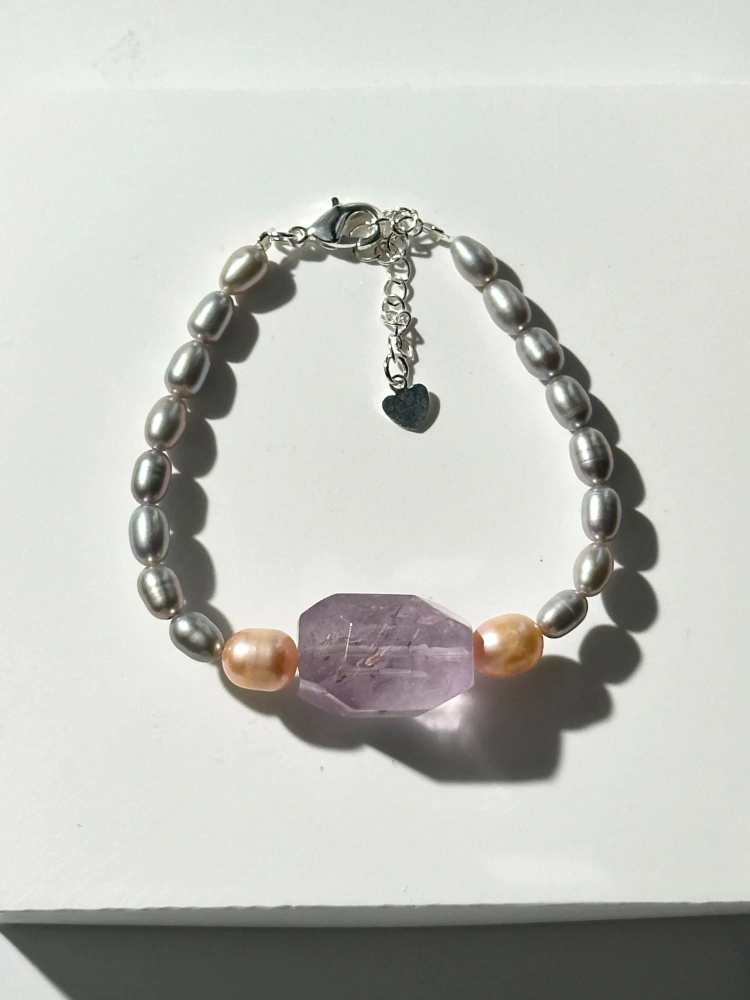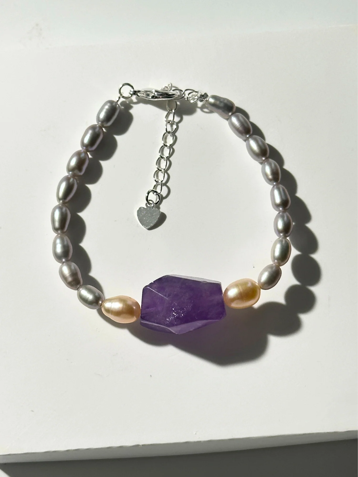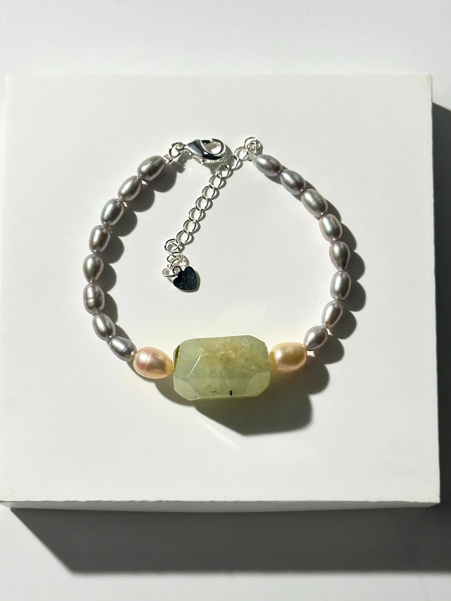 Zarafet ve doğallığın büyüleyici birleşimi: Celeste Bileklik, sofistike çizgilerle toprak tonlarının sıcak enerjisini buluşturur. Merkezinde yer alan büyük elmas kesim doğal taş, her bilekliğe karakter ve ışıltı kazandırır. Çevresinde dizilen AAA kalite 6 mm gri tatlı su incileri ve krem tonlu mini inciler, tasarıma yumuşak bir parlaklık ve lüks bir denge katar.
