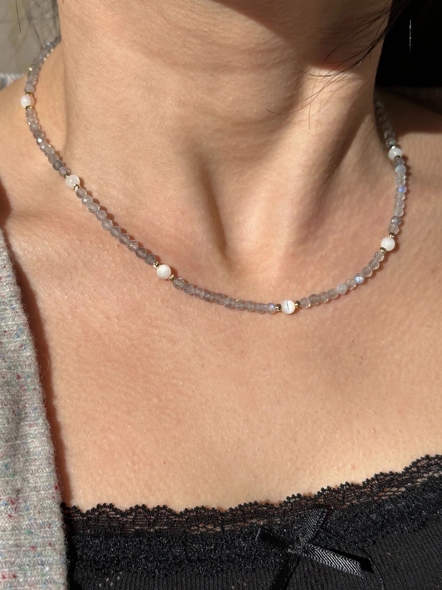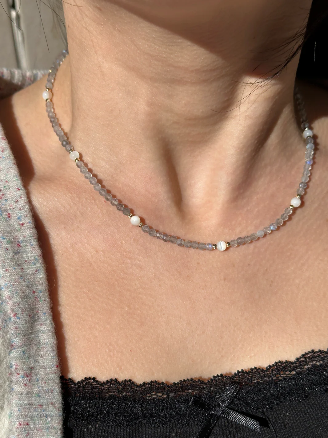 Elia Labradorit & Aytaşı Kolye, doğal taşların mistik ışıltısını ince ve zamansız bir tasarımda buluşturuyor. 3 mm elmas kesim labradorit taşları, hareket ettikçe ışığı yakalayan gökkuşağımsı bir parıltı sunarken; 4 mm yuvarlak aytaşı boncuklar, ay ışığı gibi yumuşak ve rüya gibi bir glow yaratıyor. Aralara serpiştirilen gold-filled dokulu mini boncuklar ise tasarıma sıcak, lüks bir dokunuş katıyor. Güvenli klipsi ve ayarlanabilir 16 + 2 inç uzunluğuyla hem tek başına hem de katmanlı kullanımda günlük şıklığınıza zarif bir yükseliş kazandırıyor. Solmayan yapısı sayesinde Elia, uzun yıllar severek takacağınız “imza” parçanız olmaya aday.
