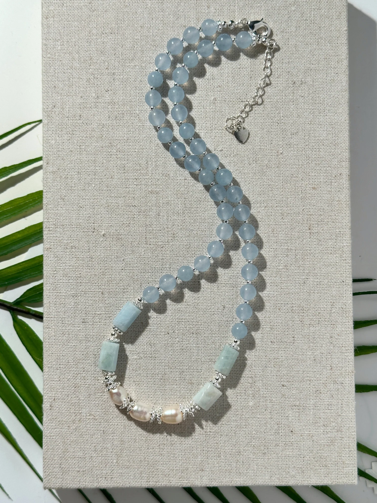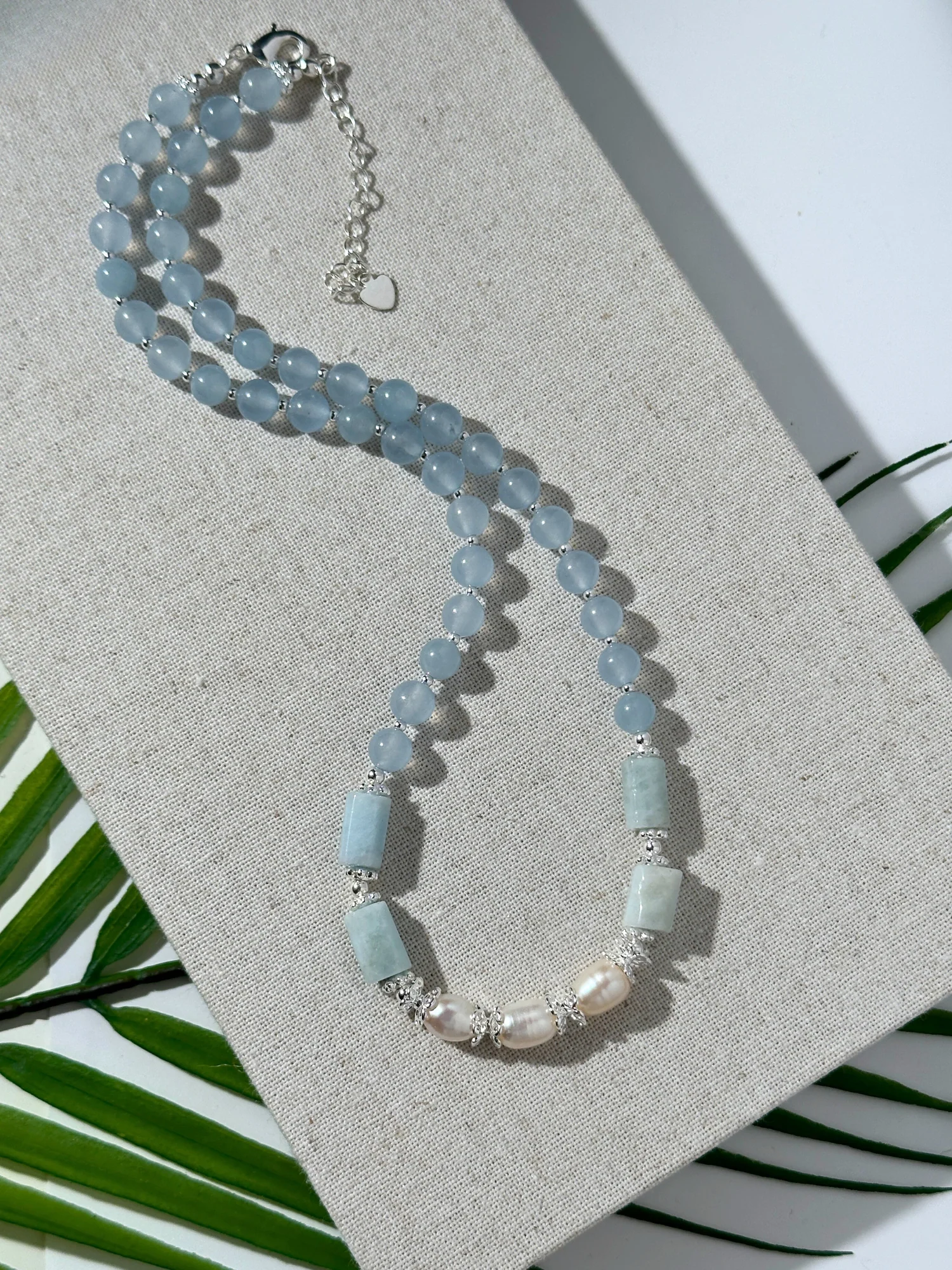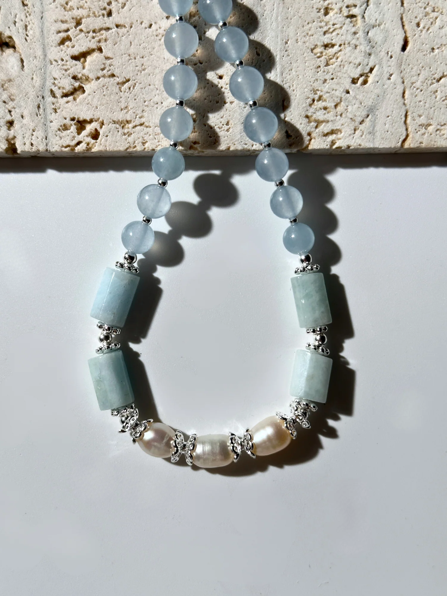 Okyanus sularının huzurunu ve berraklığını yansıtan Essie İnci Detaylı Akuamarin Kolye, doğanın en dingin tonlarını taşır. Zarif dikdörtgen kesim akuamarin taşları, parlak yüksek kalite tatlı su incileri ve pürüzsüz mavi kalsedon boncuklar ile el işçiliğiyle hazırlanmıştır. Parlak gümüş kaplama titanyum çelik detaylar ve güvenli kanca kapama ile tamamlanan bu tasarım, hem günlük kombinleri hem de özel davet stillerini zarafetle yükseltir.