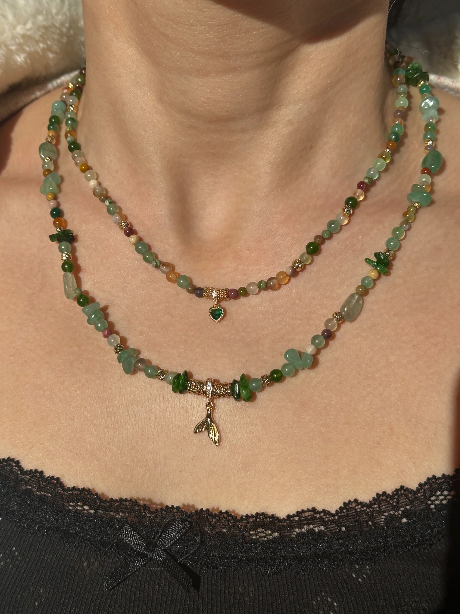 Gaia Layered Gemstone Necklace Set, toprak tonlarının güzelliğini kutlayan, bohem esintili iki parçalı özel bir tasarım setidir. El yapımı bu modelde zümrüt, aventurin, peridot, kalsedon ve rutilated kuvars gibi zengin doğal taşlar bir araya gelerek uyum, denge ve “topraklanma” hissi verir.