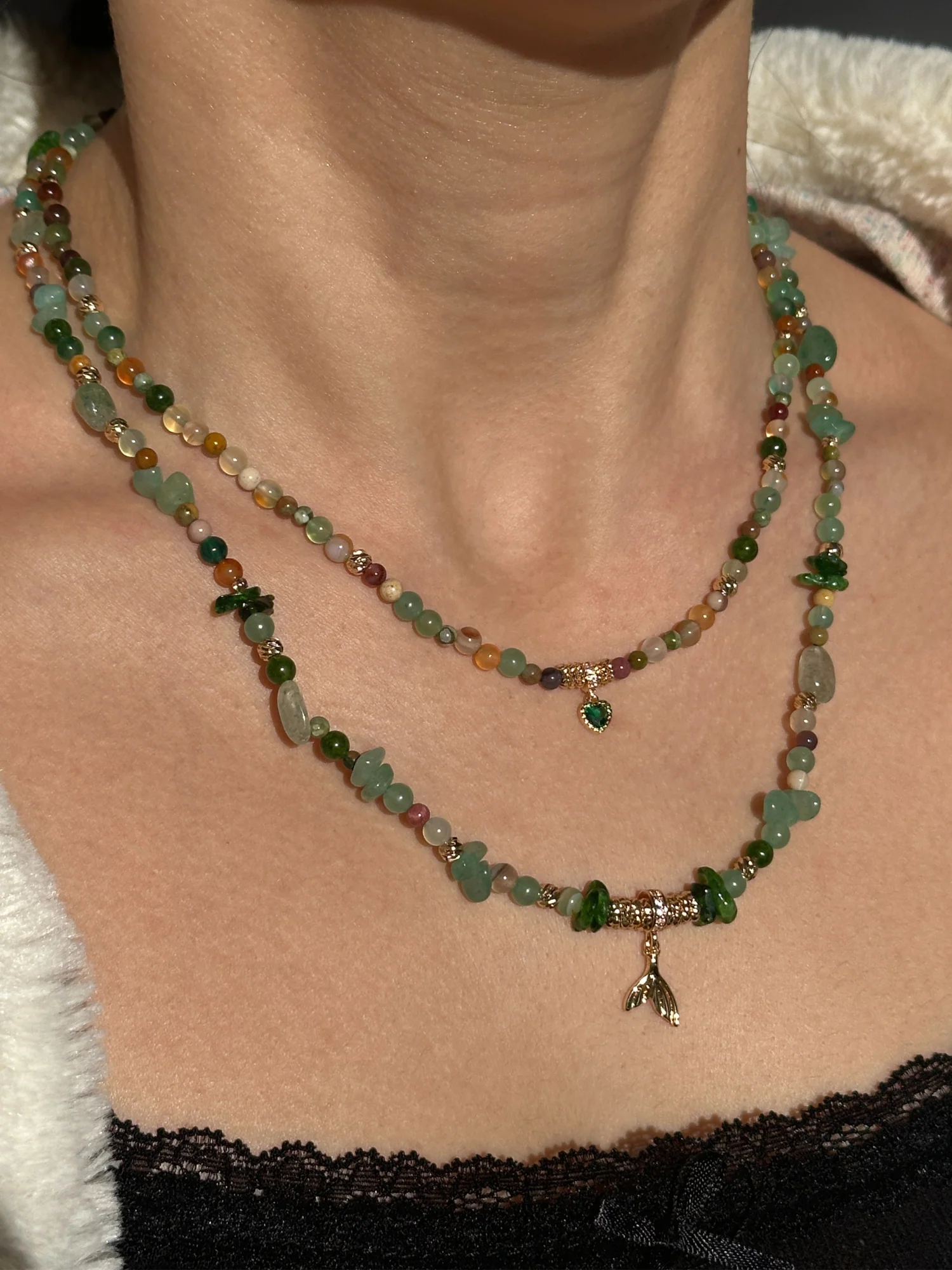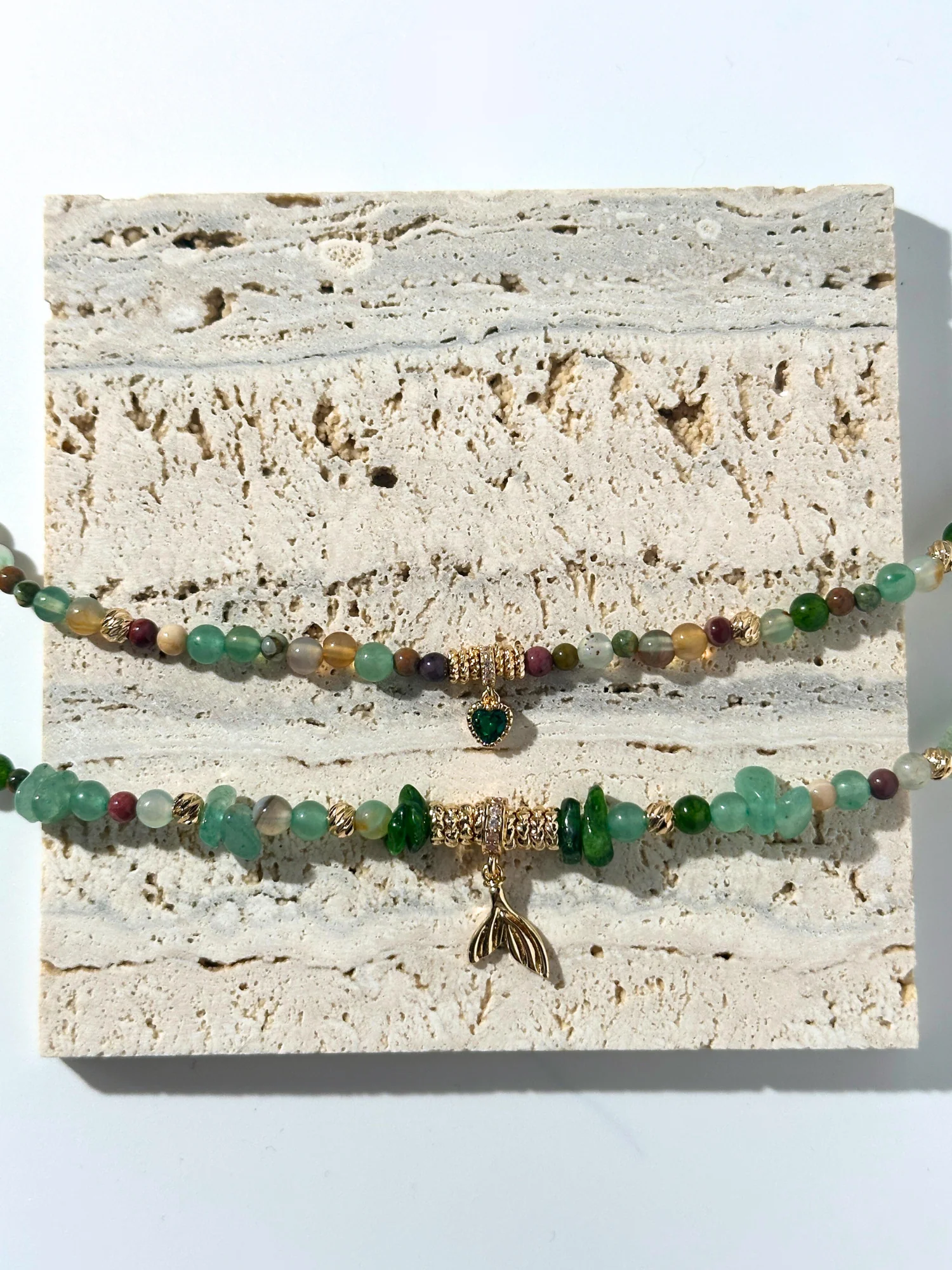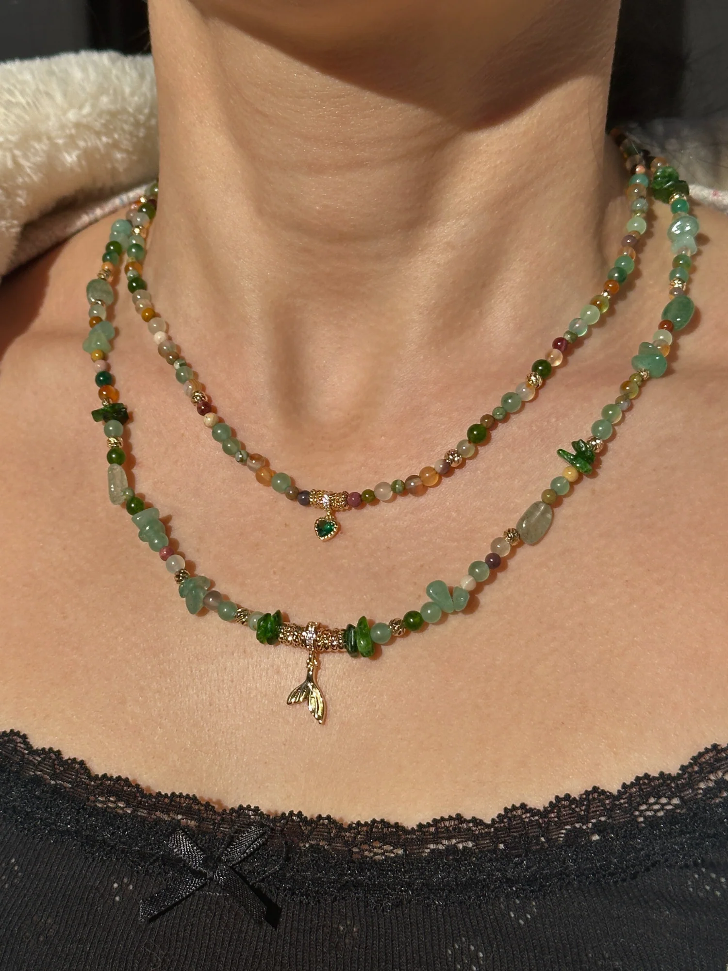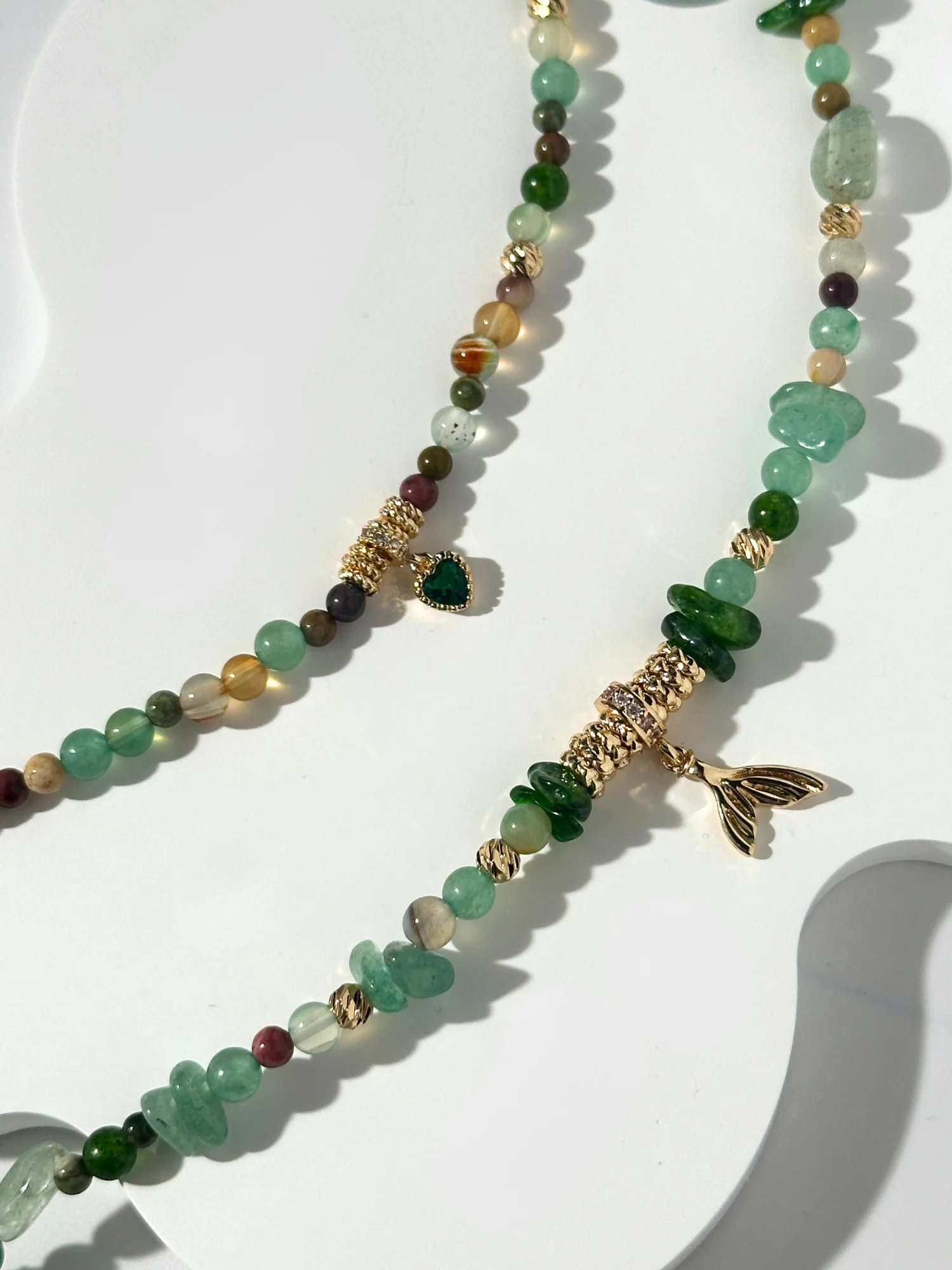 35 + 5 cm in uzatma payına sahip ilk kolye, zarif yeşil kalp charm detayıyla hafif ve romantik bir vurgu sunarken; 40 + 5 cm uzatma payına sahip ikinci kolye, gold-filled balina kuyruğu ucu ile tasarıma özgün bir okyanus dokunuşu katar. Derin yeşil, altın kehribar ve yumuşak bej tonlarındaki doğal taşlar, 14K altın kaplama detaylarla tamamlanarak renklerin canlılığını öne çıkarır.
