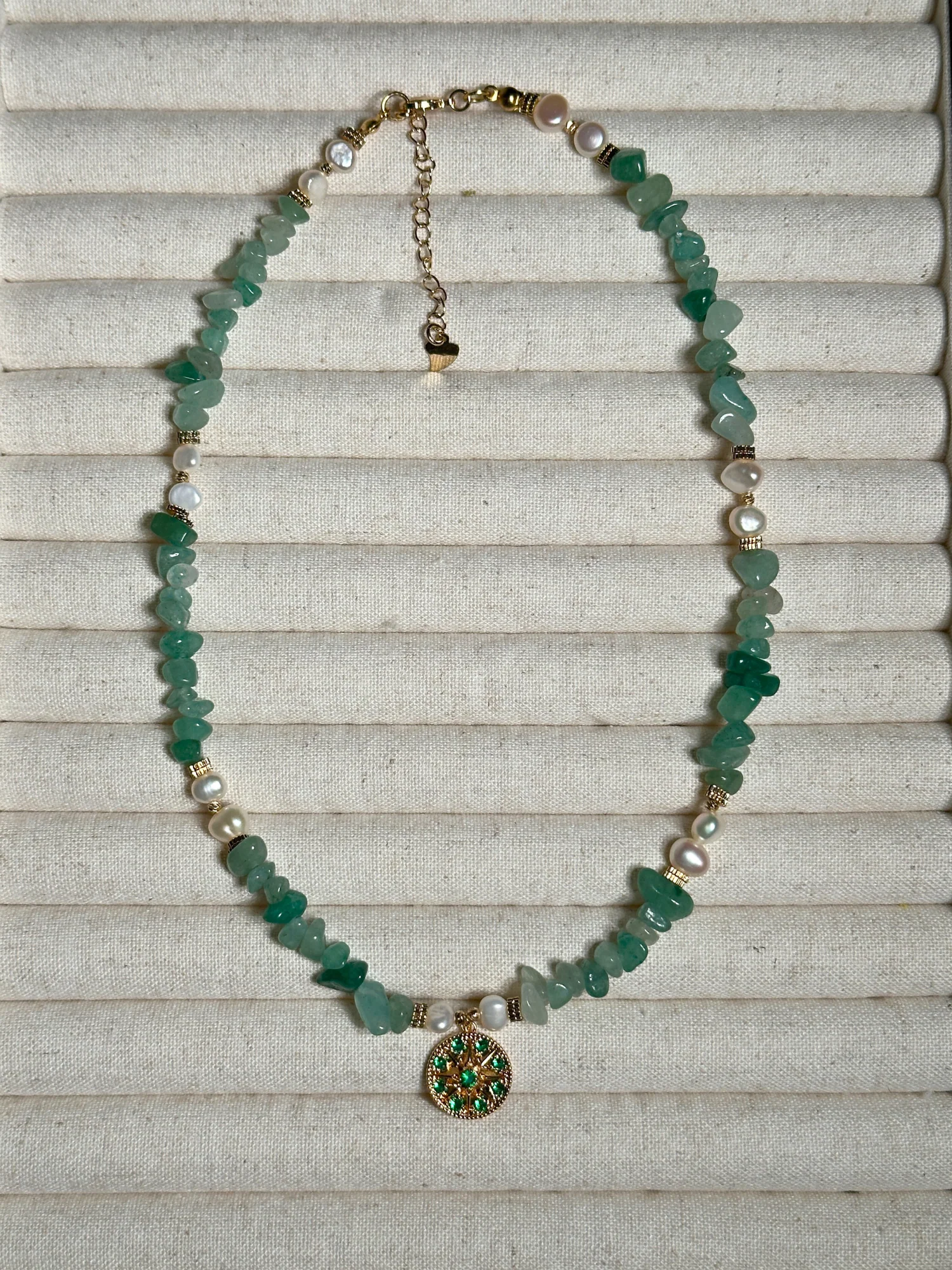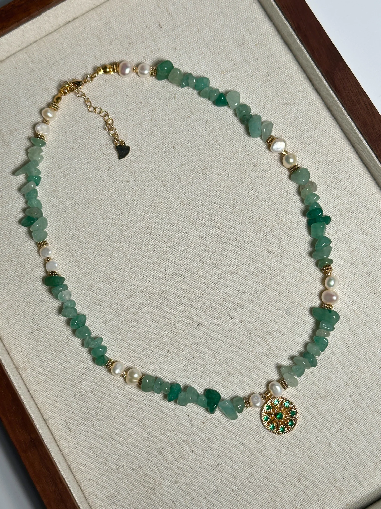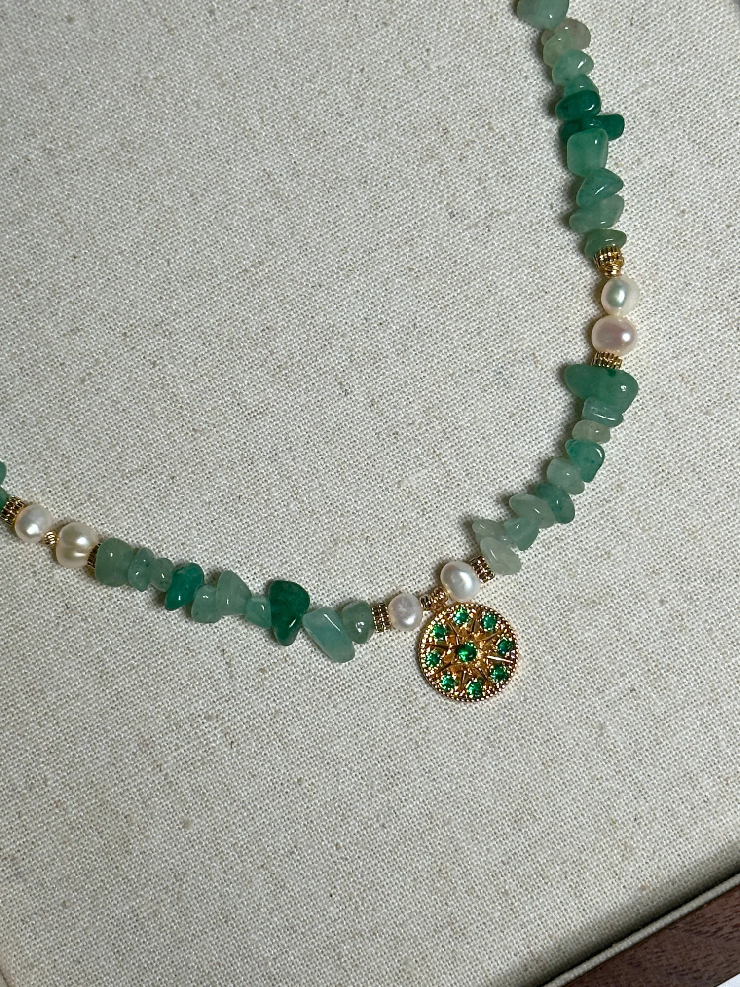 Toprağın yeşil tonlarını, incilerin ay ışığı gibi yumuşak ışıltısıyla buluşturan bu tasarım; doğal, hafif “orman peri” havasını zarif altın detaylarla bir araya getiriyor. Cottagecore ruhunu sevenler, romantik kalpler ve hem masalsı hem de şık bir parça arayan herkes için ideal. Hareket ettikçe ışığı yakalayan yeşil zirkon taşlı yuvarlak charm, kolyeye adeta büyülü bir dokunuş katıyor. İnce zincirlerle katmanlayarak ya da tek başına kullanarak yumuşak ama iddialı bir ışıltı yakalayabilirsiniz – bu kolye, yeni “soft glam” favoriniz olmaya aday.