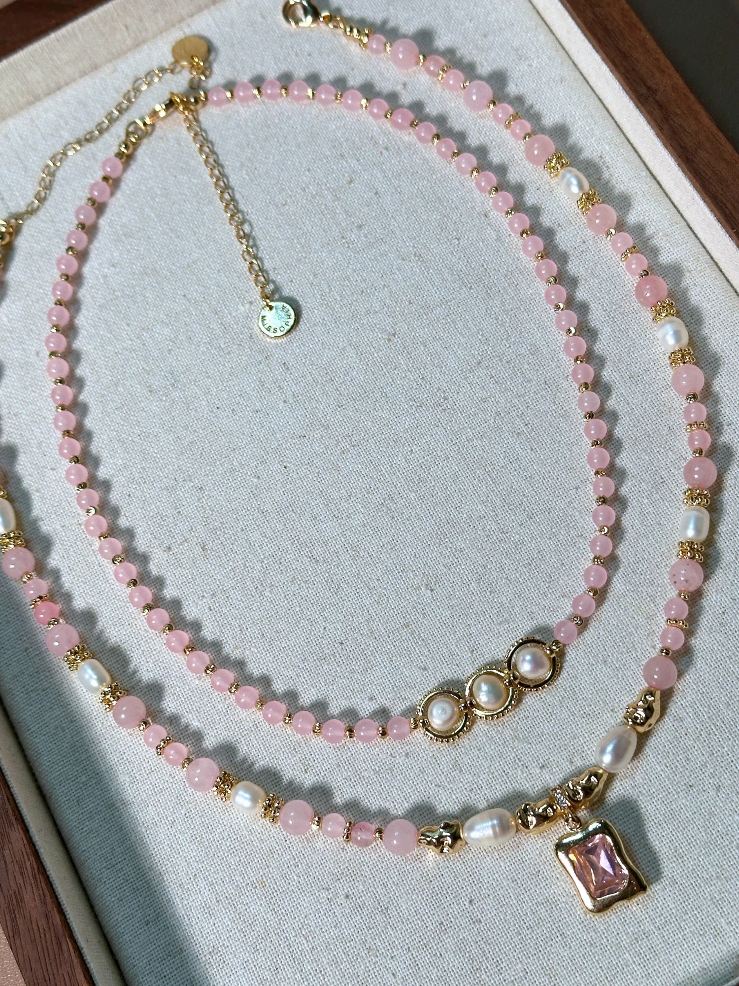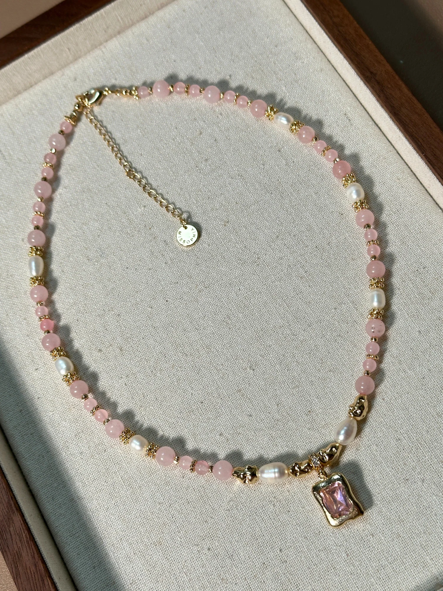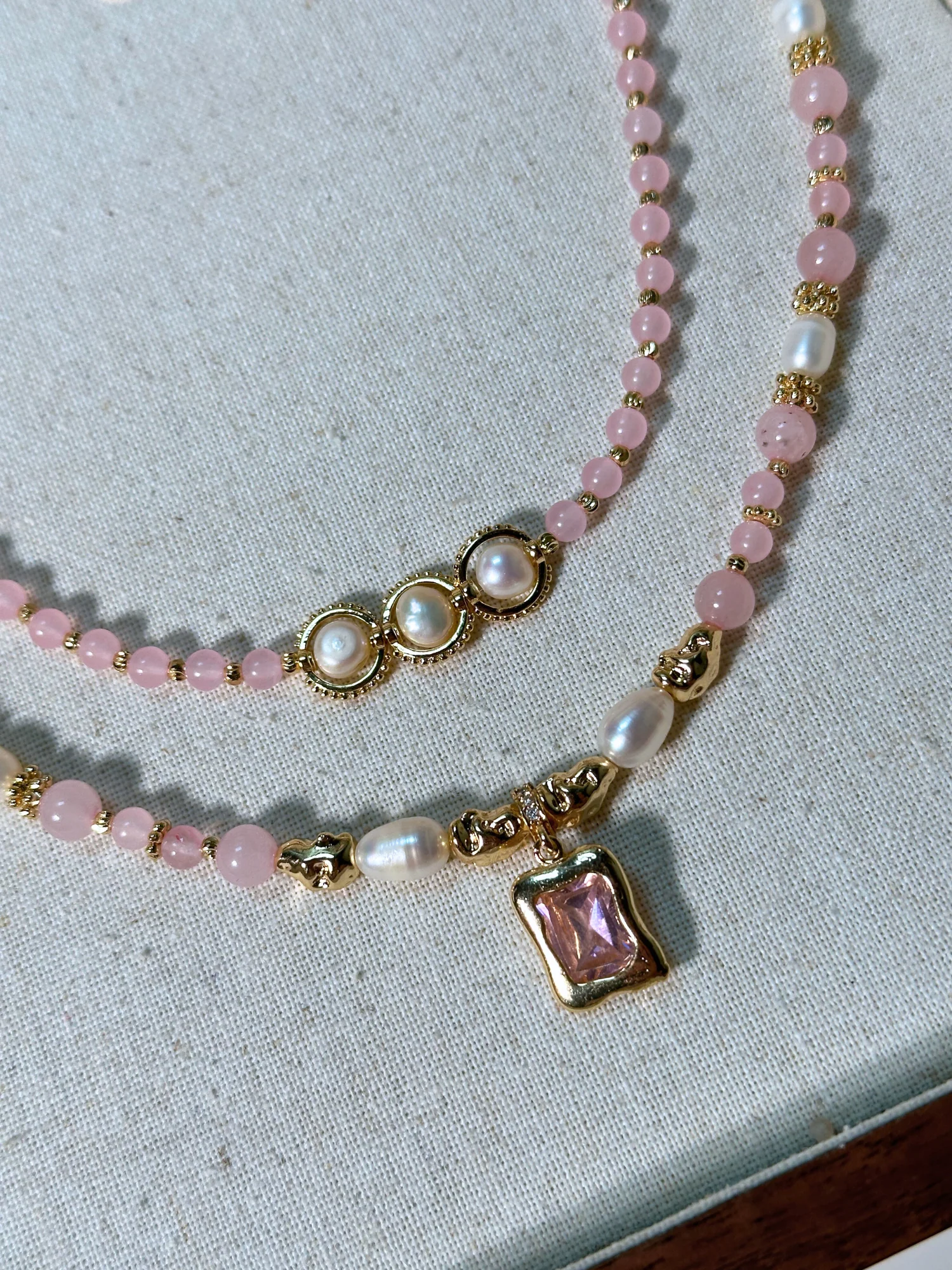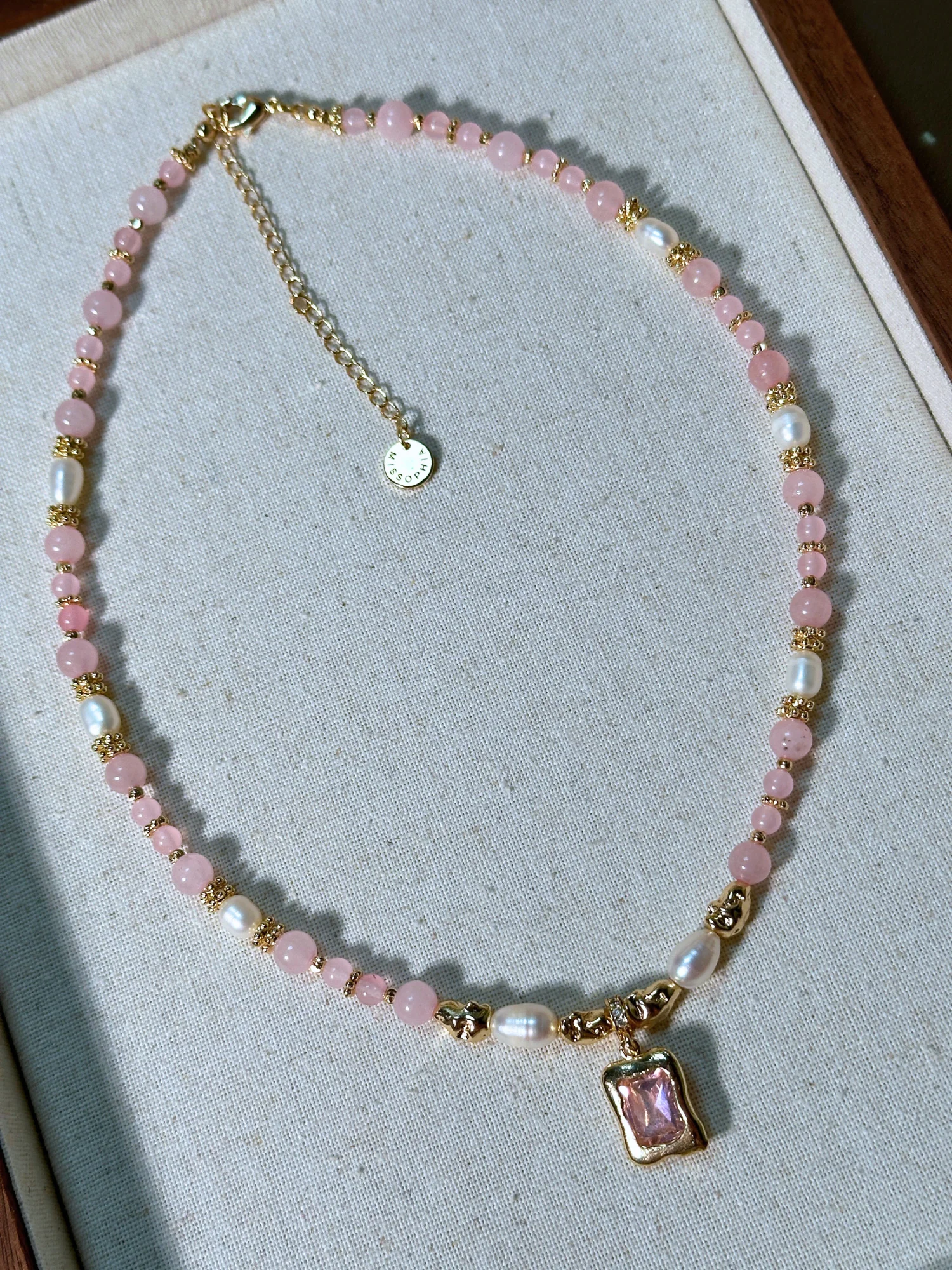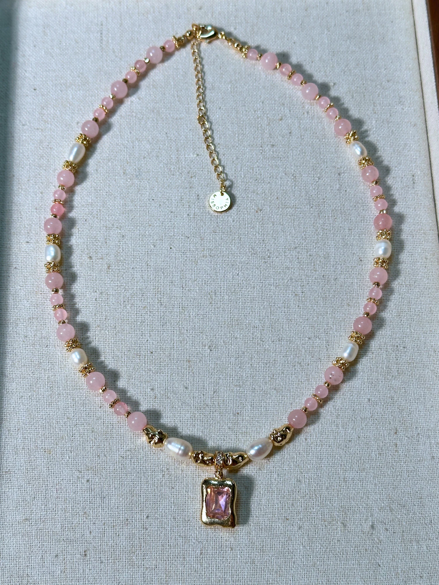 Gina İnci Detaylı Pembe Kuvars Kolye
