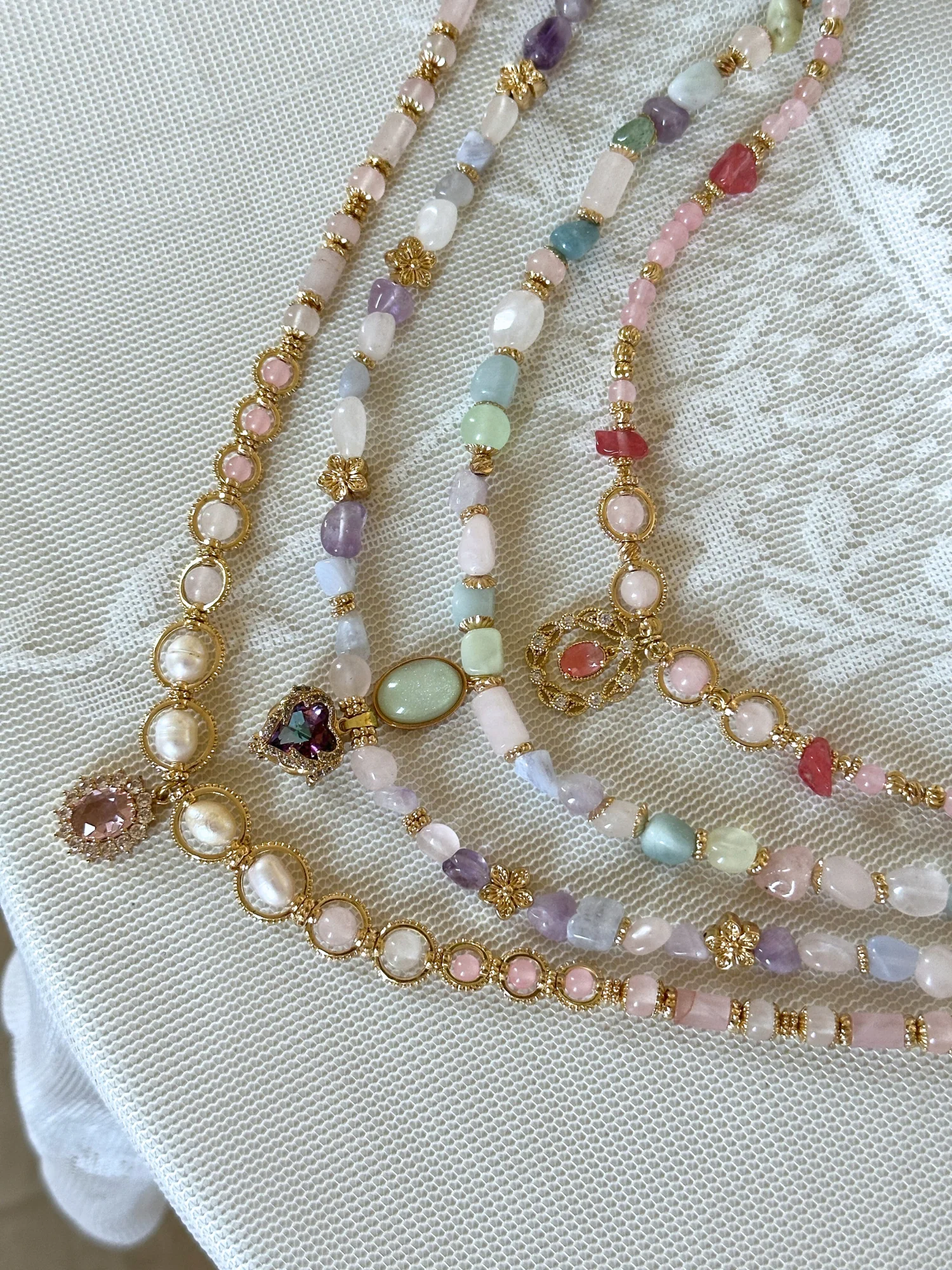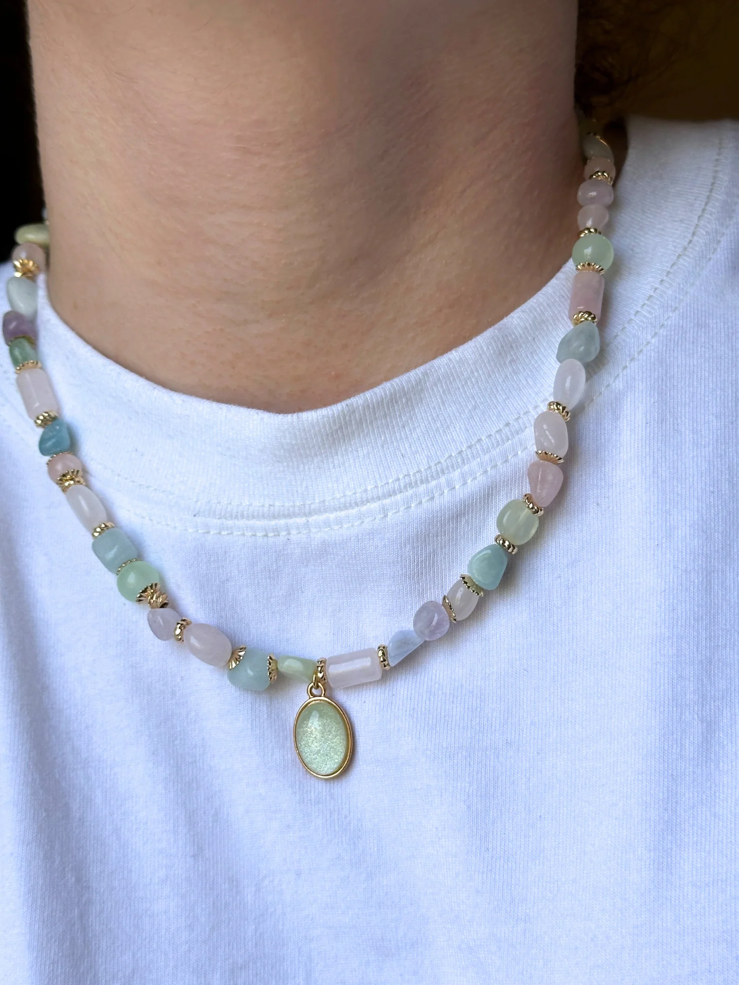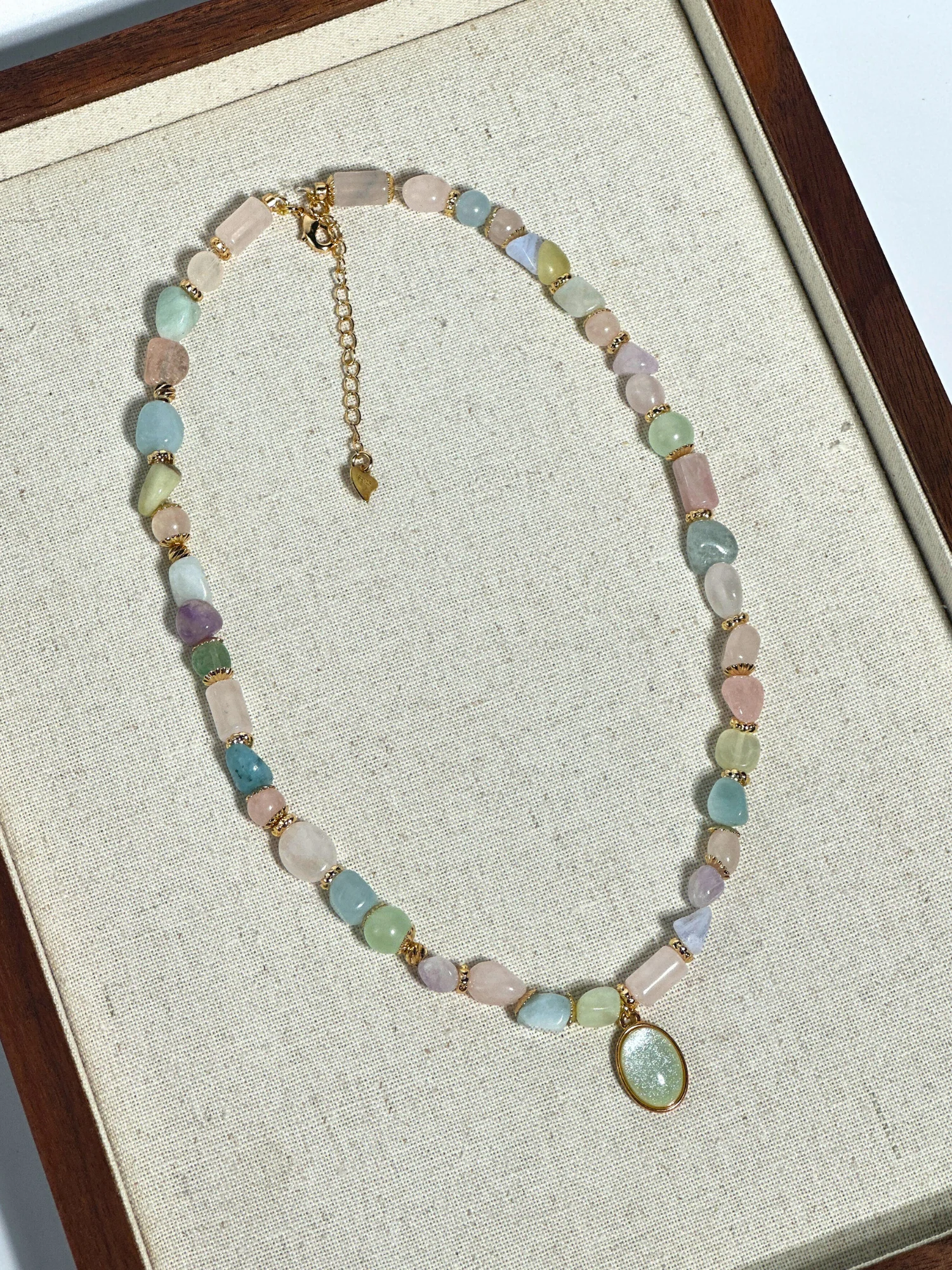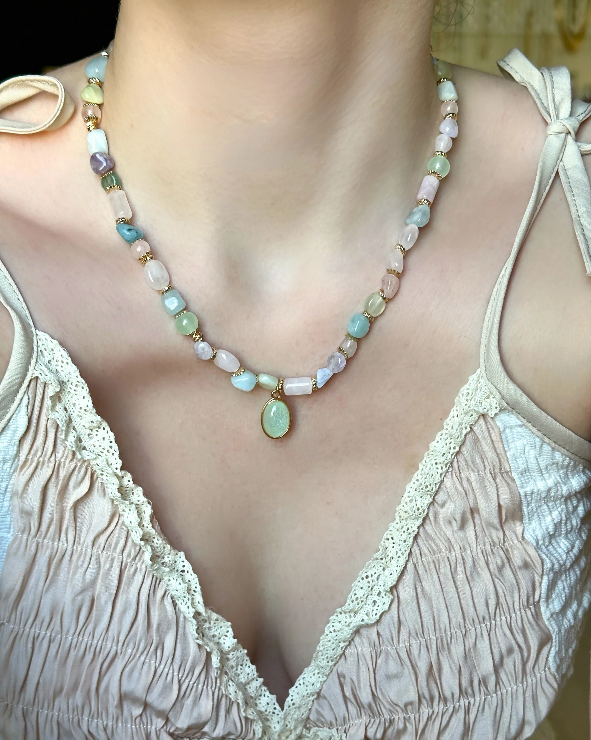 - Zarif ve feminen bir görünüm sunan karışık pastel doğal taşlar