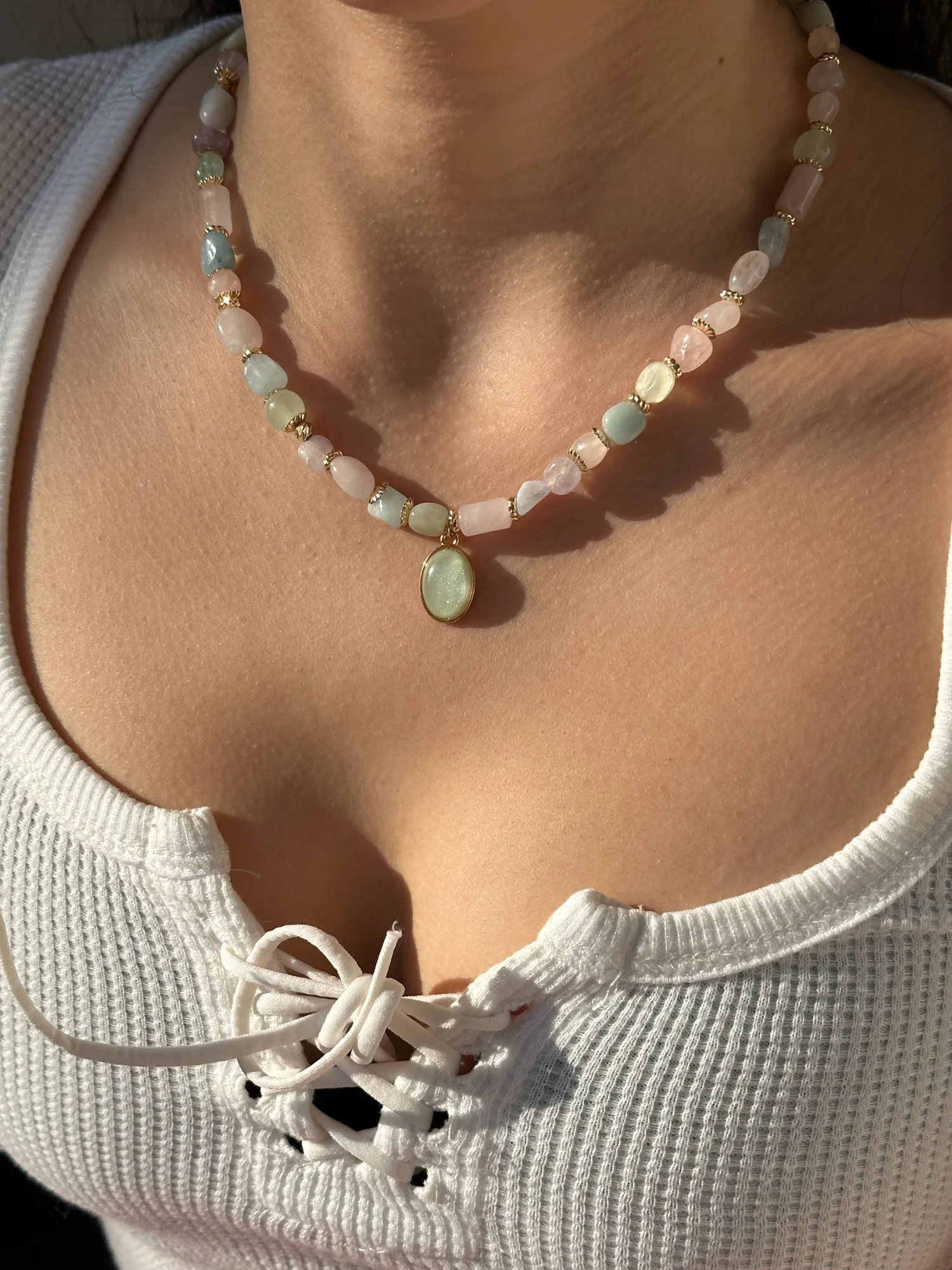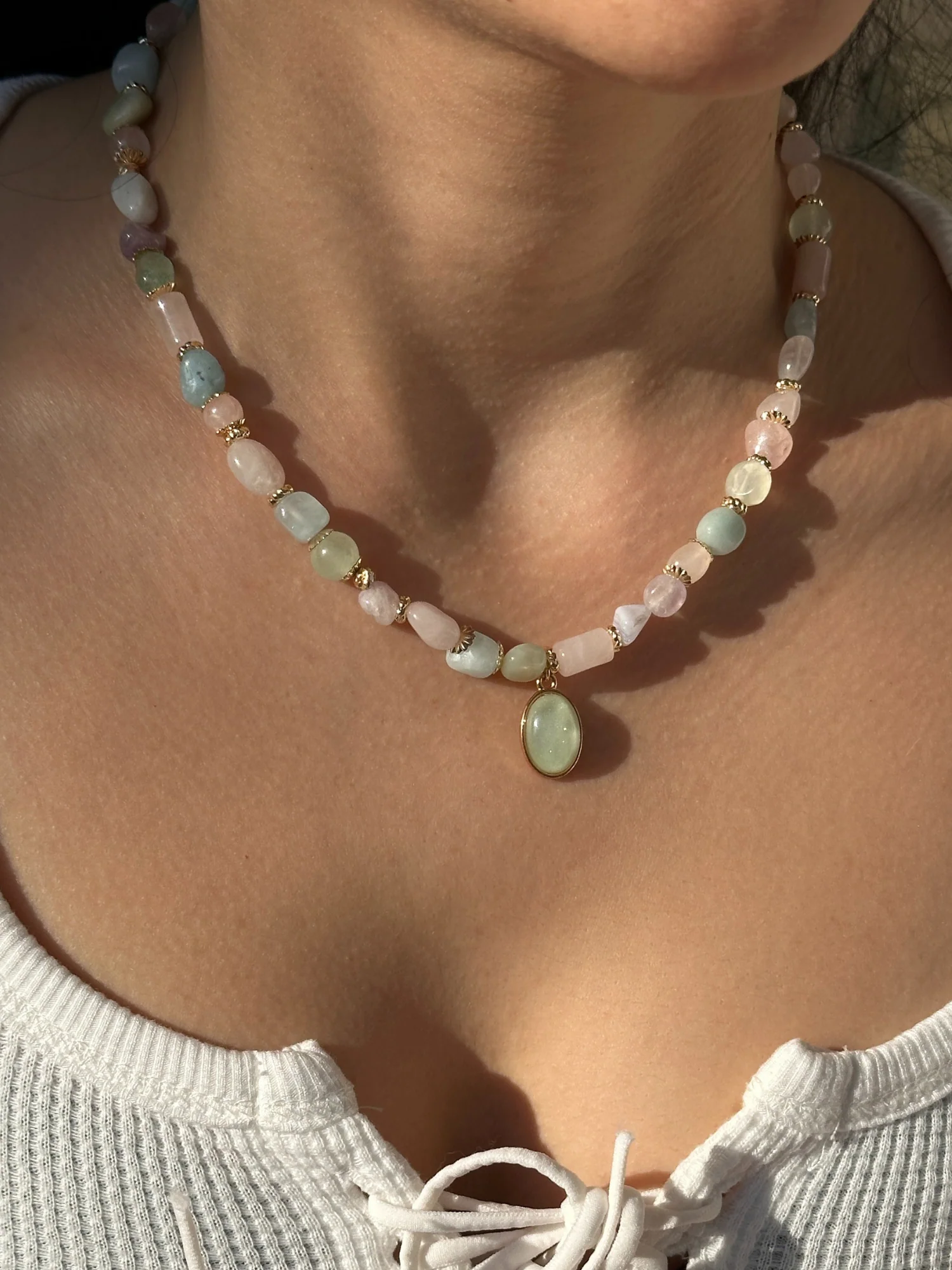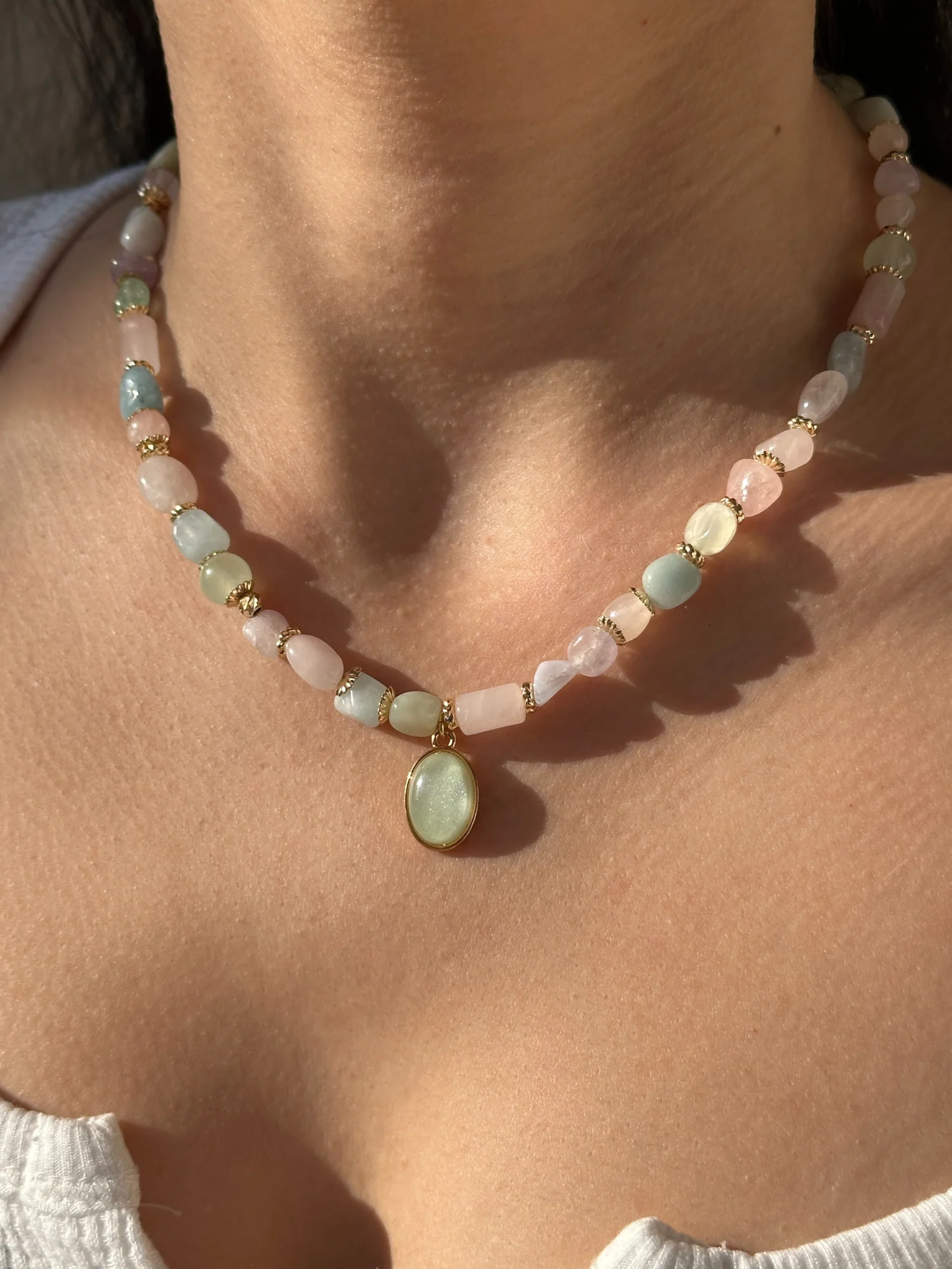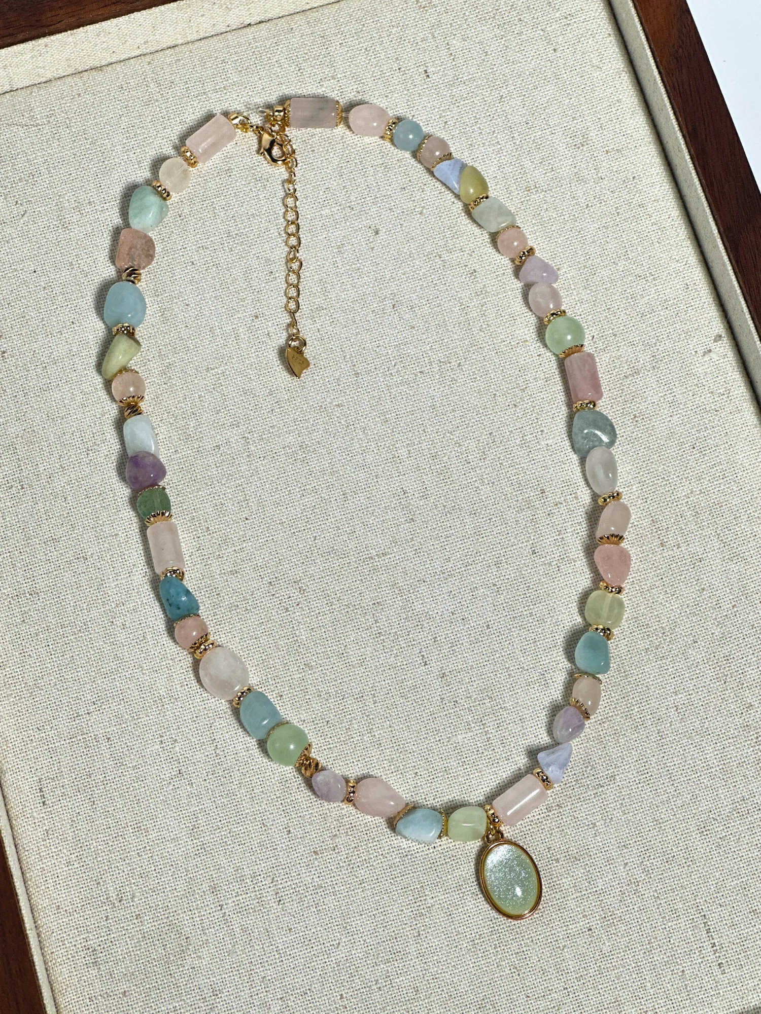 - Zarif ve feminen bir görünüm sunan karışık pastel doğal taşlar