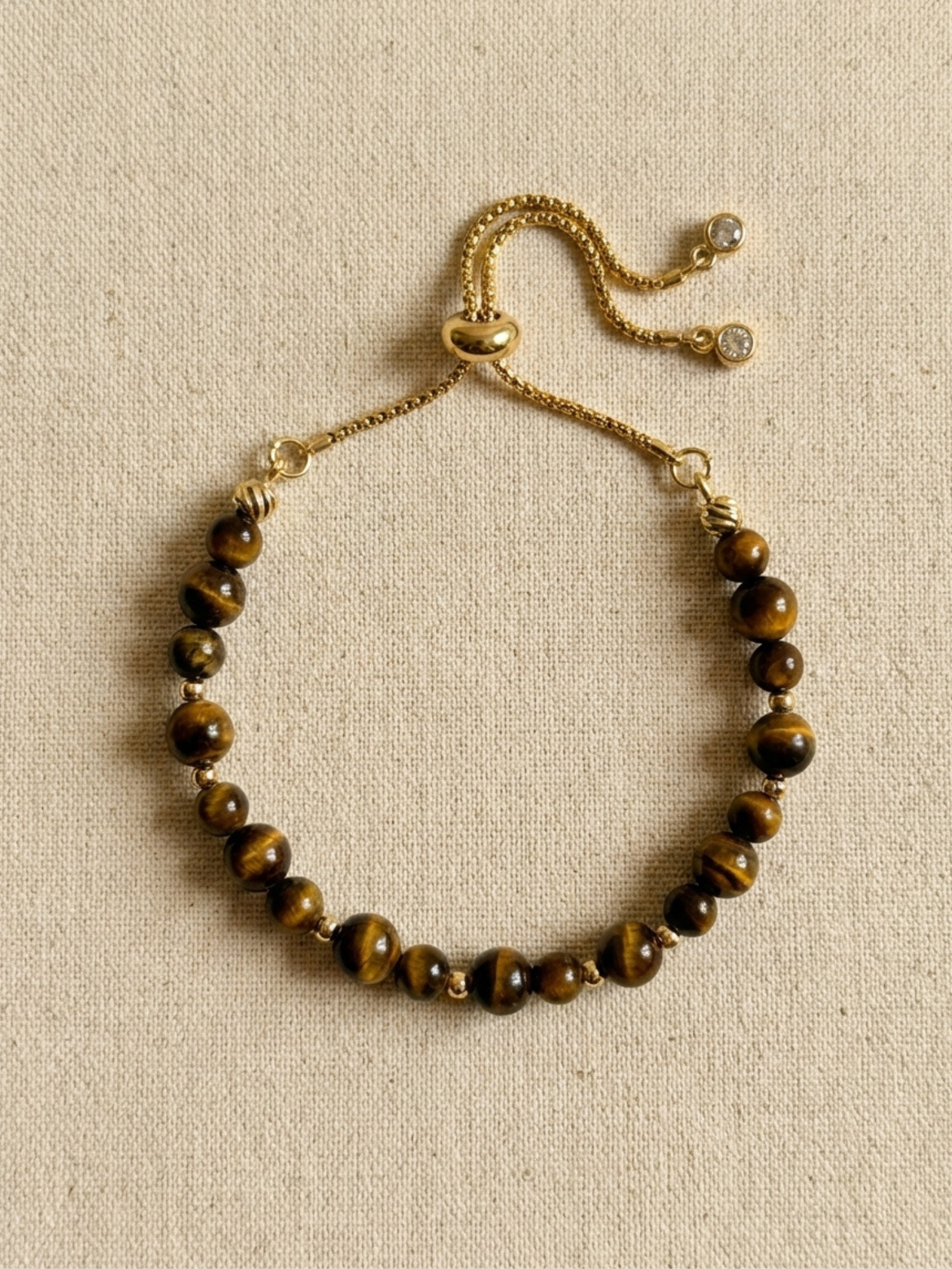 Toprak tonlarının güçlü ve kararlı enerjisini taşıyan bu Kaplan Gözü Doğal Taş Bileklik, ışıkla değişen altın-kahve yansımalarıyla bilekte dikkat çekici bir ışıltı yaratır. Kaplan gözünün kendine has çizgileri her boncuğu benzersiz kılar; zarif altın ara detaylar ise tasarıma sofistike bir sıcaklık ekler. Ayarlanabilir sürgü zincir formu sayesinde bileğe tam oturur; hem günlük kullanımda hem de şık kombinlerde tek başına güçlü bir imza parçası gibi durur.