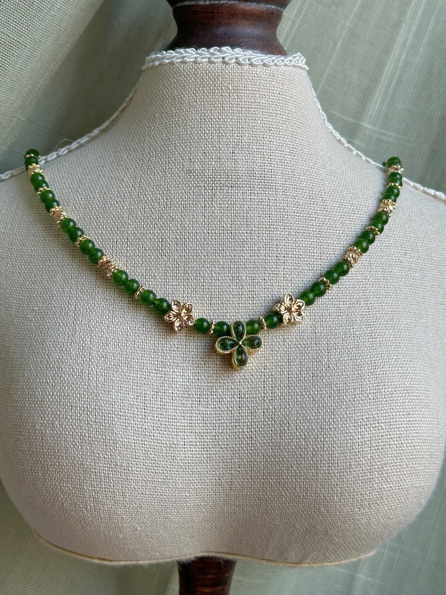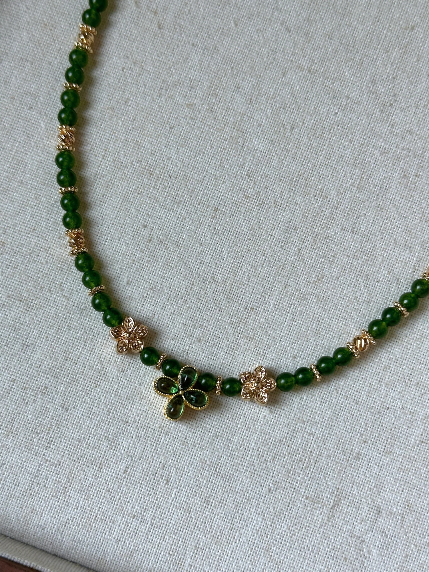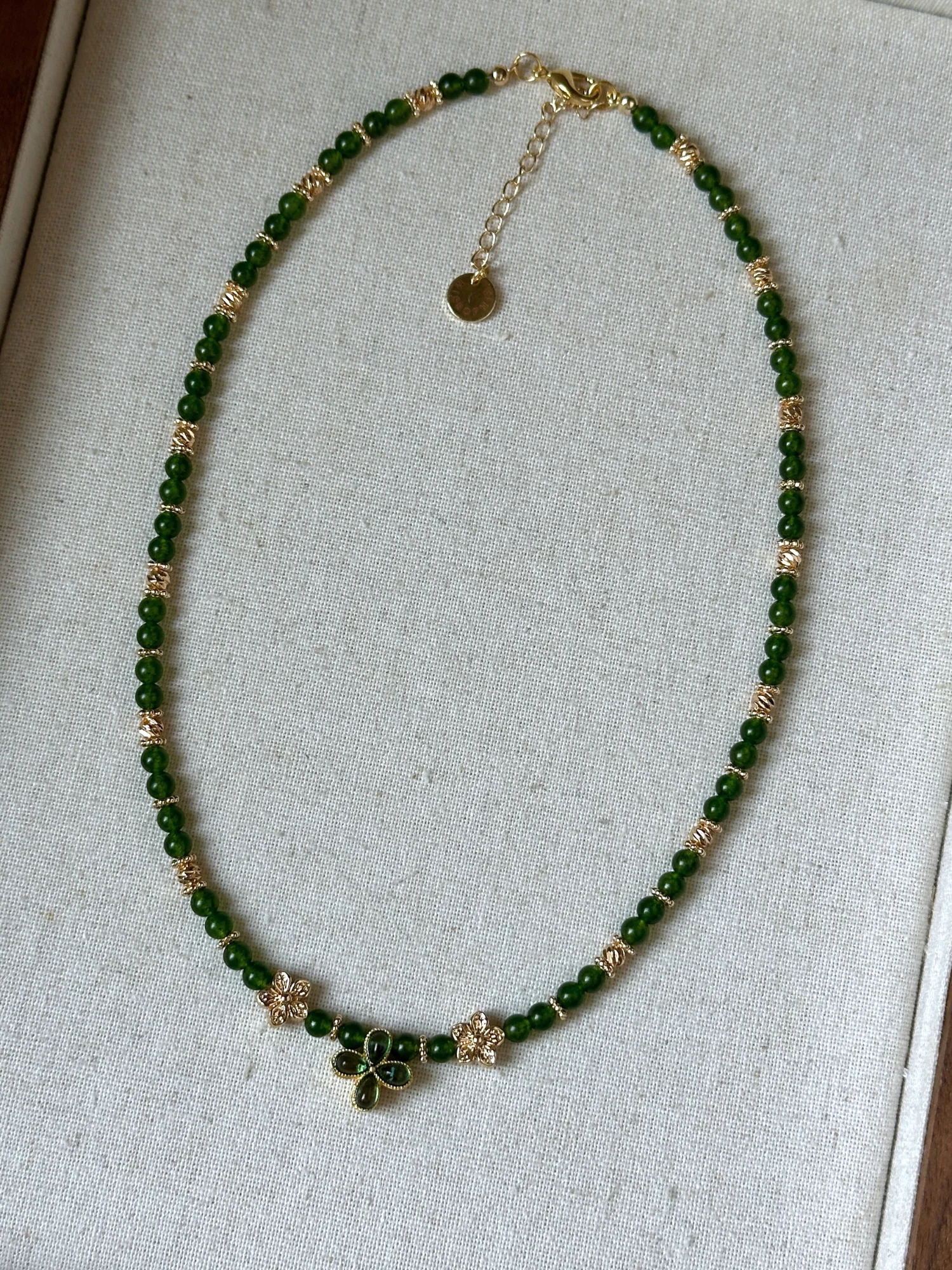 El işçiliğiyle tasarlanan bu kolye, 4 mm doğal yeşim taşları ile hazırlanmış olup, her bir taş topraklayıcı enerjisiyle denge ve uyum hissi yaratır. Parçayı tamamlayan 14k gerçek altın kaplama detaylar, uzun ömürlü bir parlaklık ve lüks bir dokunuş sunar.
