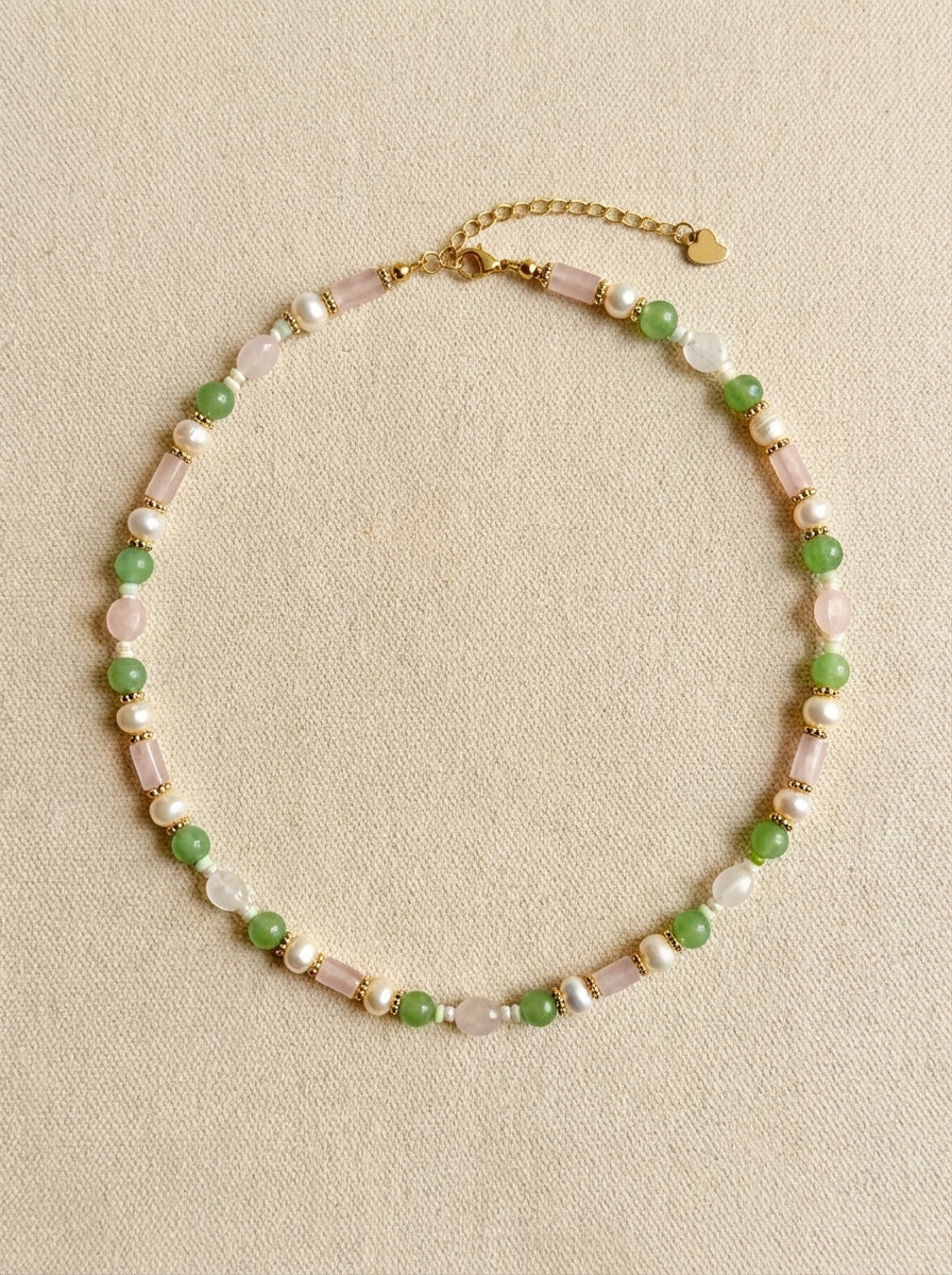 Bu özel tasarım kolye; pastel pembe tonlarında özel kesim dikdörtgen kuvars taşları, canlı ve parlak yeşil dokusuyla kalsedon, yumuşak parıltılı şeker kesim kuvars ve doğal ışıltısıyla öne çıkan tatlı su incileri ile özenle bir araya getirildi. Aralara yerleştirilen altın detaylar, tasarıma lüks ve bütünleyici bir ışıltı katarken; doğal taşların enerjisiyle modern bir sofistike hava yaratıyor.