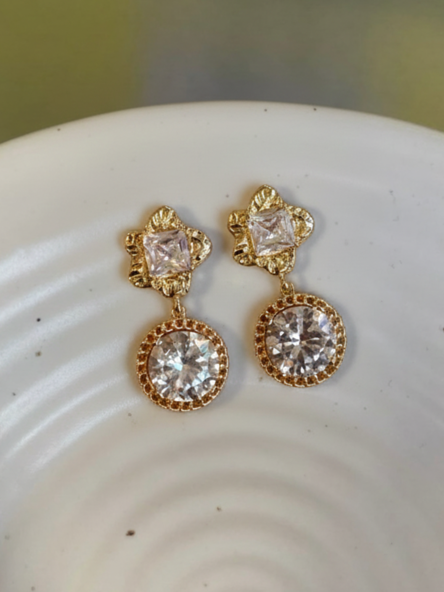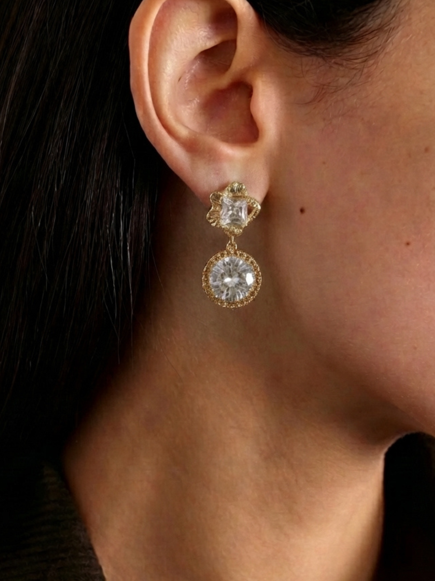 Klasik zarafetle modern parıltının buluştuğu Leona Zirkon Sallantılı Küpe, özel kesim zirkon taşların kusursuz ışıltısını altın tonlu çerçevesiyle vurgular. Üst kısmındaki çiçek formu, feminen bir zarafet katarken, alt kısımdaki büyük taş ışıltısıyla göz kamaştırır. Gündüzden geceye uzanan şık kombinler için ideal bir tamamlayıcıdır.