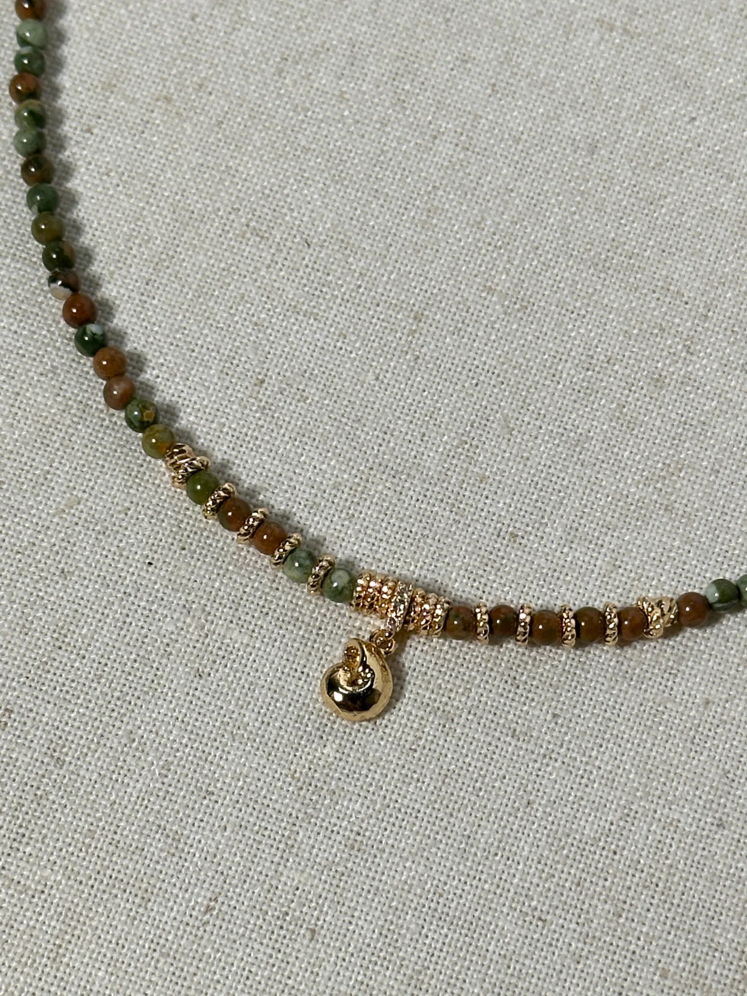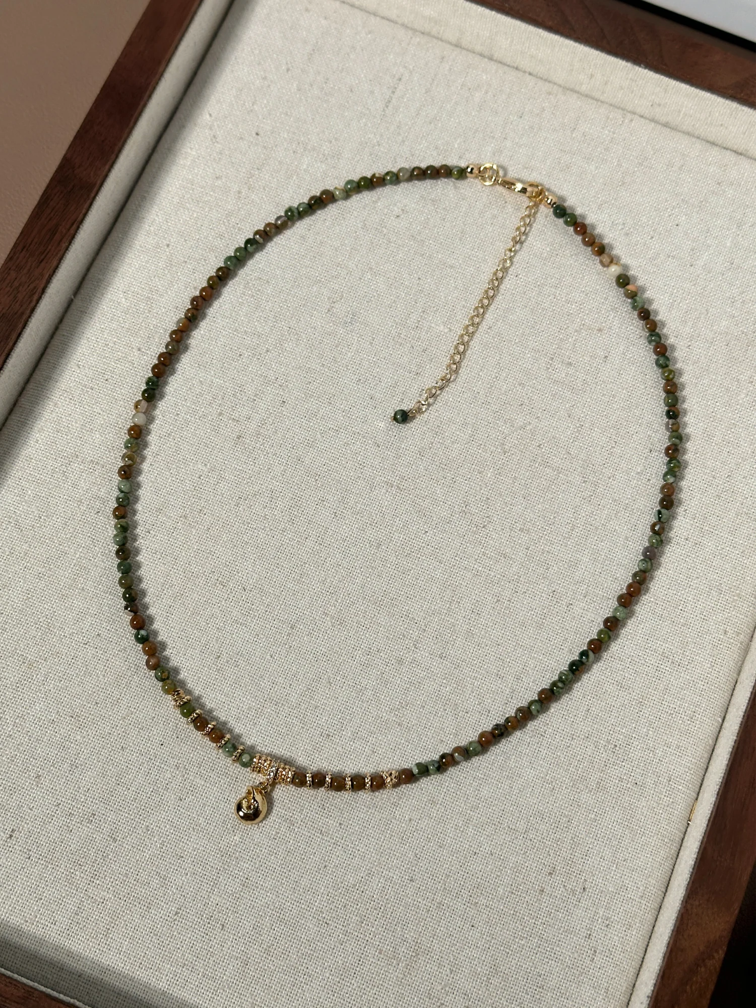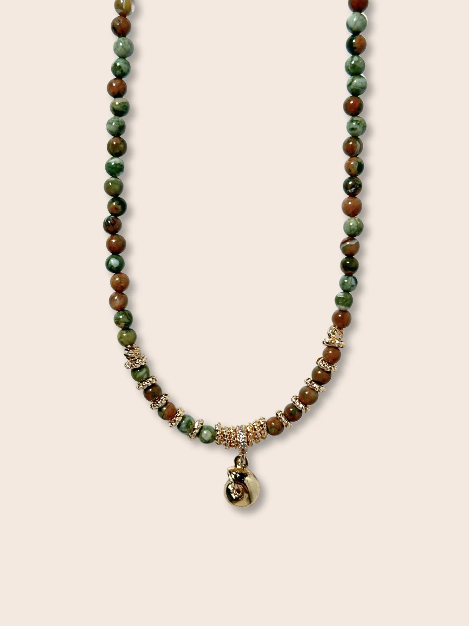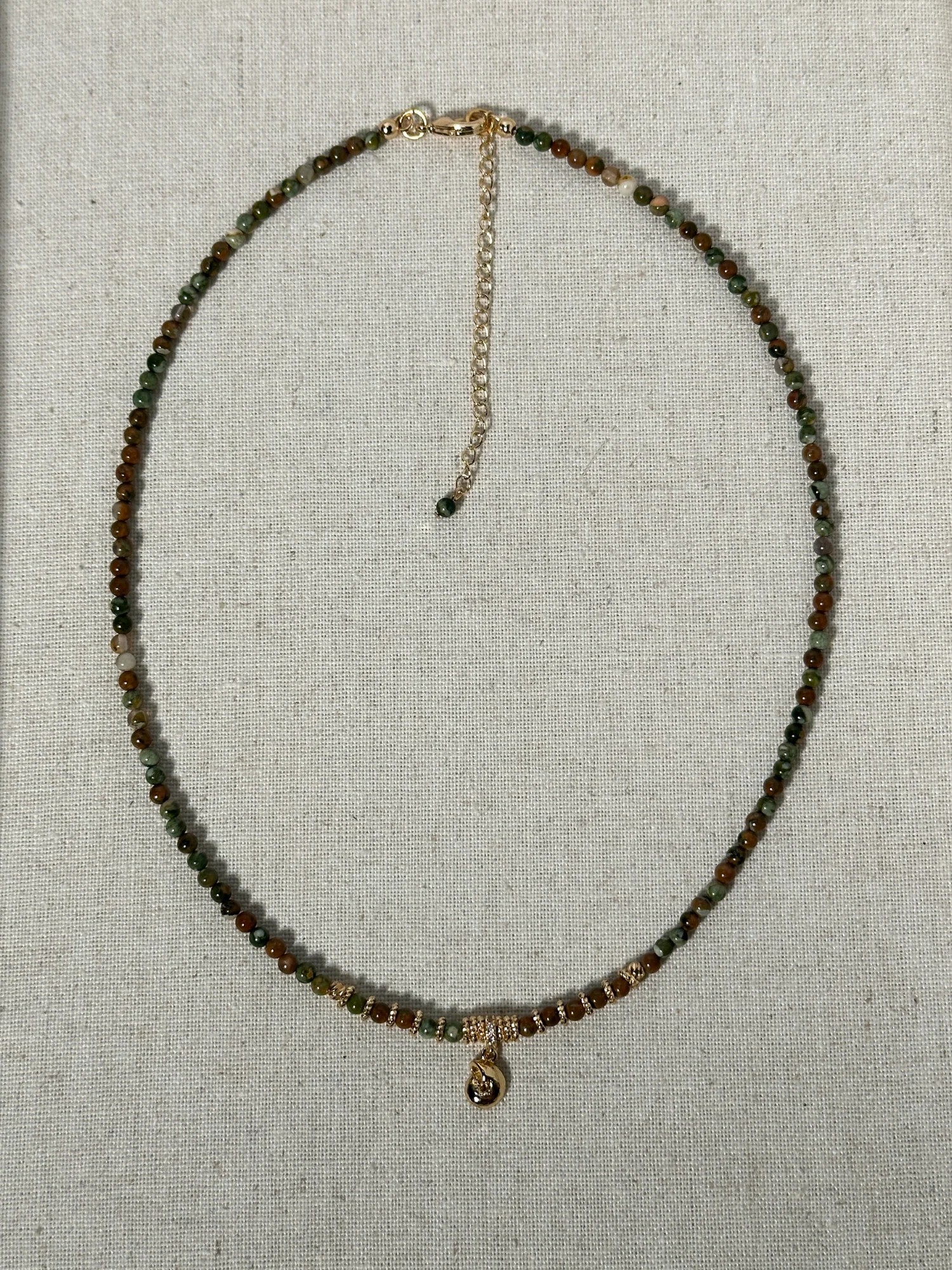 Doğanın dingin zarafetinden ilham alan bu kolye, toprağın lüks enerjisini modern bir yorumla yansıtır. Zengin, yosun yeşili ve sıcak kahverengi tonları; orman yollarını ve güneşle aydınlanan toprağın huzurlu enerjisini çağrıştırır. Altın detaylar tasarıma rafine bir kontrast katarken, merkezdeki zarif deniz kabuğu pendant’ı kıyıdan toplanmış bir hatırayı andırır—şiirsel ve doğal bir dokunuş. Bohem ruhlu ama minimalist formda tasarlanan Earthbound Charm, katmanlı olarak ya da tek başına takıldığında dört mevsim boyunca sessiz ama güçlü bir enerji taşır.
