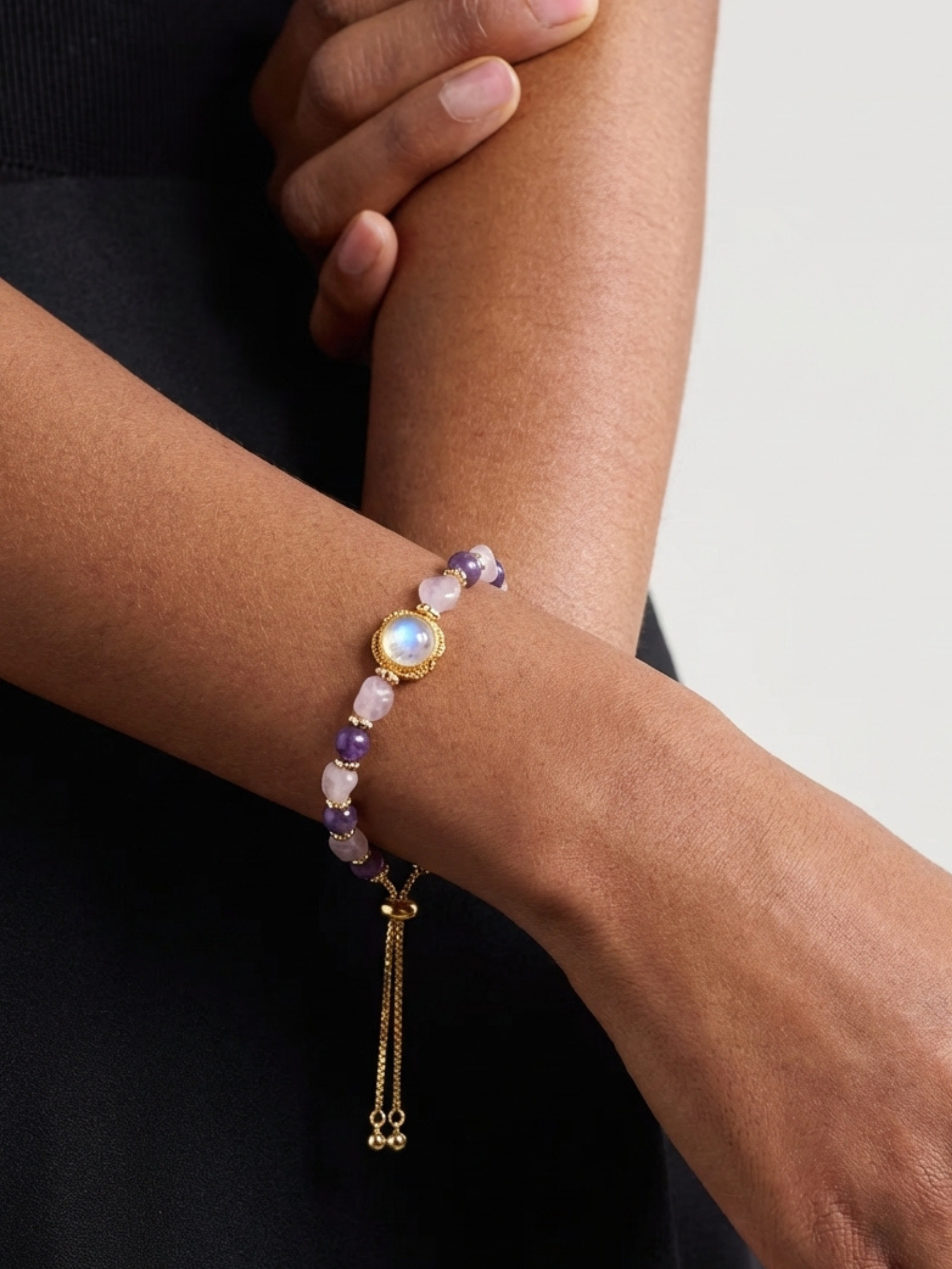 Ametistin ruhsal dinginliğini ve mor kalsedonun zarif, soğuk mor tonlarını bir araya getiren bu bileklik, huzur ve zarafeti aynı anda taşır. Her taşın kendine özgü parlaklığı, ışığa göre değişen yumuşak ton geçişleriyle zarif bir uyum oluşturur. 14 ayar altın kaplama detaylar, pastel taşların narin enerjisini tamamlayarak bilek çevresinde şık bir denge yaratır.