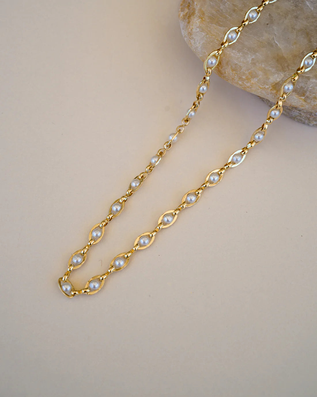 Altın dokulu halkalar içinde özenle yerleştirilen inciler, ışığı her açıdan yakalayarak boyun hattına doğal bir parlaklık kazandırır. Zamansız ve sofistike bu tasarım, gündelik zarafetten özel davetlere kadar her stile uyum sağlar.