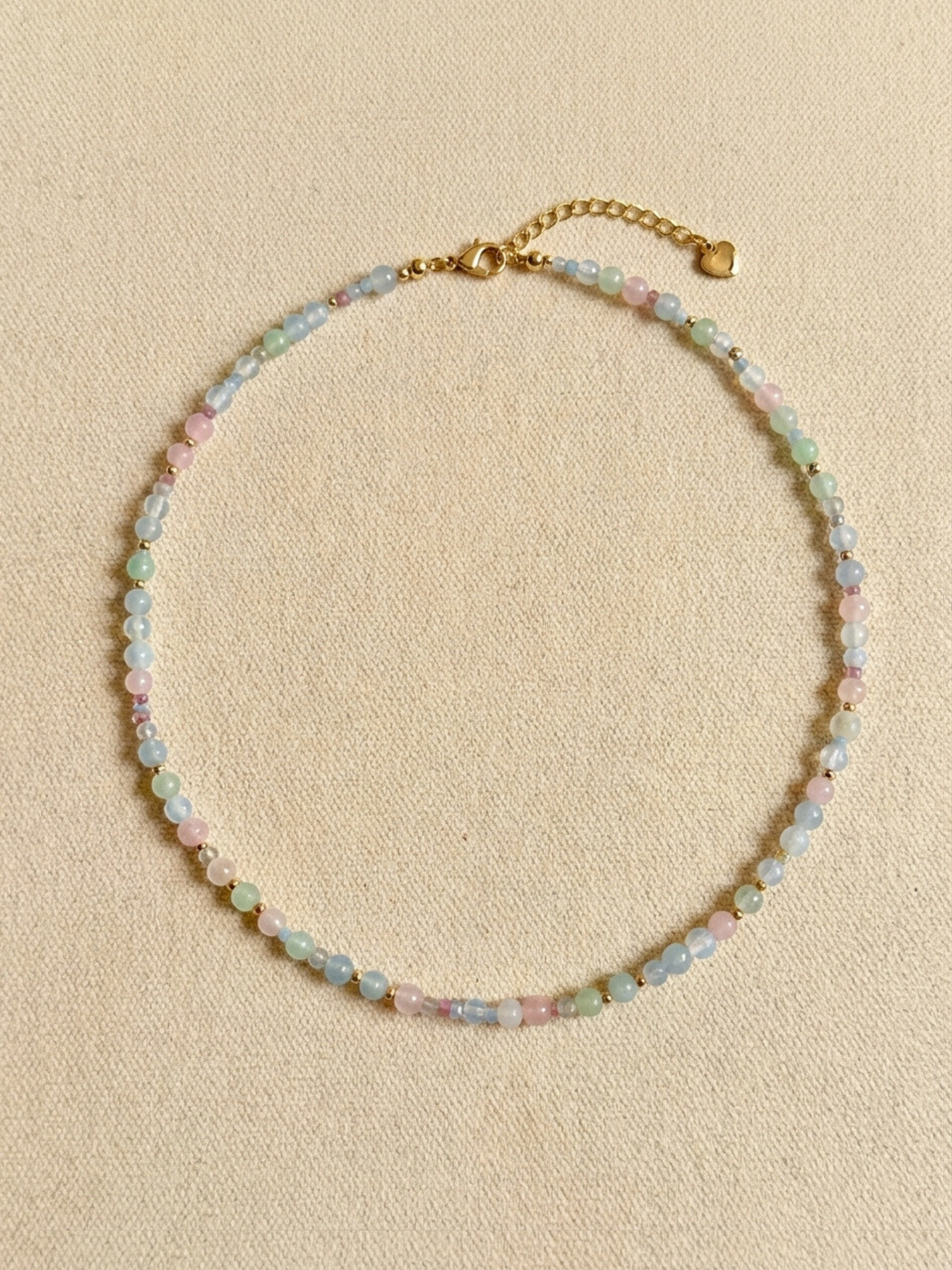 Küçük doğal taşların dengeli dizilimi, kolyeyi hem günlük kullanım için sade bir imzaya dönüştürür hem de yaz kombinlerinde tek başına bile stilinizi aydınlatan bir tamamlayıcı yapar.