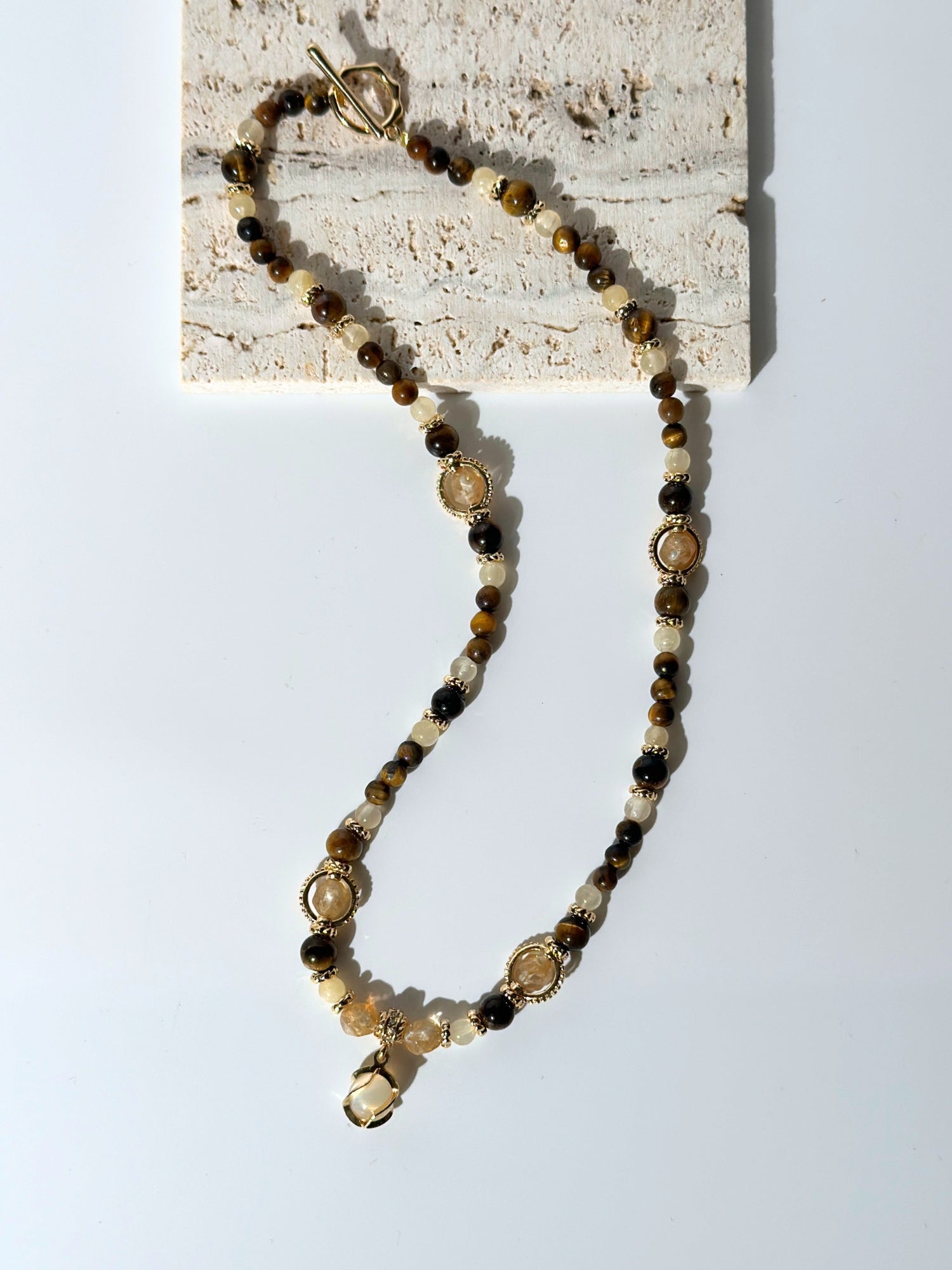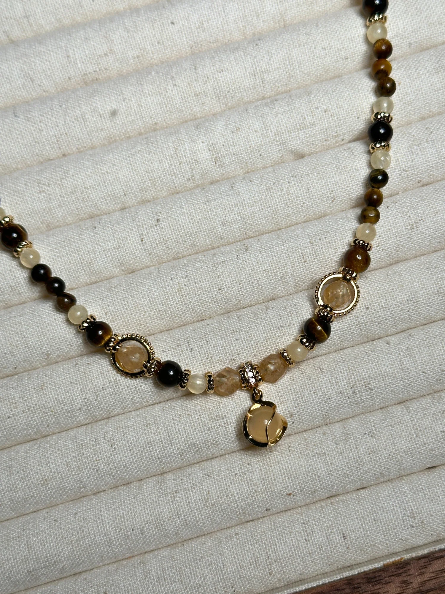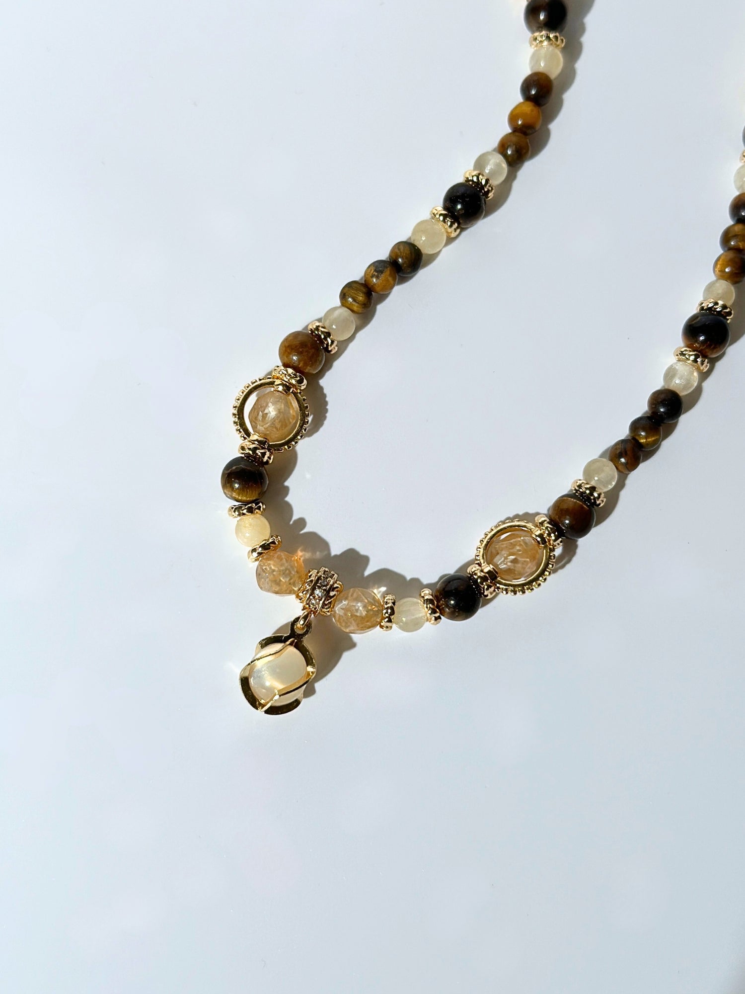 Merkezinde, kristalleşmiş gün ışığı gibi parlayan özel kesim sitrin taşları; kadim zamanlardan beri güçlü koruma ve uyanmış güç taşı olarak bilinen kaplan gözü damarlarının arasında dans eder. Her bir boncuk, “niyet” ile atılan bir nabız gibi – gereksiz hiçbir parça yok, taviz yok.