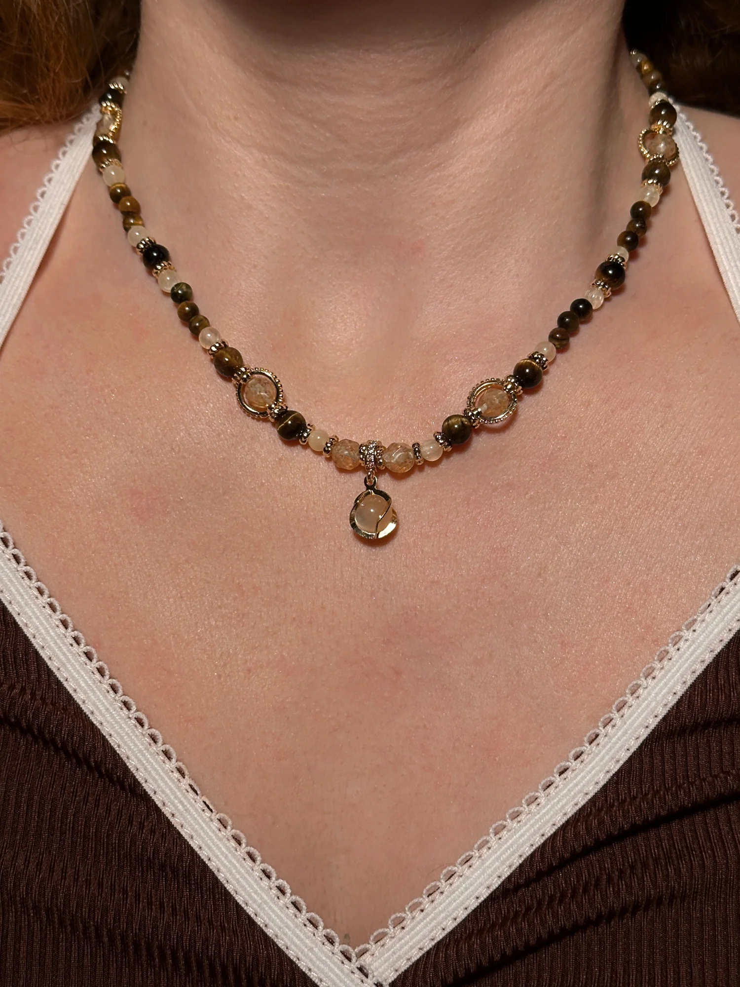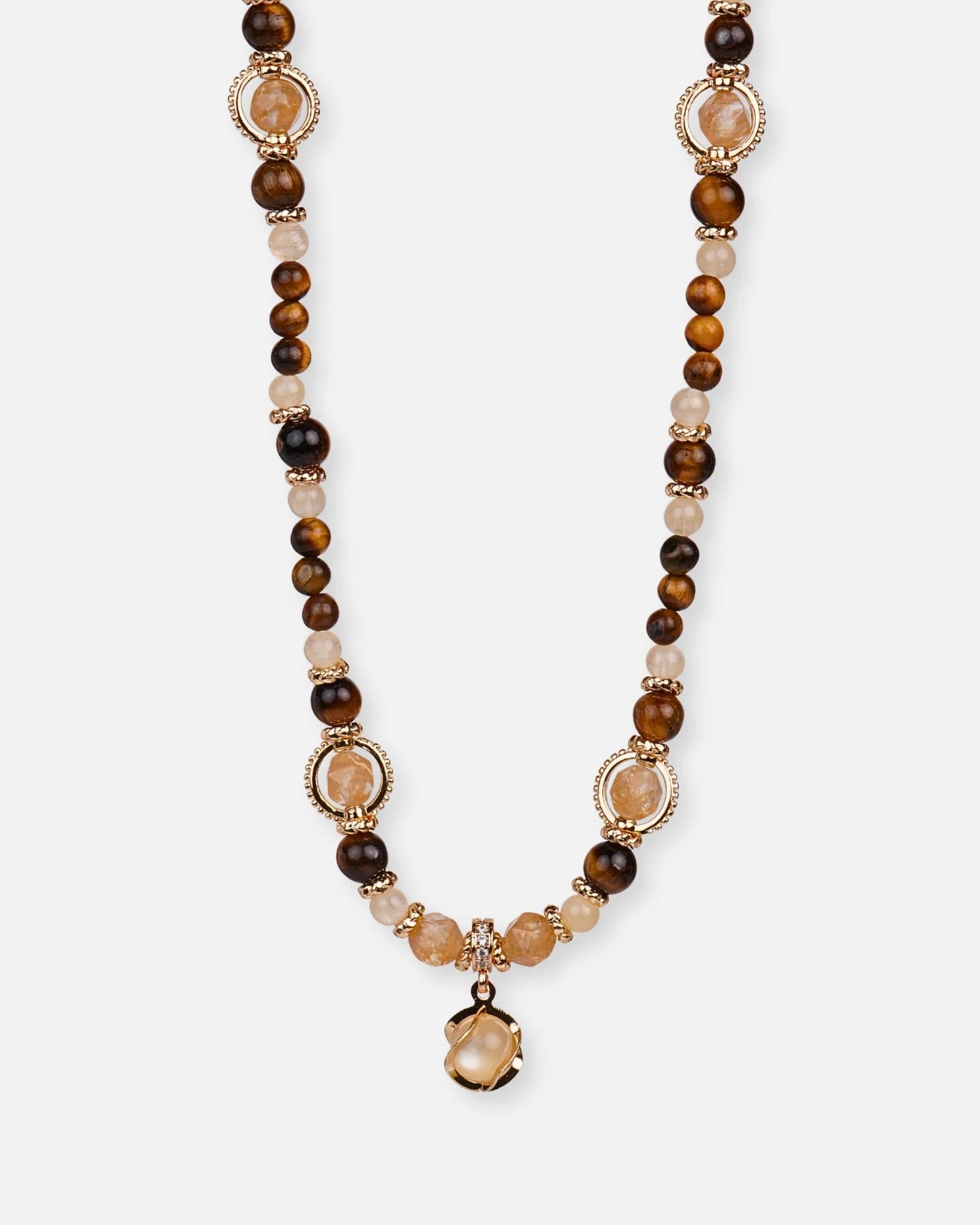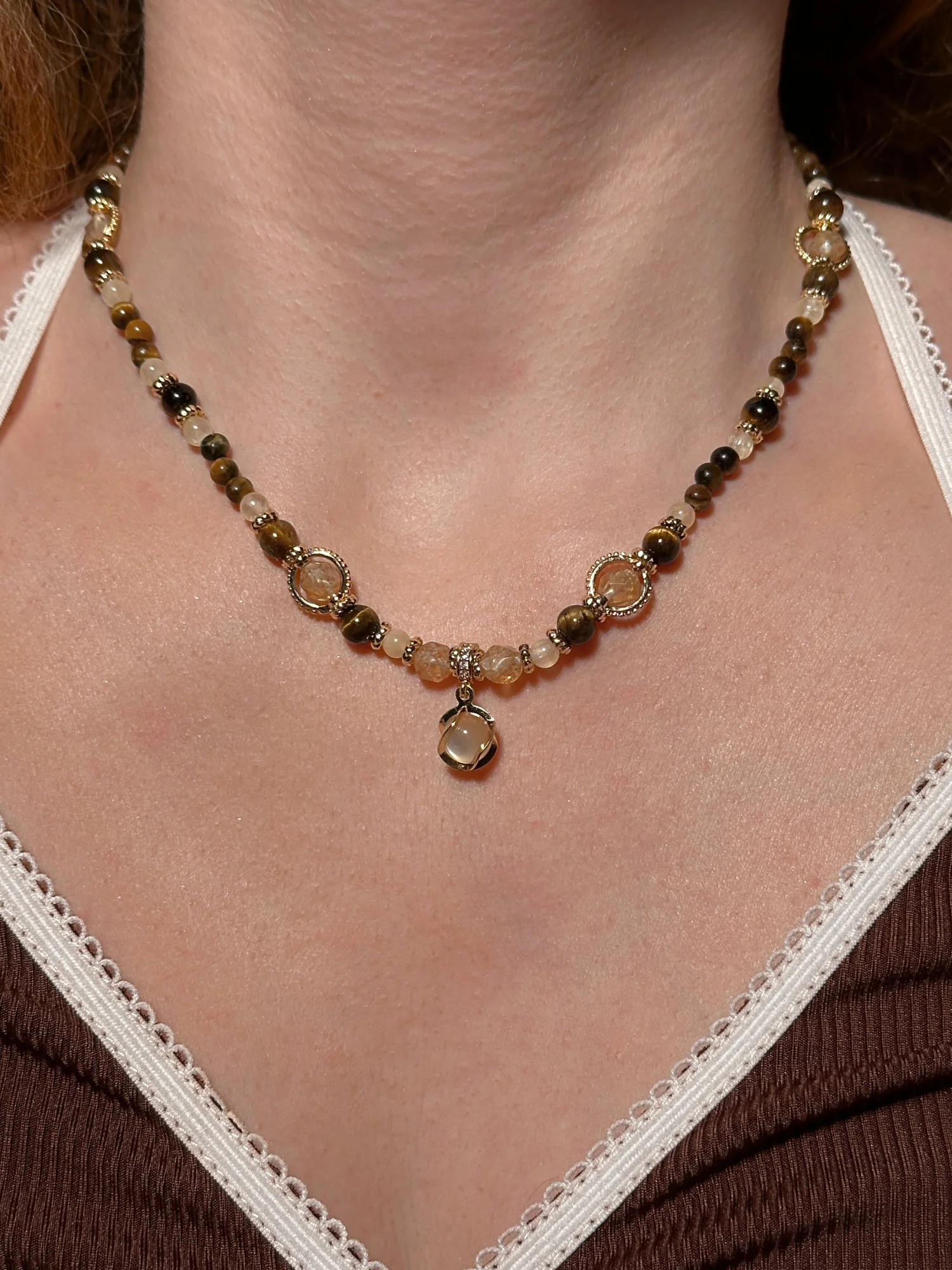 Merkezinde, kristalleşmiş gün ışığı gibi parlayan özel kesim sitrin taşları; kadim zamanlardan beri güçlü koruma ve uyanmış güç taşı olarak bilinen kaplan gözü damarlarının arasında dans eder. Her bir boncuk, “niyet” ile atılan bir nabız gibi – gereksiz hiçbir parça yok, taviz yok.