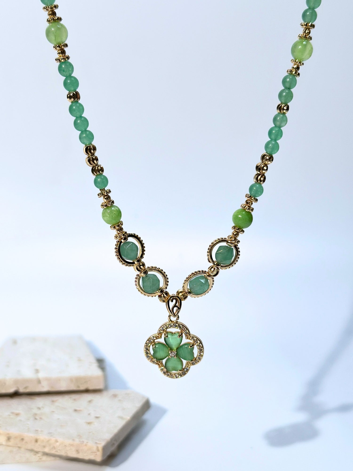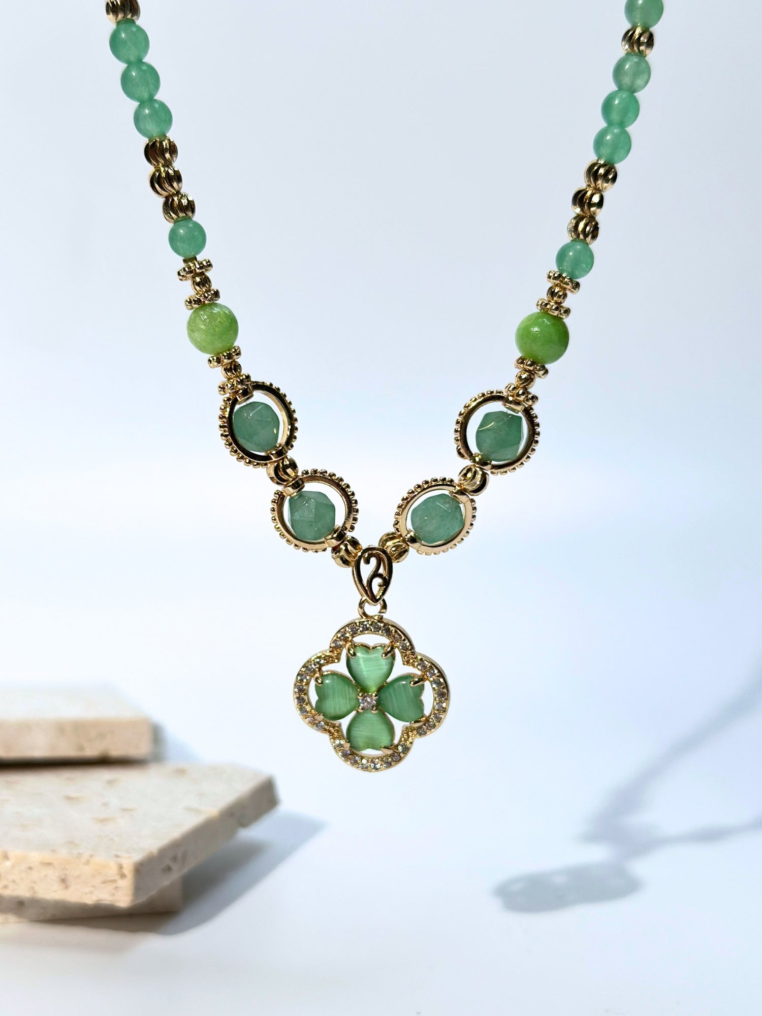 Doğanın huzur verici enerjisini zarafetle buluşturan Riva Yonca Kolye, özel kesim elmas formundaki aventurin taşlarıyla ışığı büyüleyici şekilde yansıtır. Merkezde yer alan yonca charm, dört yaprağında da farklı yönlerin şans, sevgi, denge ve bolluk enerjisini taşır. İnce 14 ayar gerçek altın kaplama detaylar, kolyeye sıcak bir ışıltı ve lüks bir dokunuş kazandırır.