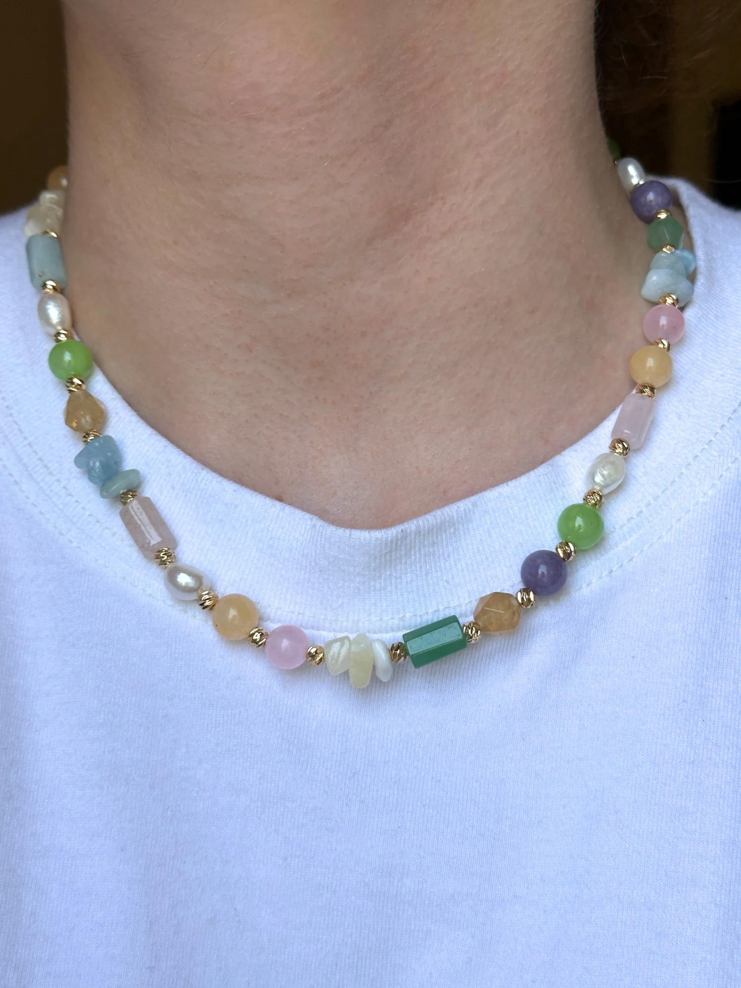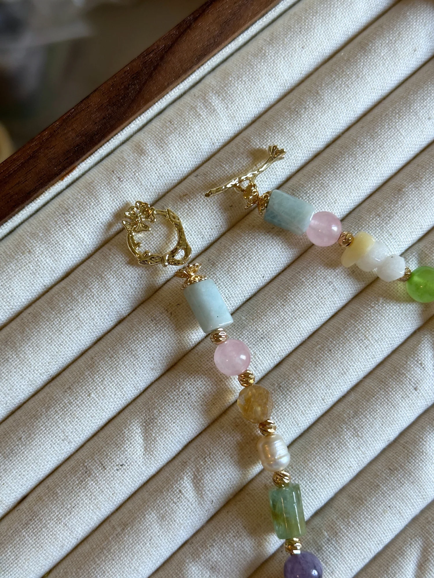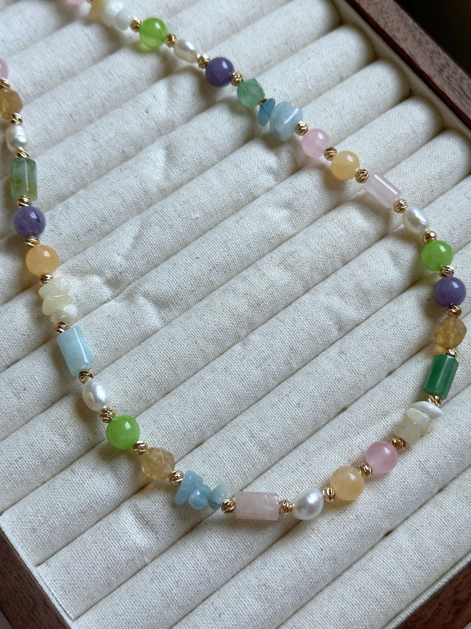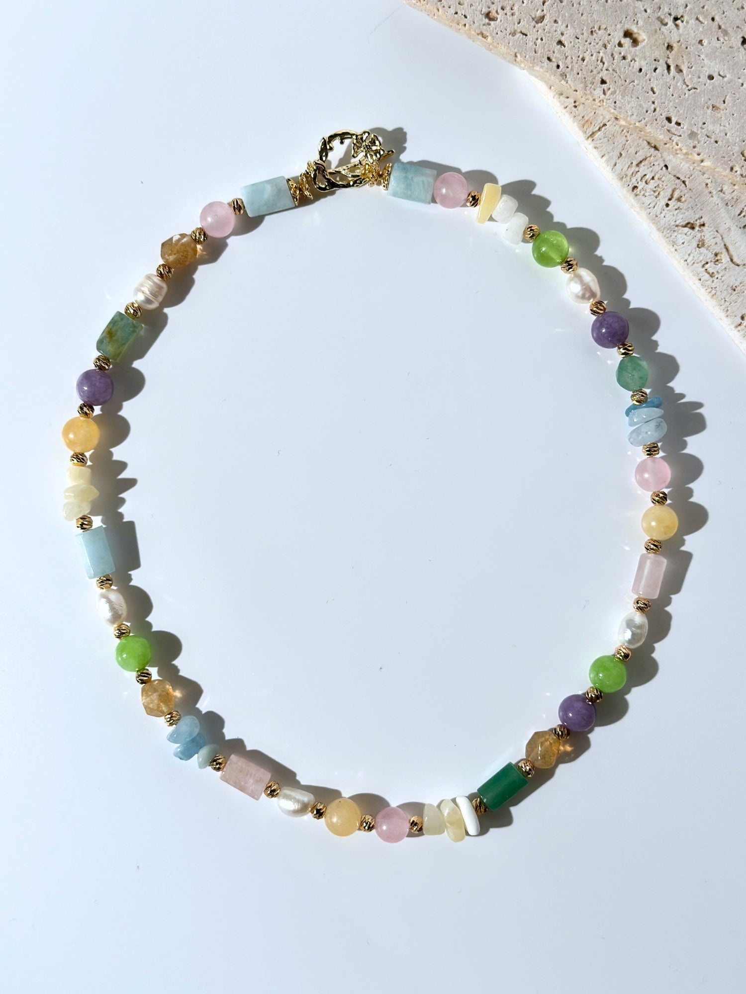 Bu 40 cm (16 inç) uzunluğundaki zarif kolye, özel kesim sitrin, akuamarin, aventurin, kalsedon, pembe kuvars ve tatlı su incilerinin doğal güzelliğini bir araya getirir. 14k gerçek altın kaplama detaylarla hazırlanmış olup hem dayanıklılığı hem de zarafeti bir arada sunar. Uzatma zincirli kanca kapama, güvenli ve ayarlanabilir bir kullanım sağlar. Yumuşak pastel tonları ve doğal taş dokusu, tasarıma sade ama sofistike bir hava katar. Hipoalerjenik ve kararma yapmayan yapısıyla uzun süreli konfor için idealdir.
