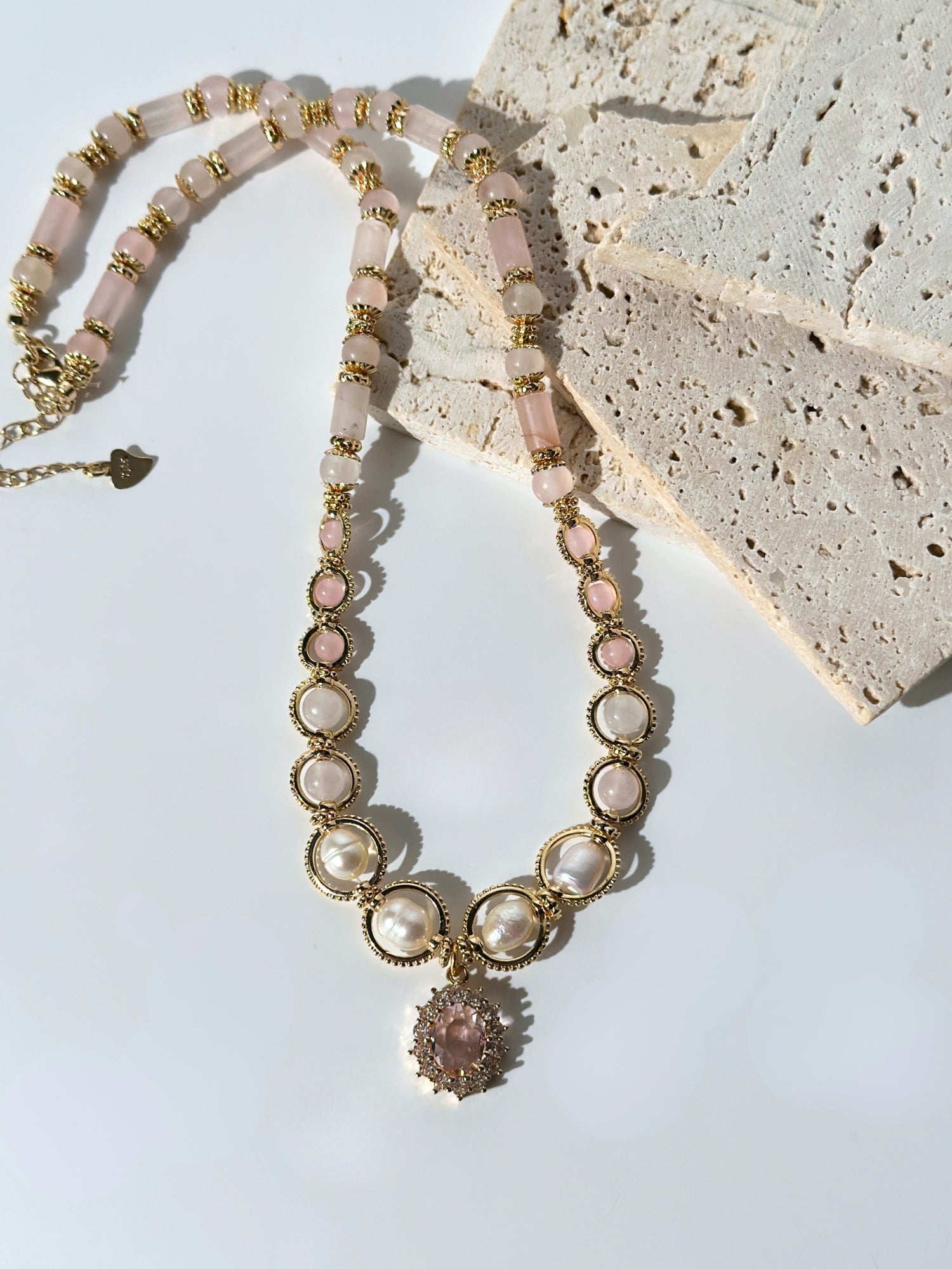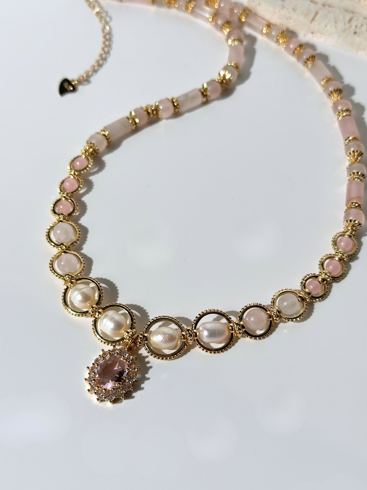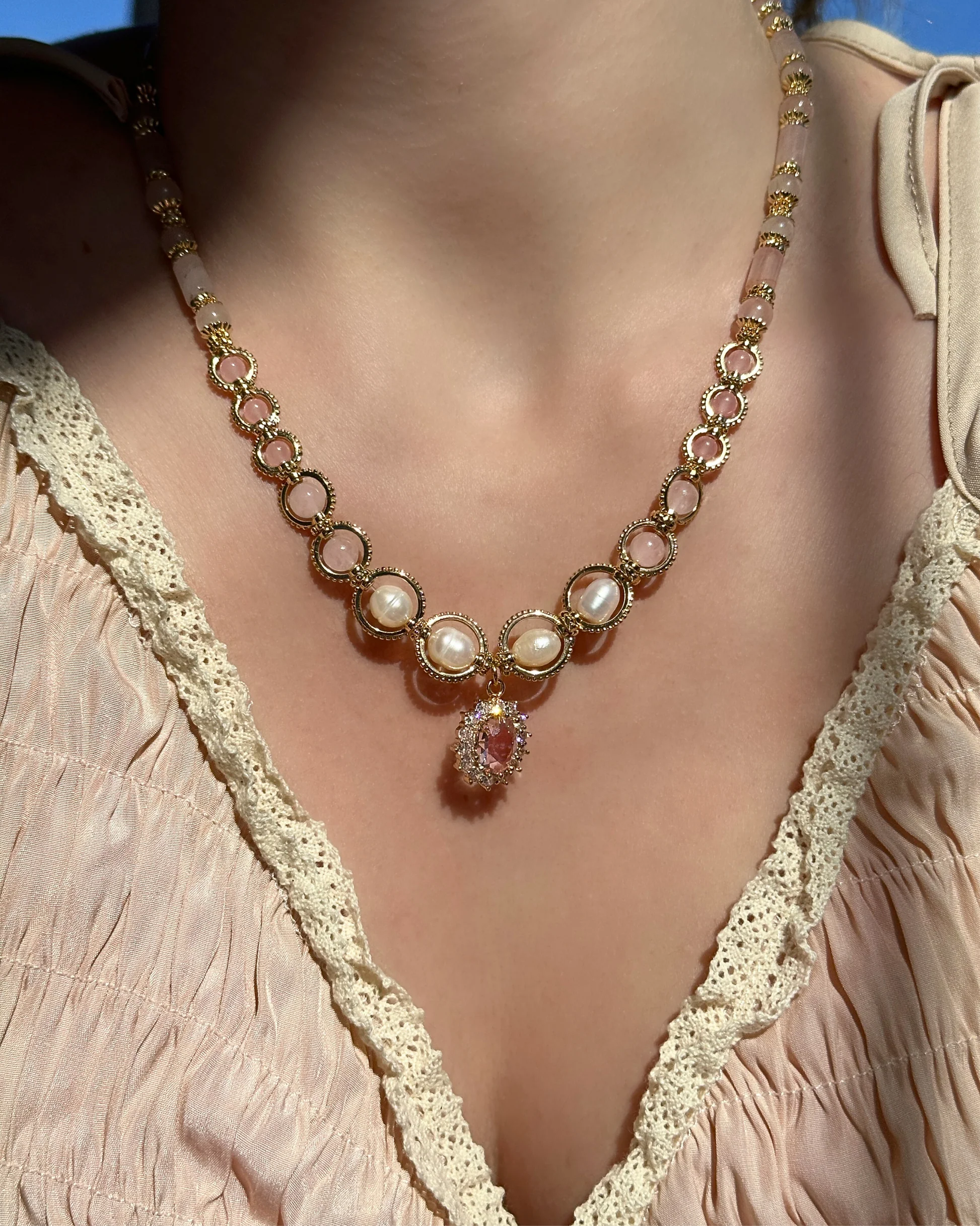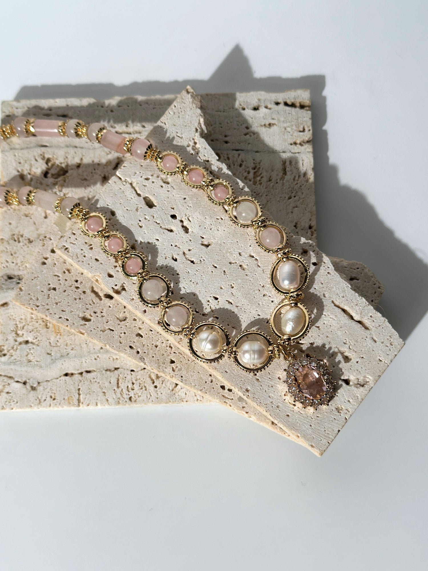 Rosalina, pembe kuvarsın yumuşak feminen enerjisini tatlı su incilerinin doğal ışıltısıyla bir araya getiren, vintage esintili göz alıcı bir tasarımdır.