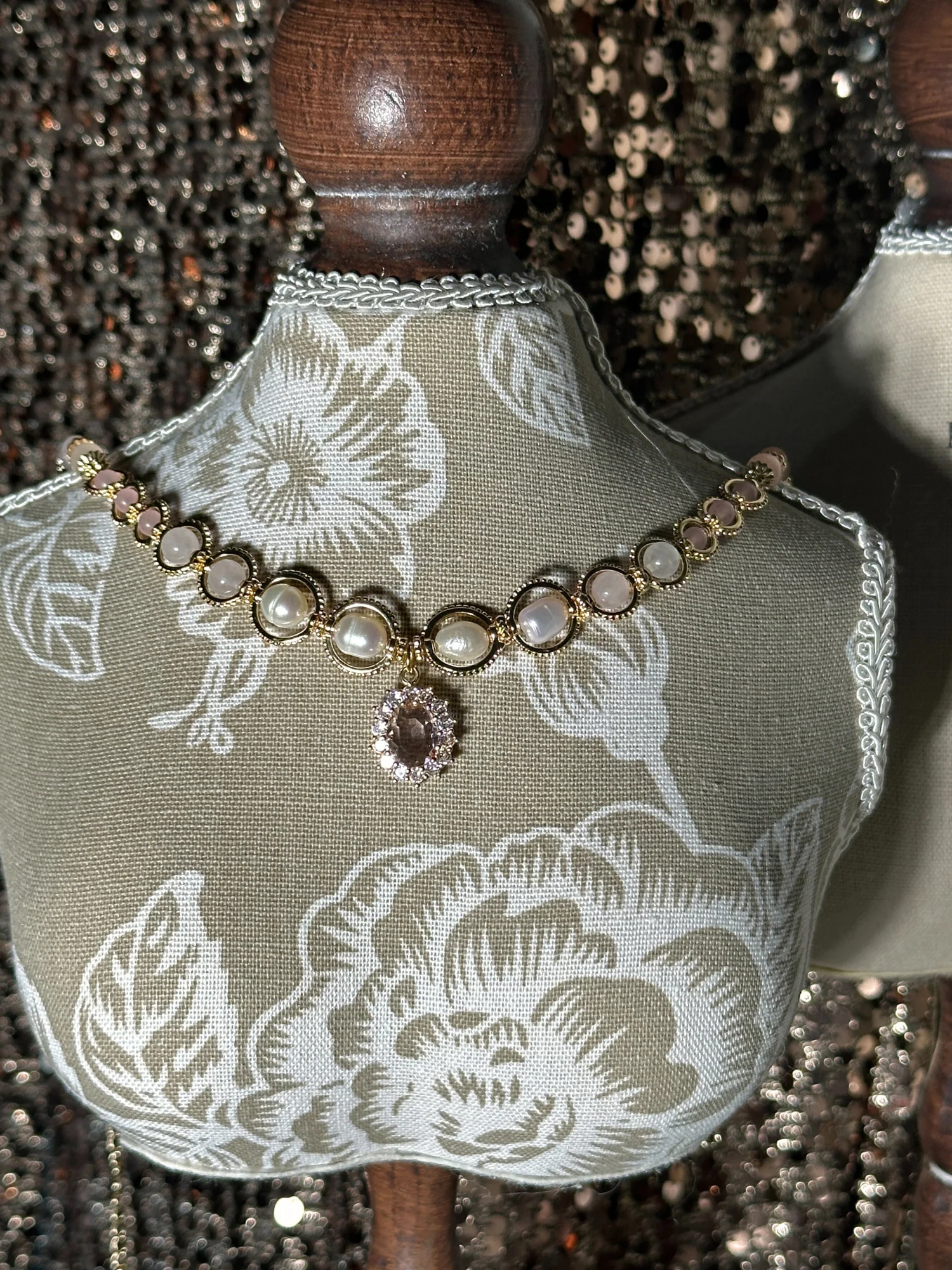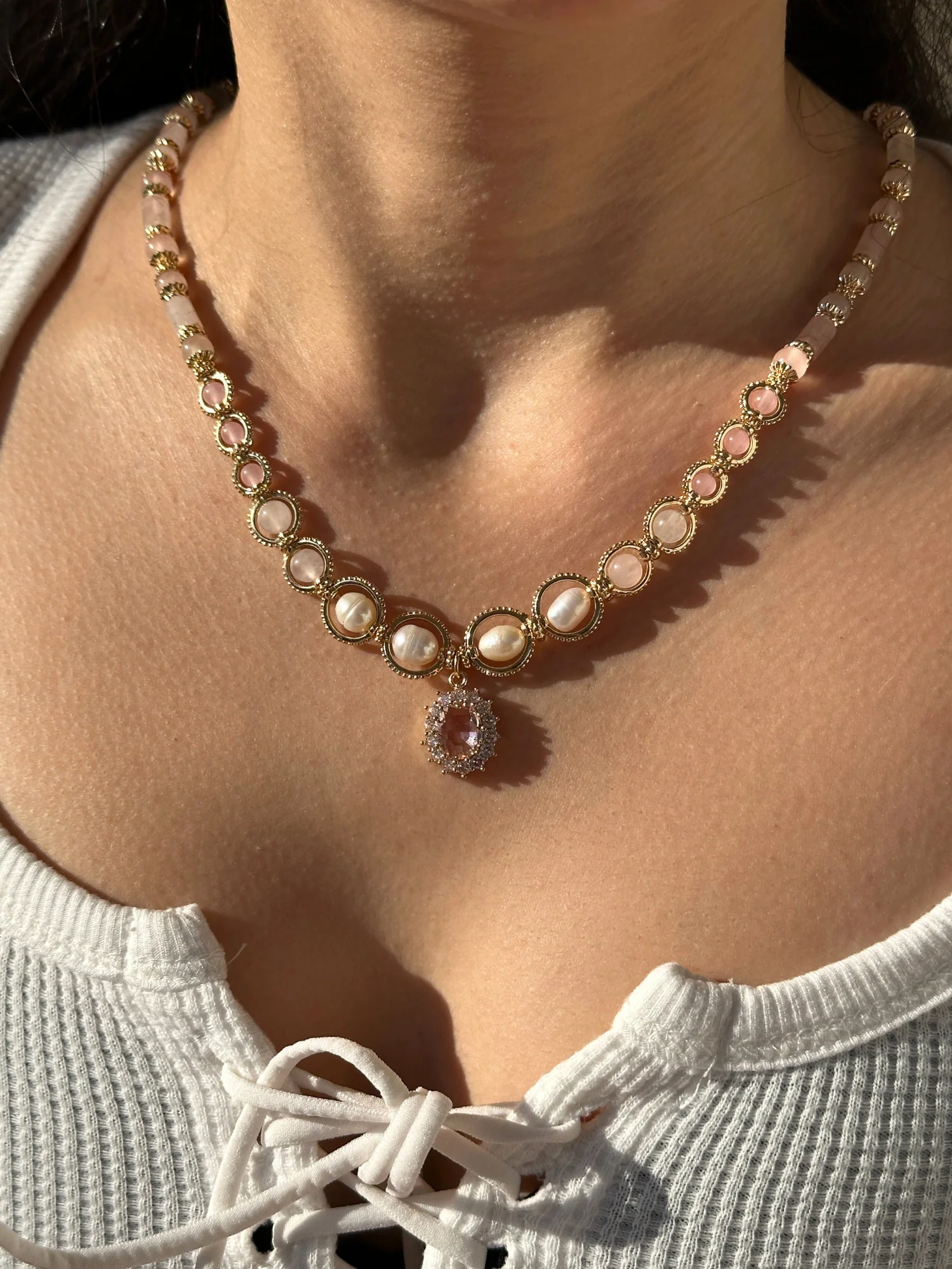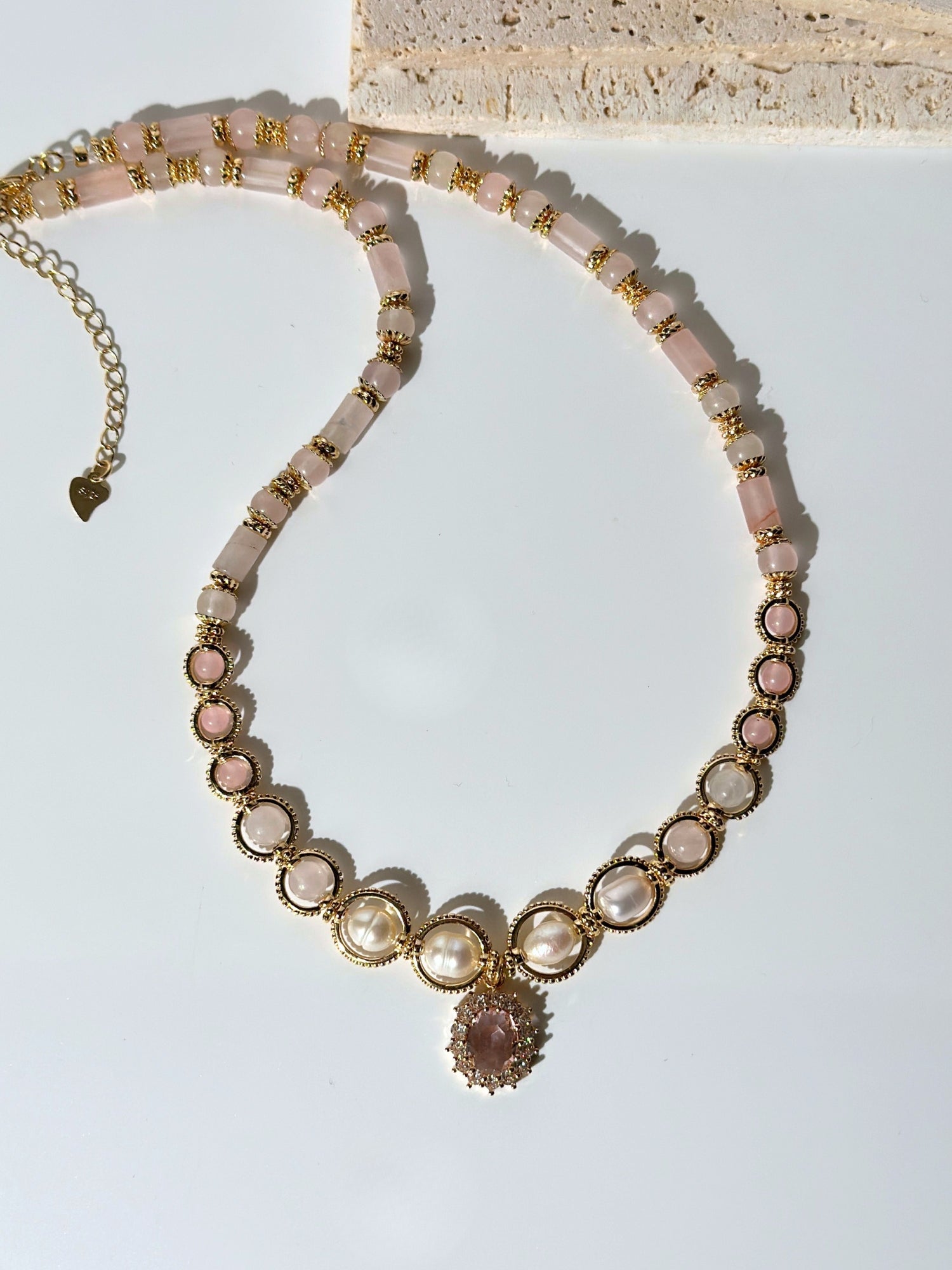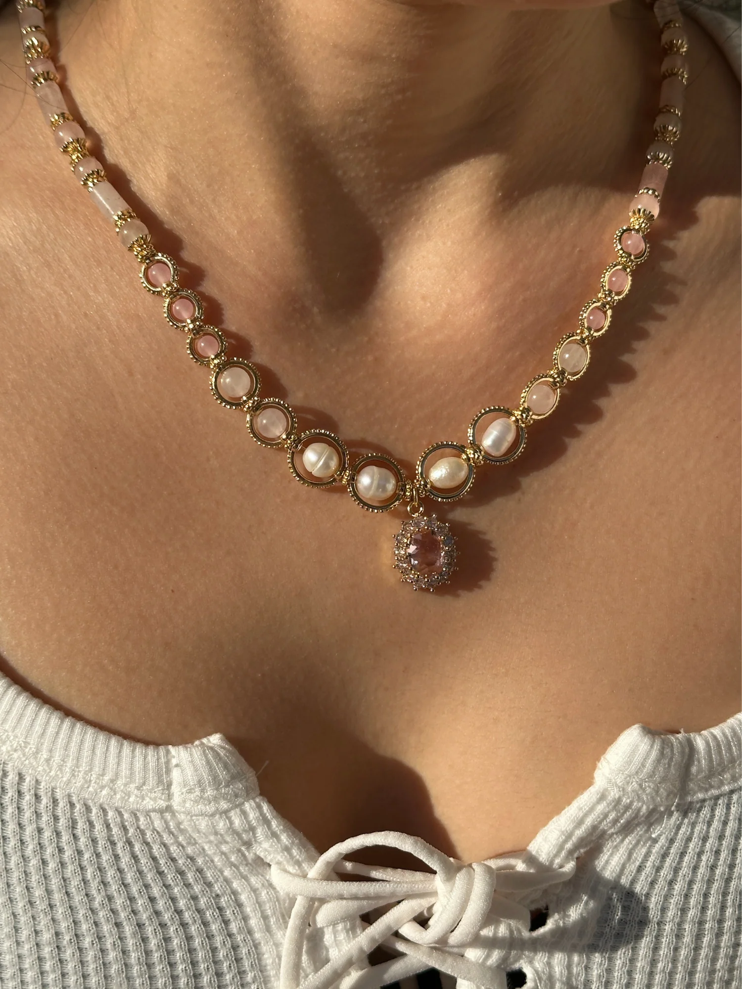 Rosalina, pembe kuvarsın yumuşak feminen enerjisini tatlı su incilerinin doğal ışıltısıyla bir araya getiren, vintage esintili göz alıcı bir tasarımdır.