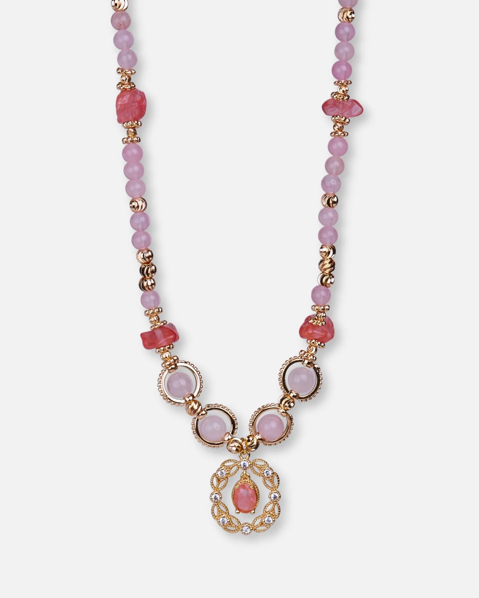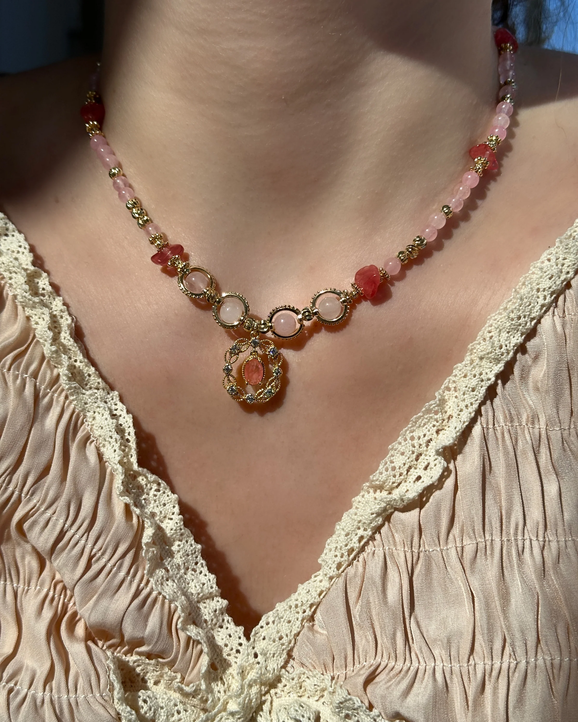 Zarif, feminen ve zamansız… Rose Vintage Çilek Kuvars Kolye, yumuşak tonlu 4 mm yuvarlak pembe kuvars taşları ile doğal dokulu düzensiz kesim çilek kuvarsları bir araya getirerek sıcak ve romantik bir uyum yaratır. Merkezdeki vintage zirkon taşlı charm, altın detaylarla çerçevelenmiş zarif bir dokunuş sunar.