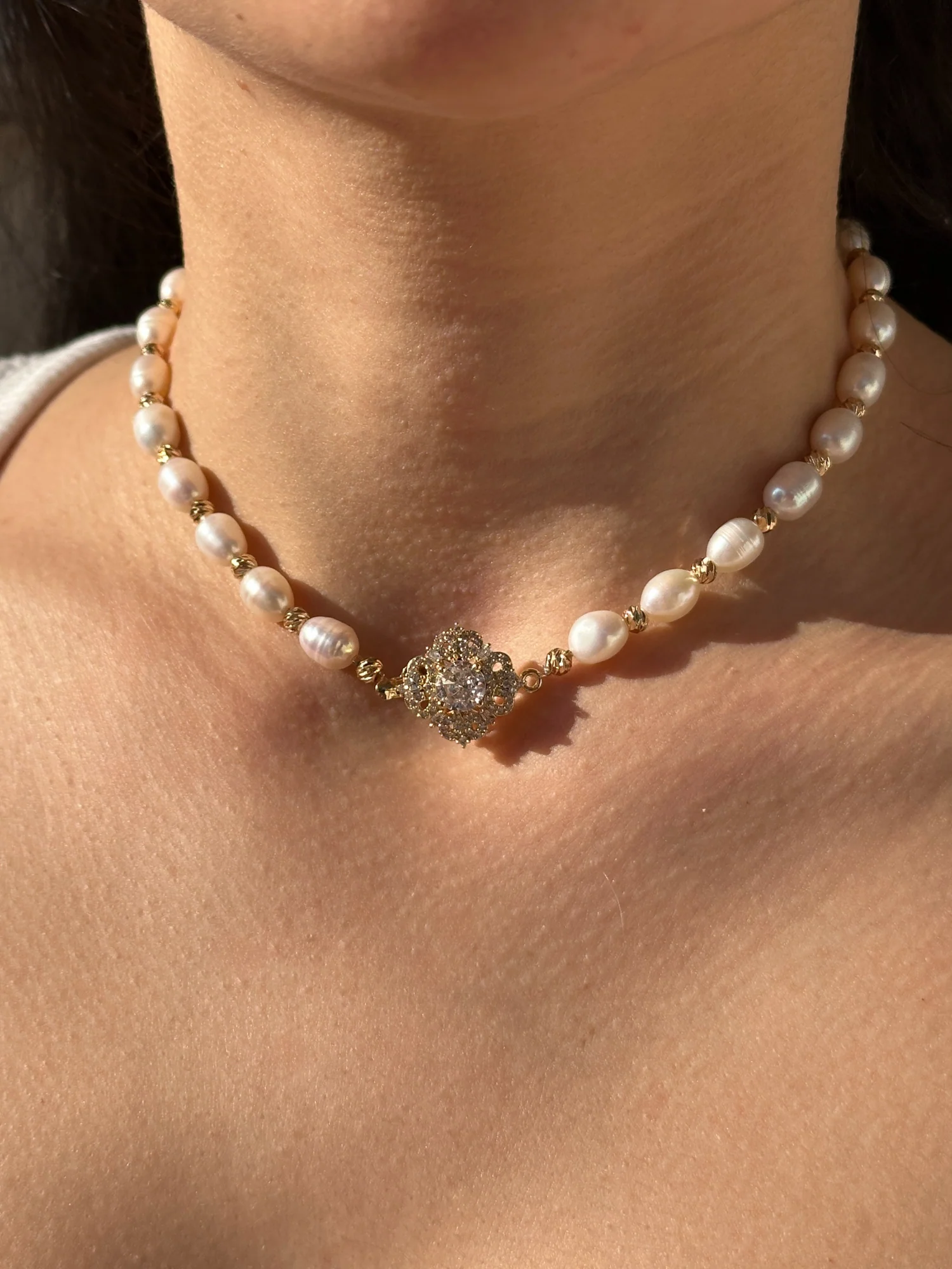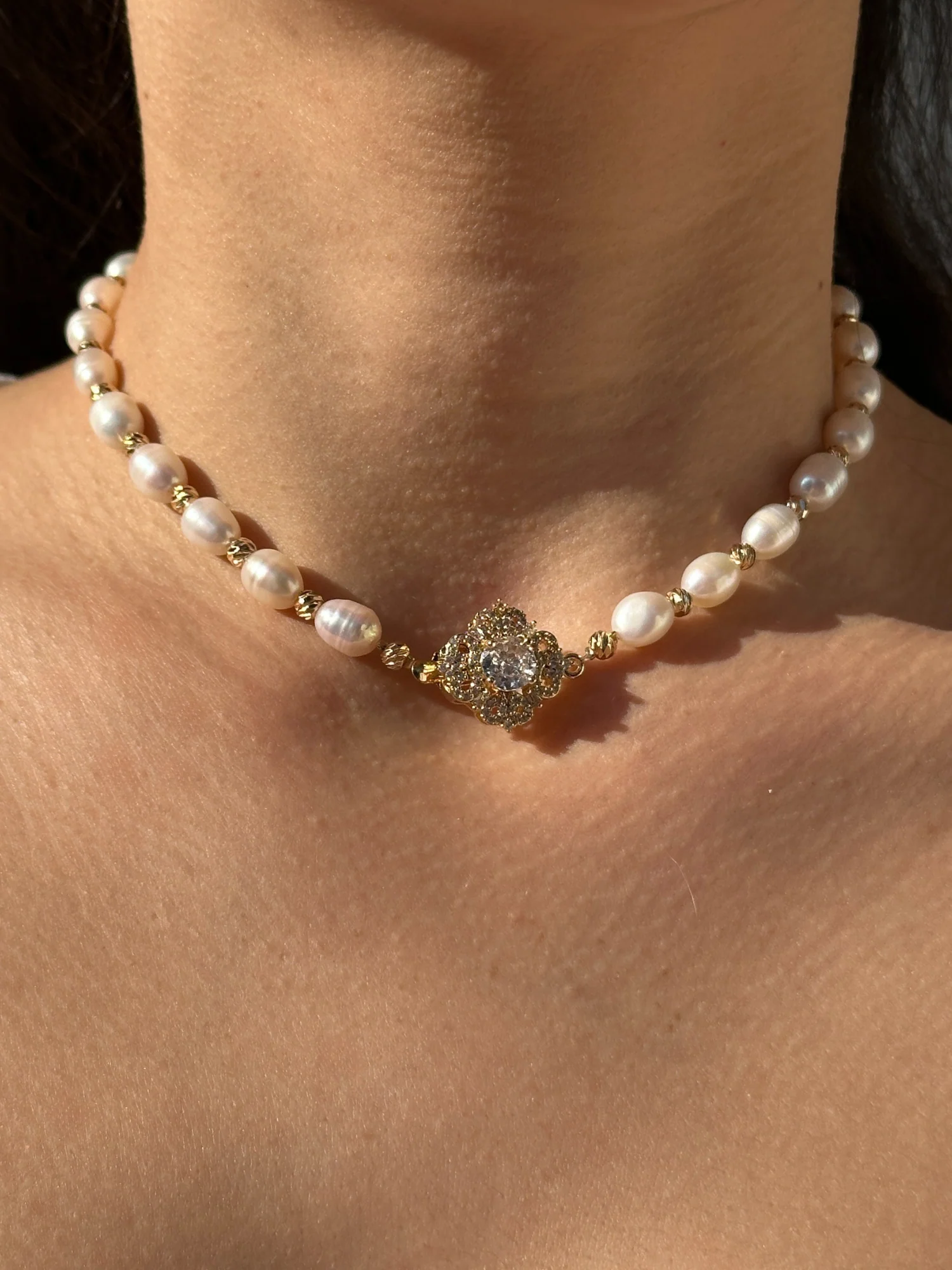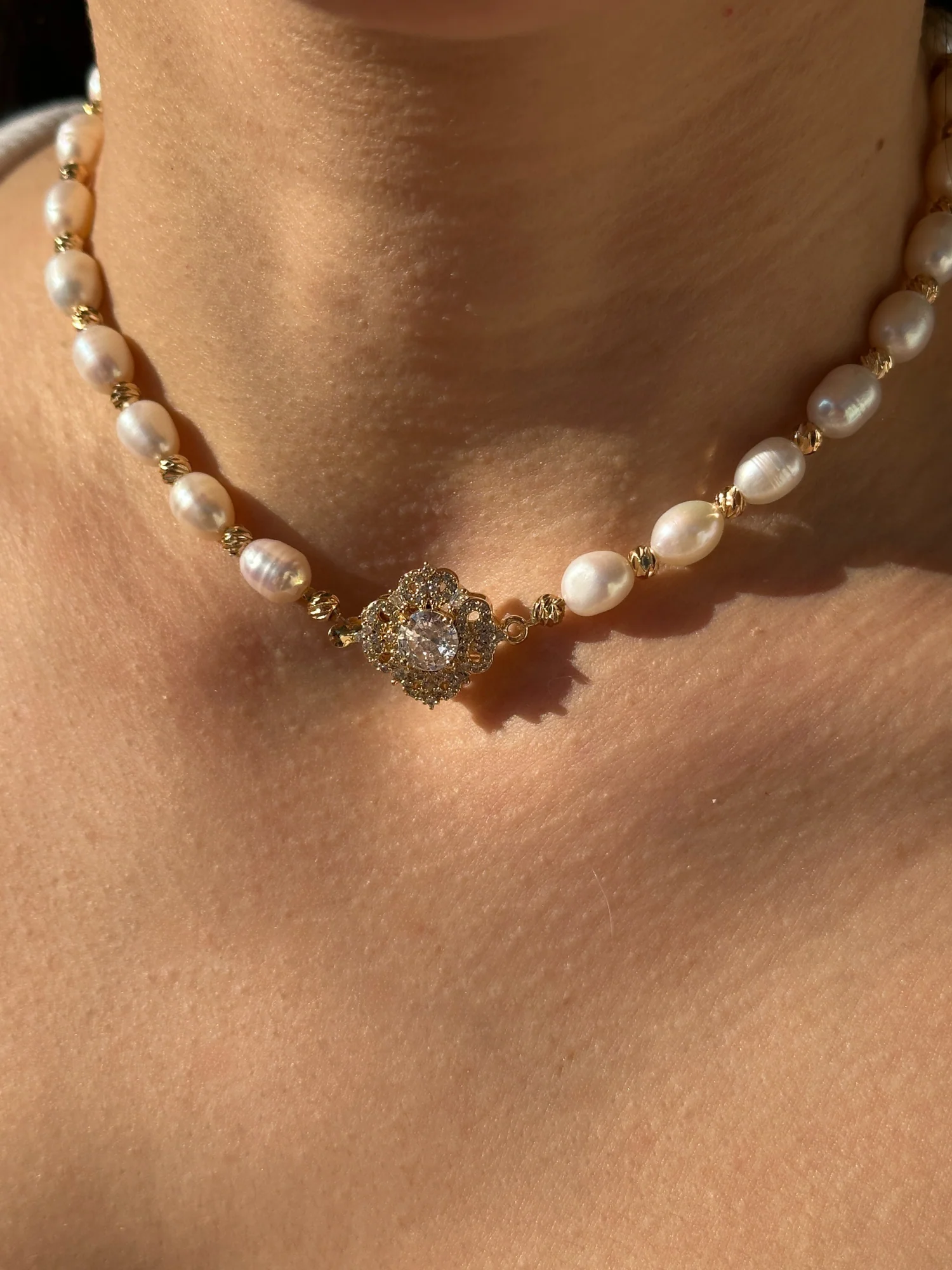 Solene Necklace, özenle seçilmiş tatlı su incilerinin yumuşak ışıltısını vintage esintili kristal merkez parçasıyla buluşturan büyüleyici bir tasarım. Özel anlar için yaratılan bu kolye; zarafeti, gücü ve asil güzelliği tek bir nefeste taşır.