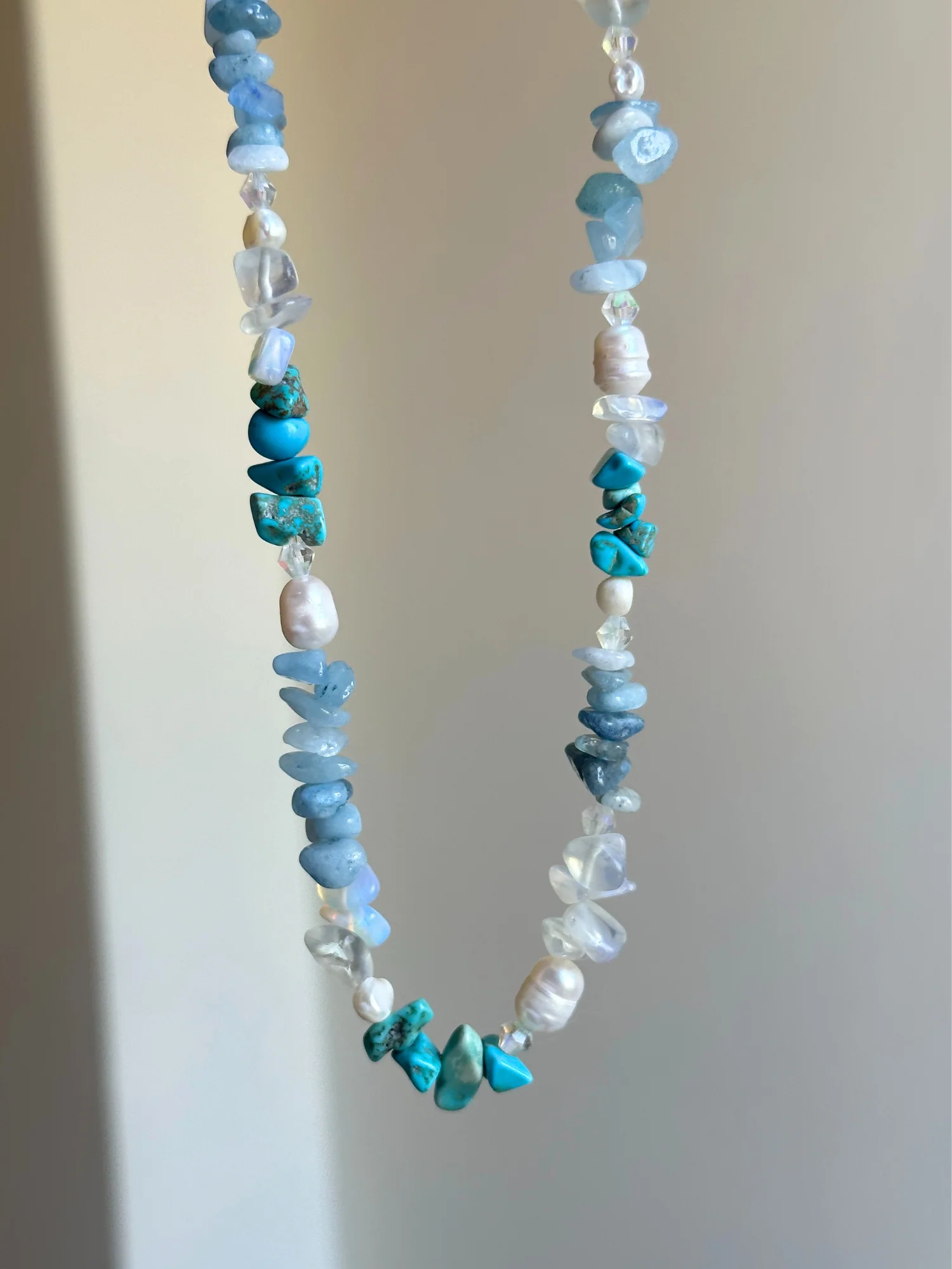 Thea kolye, huzur veren mavi tonlarıyla denizin dinginliğini ve doğal taşların asaletiyle el işçiliğinin sıcaklığını bir araya getirir. Düzensiz formdaki turkuaz taşlar, yumuşak mavi tonlarıyla öne çıkan akuamarin ve doğal parlaklığıyla zarafet katan tatlı su incileri, tasarımda uyumlu bir bütün oluşturur. 14k altın kaplama detaylarla zenginleştirilen bu özel parça, sofistike bir görünüm ve özgün bir karakter sunar — her takışta doğanın zarafetini taşır.
